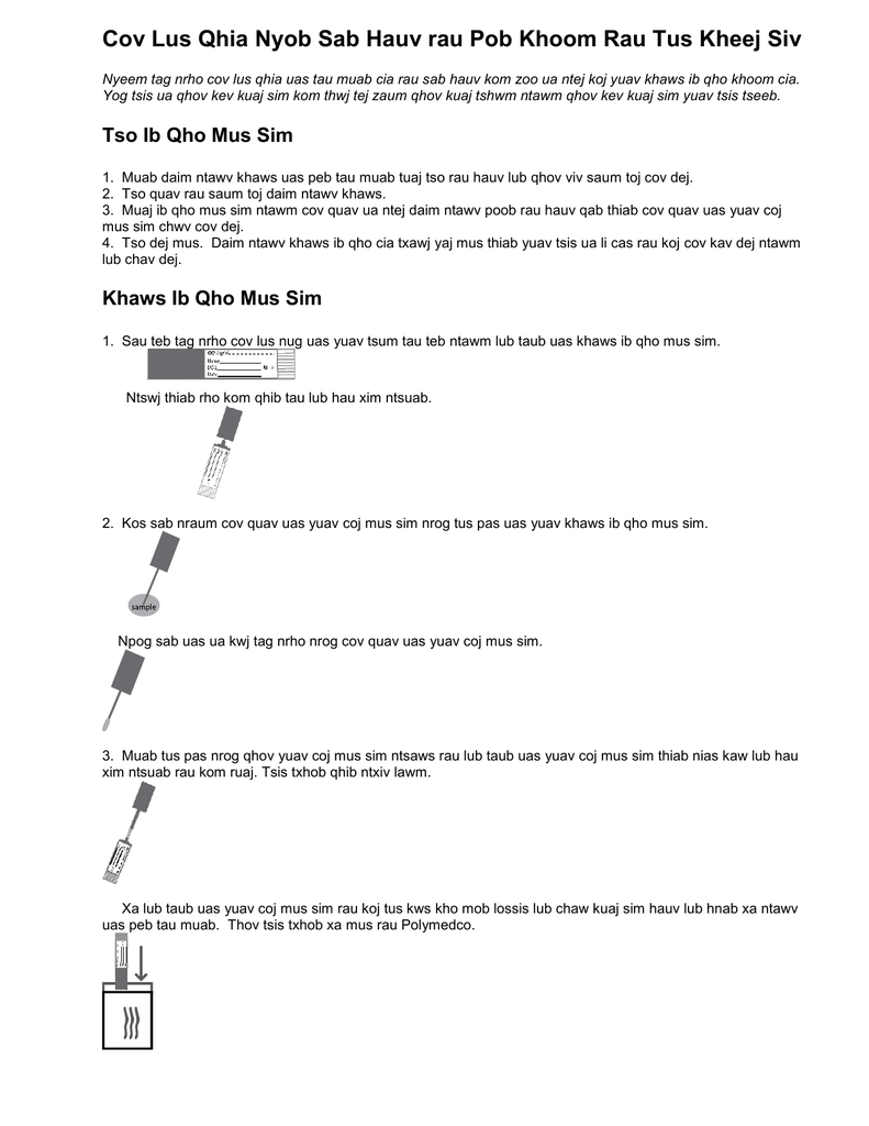 Cov Lus Qhia Nyob Sab Hauv rau Pob Khoom Rau Tus Kheej Siv Nyeem tag nrho cov lus qhia uas tau muab cia rau sab hauv kom zoo ua ntej koj yuav khaws ib qho khoom cia. Yog tsis ua qhov kev kuaj sim kom thwj tej zaum qhov kuaj tshwm ntawm qhov kev kuaj sim yuav tsis tseeb. Tso Ib Qho Mus Sim 1. Muab daim ntawv khaws uas peb tau muab tuaj tso rau hauv lub qhov viv saum toj cov dej. 2. Tso quav rau saum toj daim ntawv khaws. 3. Muaj ib qho mus sim ntawm cov quav ua ntej daim ntawv poob rau hauv qab thiab cov quav uas yuav coj mus sim chwv cov dej. 4. Tso dej mus. Daim ntawv khaws ib qho cia txawj yaj mus thiab yuav tsis ua li cas rau koj cov kav dej ntawm lub chav dej. Khaws Ib Qho Mus Sim 1. Sau teb tag nrho cov lus nug uas yuav tsum tau teb ntawm lub taub uas khaws ib qho mus sim. Ntswj thiab rho kom qhib tau lub hau xim ntsuab. 2. Kos sab nraum cov quav uas yuav coj mus sim nrog tus pas uas yuav khaws ib qho mus sim. Npog sab uas ua kwj tag nrho nrog cov quav uas yuav coj mus sim. 3. Muab tus pas nrog qhov yuav coj mus sim ntsaws rau lub taub uas yuav coj mus sim thiab nias kaw lub hau xim ntsuab rau kom ruaj. Tsis txhob qhib ntxiv lawm. Xa lub taub uas yuav coj mus sim rau koj tus kws kho mob lossis lub chaw kuaj sim hauv lub hnab xa ntawv uas peb tau muab. Thov tsis txhob xa mus rau Polymedco.