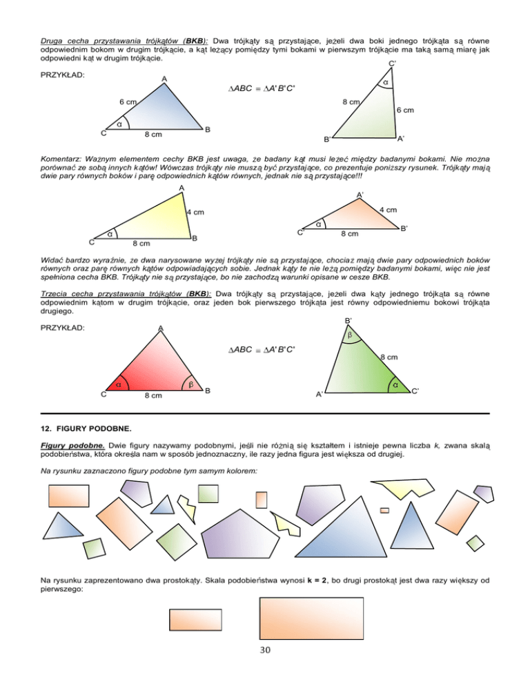 Druga cecha przystawania trójk tów (BKB): Dwa trójk ty s przystaj ce, je eli dwa boki jednego trójk ta s równe odpowiednim bokom w drugim trójk cie, a k t le cy pomi dzy tymi bokami w pierwszym trójk cie ma tak sam miar jak odpowiedni k t w drugim trójk cie. C’ PRZYKŁAD: A ABC A' B ' C ' 8 cm 6 cm 6 cm C B 8 cm A’ B’ Komentarz: Wa nym elementem cechy BKB jest uwaga, e badany k t musi le e mi dzy badanymi bokami. Nie mo na porówna ze sob innych k tów! Wówczas trójk ty nie musz by przystaj ce, co prezentuje poni szy rysunek. Trójk ty maj dwie pary równych boków i par odpowiednich k tów równych, jednak nie s przystaj ce!!! A A’ 4 cm 4 cm C 8 cm C’ B B’ 8 cm Wida bardzo wyra nie, e dwa narysowane wy ej trójk ty nie s przystaj ce, chocia maj dwie pary odpowiednich boków równych oraz par równych k tów odpowiadaj cych sobie. Jednak k ty te nie le pomi dzy badanymi bokami, wi c nie jest spełniona cecha BKB. Trójk ty nie s przystaj ce, bo nie zachodz warunki opisane w cesze BKB. Trzecia cecha przystawania trójk tów (BKB): Dwa trójk ty s przystaj ce, je eli dwa k ty jednego trójk ta s równe odpowiednim k tom w drugim trójk cie, oraz jeden bok pierwszego trójk ta jest równy odpowiedniemu bokowi trójk ta drugiego. B’ PRZYKŁAD: A ABC A' B ' C ' 8 cm C 8 cm B A’ C’ 12. FIGURY PODOBNE. Figury podobne. Dwie figury nazywamy podobnymi, je li nie ró ni si kształtem i istnieje pewna liczba k, zwana skal podobie stwa, która okre la nam w sposób jednoznaczny, ile razy jedna figura jest wi ksza od drugiej. Na rysunku zaznaczono figury podobne tym samym kolorem: Na rysunku zaprezentowano dwa prostok ty. Skala podobie stwa wynosi k = 2, bo drugi prostok t jest dwa razy wi kszy od pierwszego: Na rysunku zaprezentowano dwa trójk ty. Skala podobie stwa wynosi k = 3, bo drugi trójk t jest trzy razy wi kszy od pierwszego: Na rysunku zaprezentowano dwa pi ciok ty. Skala podobie stwa wynosi k = 1 , 2 bo drugi pi ciok t jest dwa razy mniejszy od pierwszego (jego wymiary stanowi połow wymiarów pierwszego pi ciok ta: Figury zawsze podobne. Istniej figury geometryczne, które zawsze s podobne, niezale nie od własno ci, np.: dwa kwadraty s zawsze podobne, dwa koła s zawsze podobne, dwa odcinki s zawsze podobne, dwa trójk ty równoboczne s zawsze podobne, dwa sze ciok ty foremne s zawsze podobne, dwa n – k ty foremne s zawsze podobne. Obliczanie skali podobie stwa: Aby obliczy skal podobie stwa nale y podzieli długo drug figur (np. długo boku, długo przek tnej , długo promienia itd…), przez długo figury. dowolnego odcinka zwi zanego z odpowiedniego odcinka pierwszej PRZYKŁAD. Na rysunku zaprezentowano dwa prostok ty podobne. Oblicz skal podobie stwa. D C A’ D’ 8 cm 6 cm B’ Aby obliczy skal , nale y znale C’ 12 cm A 4 cm B stosunek odpowiadaj cych sobie boków tych figur, np.: k A' B' AB 6 cm 4 cm 3 2 lub: k B' C ' BC 12 cm 8 cm 3 2 PRZYKŁAD. Na rysunku zaprezentowano dwa koła. Oblicz skal podobie stwa. d1 = 20 cm d2 = 8 cm Aby obliczy skal , nale y znale stosunek rednic tych kół: k d2 d1 8 cm 20 cm 2 5 Pola figur podobnych. Stosunek pól figur podobnych jest równy kwadratowi skali. Je li dwie figury s podobne do siebie w skali k, to stosunek ich pól 2 wynosi k . P1 Je li figury na rysunku s podobne w skali k, to stosunek ich pól wynosi: P2 P1 P2 k2 Zastosowanie poj cia podobie stwa: Poj cie podobie stwa ma zastosowanie w kartografii, czyli w dziale geografii zajmuj cym si tworzeniem map. Dzi ki podobie stwu tworzy si skal mapy. Ka da skala mapy okre la za pomoc ułamka, ile razy odległo ci zaznaczone na mapie s mniejsze od odległo ci prawdziwych mierzonych w terenie w skali rzeczywistej. Poniewa odległo ci na mapie s znacznie mniejsze od odległo ci rzeczywistych skala mapy jest przewa nie bardzo niewielkim ułamkiem, np.: 1 lub 1000000 1 500000 Na mapie zapisuje si ten ułamek za pomoc symbolu działania dzielenia: 1 : 1000000 lub 1 : 500000 Podobie stwo prostok tów: Cecha podobie stwa prostok tów: Dwa prostok ty s podobne, je eli stosunek ich boków jest taki sam. PRZYKŁAD. Sprawd , czy prostok ty o bokach długo ci 4 cm i 10 cm oraz 3 cm i 7,5 cm s podobne? 4 cm 3 cm 7,5 cm 10 cm Nie trzeba sprawdza istnienia skali podobie stwa. Zgodnie z cech podobie stwa wystarczy zbada stosunki boków ka dego z prostok tów. Prostok t pierwszy: 10 cm : 4 cm = 2,5, prostok t drugi: 7,5 cm : 3 cm = 2,5 Poniewa stosunki długo ci boków w obu prostok tach s równe, to prostok ty s podobne. Podobie stwo trójk tów: Cecha podobie stwa trójk tów (KKK): Dwa trójk ty s podobne, je eli jeden z nich ma takie same k ty wewn trzne jak drugi. 80° 63° 37° 63° 80° 37° Trójk ty na rysunku s podobne, bo – zgodnie z cech KKK – maj takie same k ty. 13. TWIERDZENIE TALESA. k B l b A a l II k O c A’ d B’ Twierdzenie Talesa (wersja 1): Je li ramiona k ta przetniemy dwoma prostymi równoległymi, to stosunki odpowiadaj cych sobie odcinków na obu ramionach k ta s równe. Np.: OA AB OA' A' B' lub OA OB OA' OB ' lub AB OB A' B ' OB ' Przy innych oznaczeniach (gdy mamy podane długo ci odcinków pod postaci liter): a c b d a c lub a c b d b d lub a c b d Twierdzenie Talesa (wersja 2): Je li ramiona k ta przetniemy dwoma prostymi równoległymi, to stosunek dowolnych odcinków powstałych na jednym z ramion k ta jest równy stosunkowi odpowiadaj cych im odcinków drugiego ramienia. Np.: OA OA' AB A' B' lub OA OA' OB OB ' lub AB A' B' OB OB ' Przy innych oznaczeniach (gdy mamy podane długo ci odcinków pod postaci liter): a b c d a lub a c b c b lub d a d b c d Twierdzenie Talesa (wersja rozszerzona): Mo na poszerzy twierdzenie Talesa do bardziej ogólnej sytuacji: Je li dwie proste przecinaj ce si przetniemy prostymi równoległymi, to stosunek dowolnych dwóch odpowiadaj cych sobie odcinków powstałych na prostych przecinaj cych si jest stały. Komentarz: w wersji rozszerzonej zamiast ramion k ta przecinamy par prostych nierównoległych (czyli ra