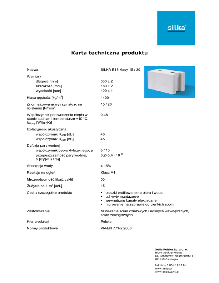 Karta techniczna produktu Nazwa SILKA E18 klasy 15 / 20 Wymiary długość [mm] szerokość [mm] wysokość [mm] 333 ± 2 180 ± 2 199 ± 1 Klasa gęstości [kg/m3] 1400 Znormalizowana wytrzymałość na ściskanie [N/mm2] 15 / 20 Współczynnik przewodzenia ciepła w stanie suchym i temperaturze +10 ºC, λ10,dry [W/(m·K)] 0,46 Izolacyjność akustyczna współczynnik RA1R [dB] współczynnik RA2R [dB] 48 45 Dyfuzja pary wodnej współczynnik oporu dyfuzyjnego, µ przepuszczalność pary wodnej, δ [kg/(m·s·Pa)] 5 / 10 0,2÷0,4 · 10-10 Absorpcja wody ≤ 16% Reakcja na ogień Klasa A1 Mrozoodporność [ilość cykli] 50 Zużycie na 1 m2 [szt.] 15 Cechy szczególne produktu Zastosowanie Murowanie ścian działowych i nośnych wewnętrznych, ścian zewnętrznych Kraj produkcji Polska Normy produktowe PN-EN 771-2:2006 bloczki profilowane na pióro i wpust uchwyty montażowe wewnętrzne kanały elektryczne murowanie na zaprawie do cienkich spoin Xella Polska Sp. z o. o. Biuro Obsługi Klienta Ul. Bohaterów Westerplatte 1 07-410 Ostrołęka Infolinia 0 801 122 224 www.xella.pl www.budowane.pl