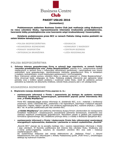 PAKIET USŁUG 2016 (komentarz) Podstawowym zadaniem Business Centre Club jest realizacja usług klubowych na rzecz członków Klubu, reprezentowanie interesów środowiska przedsiębiorców, tworzenie lobby przedsiębiorców oraz tworzenie więzi środowiskowej i towarzyskiej. Działania podejmowane przez BCC w ramach Pakietu Usług można podzielić na osiem bloków tematycznych: POLISA BEZPIECZEŃSTWA EDUKACJA KOJARZENIA BIZNESOWE KONKURSY I NAGRODY PORADY EKSPERTÓW CENTRUM BIZNESU INTEGRACJA BRANŻOWA LOŻA REGIONALNA POLISA BEZPIECZEŃSTWA 1. Ochrona interesu gospodarczego Firmy w sytuacji jego zagrożenia, w ramach funkcji rzecznika przedsiębiorców oraz „Polisy Bezpieczeństwa” poprzez m.in.: podejmowanie działań mediacyjnych w sporach firmy z instytucjami administracji państwowej i samorządowej oraz innymi podmiotami życia gospodarczego, reprezentowanie interesów gospodarczych firmy w kontaktach z mediami, kontrahentami, innymi instytucjami państwowymi i Unii Europejskiej. Biuro Interwencji udziela pomocy członkom Klubu w zakresie opisanym w „Polisie Bezpieczeństwa”, którą otrzymuje każdy wstępujący do Klubu. Podstawą podjęcia interwencji jest zgłoszenie takiej potrzeby wraz z krótkim opisem problemu i oczekiwań wobec Klubu. Jeżeli do udzielenia pomocy potrzebne są materiały lub dokumenty źródłowe, członek Klubu proszony jest o ich udostępnienie. KOJARZENIA BIZNESOWE 2. Wspieranie rozwoju działalności Firmy poprzez m. in.: zamieszczenie informacji o Firmie i zapewnienie jej dostępu do systemu wymiany informacji handlowych, kooperacyjnych, partnerskich poprzez portal internetowy BCC oraz „e-Giełdę Współpracy” Portal BCC www.bcc.org.pl zawiera informacje nt. działalności BCC, m.in.: materiały z konferencji prasowych, opinie i stanowiska BCC, wiadomości z lóż regionalnych, informacje o kolejnych edycjach konkursów i nagród, relacje z gal BCC oraz strukturę organizacyjną BCC, wybrane artykuły z „Gazety BCC” itd. W portalu publikowana jest lista członków BCC. „e-Giełda Współpracy” jest platformą internetową służącą firmom członkowskim do nawiązywania kontaktów handlowych i kooperacyjnych, poszukiwania partnerów biznesowych, inwestorów oraz realizacji wspólnych przedsięwzięć gospodarczych. Warunkiem udziału w giełdzie jest wypełnienie formularza zgłoszeniowego. BCC dodatkowo promuje oferty z e-Giełdy w Biuletynie Specjalnym BCC. zamieszczenie informacji o Firmie i dostarczenie Firmie listy referencyjnej zawierającej wiarygodnych wykonawców, dostawców i partnerów w ramach wydawnictwa „Rocznik” „Rocznik BCC” ukazuje się na początku każdego roku i zawiera najważniejsze informacje o Klubie i jego członkach. W Roczniku publikowana jest imienna lista członków Klubu. Wydawany jest w wersji polsko-angielskiej, wysyłany do wszystkich członków BCC oraz osób i instytucji współpracujących z BCC. Do wydawnictwa dołączona jest wersja elektroniczna pt. „Najlepsze Firmy”, z danymi teleadresowymi firm oraz informacjami z Ankiety Podstawowej (punkt „Profil firmy”), umożliwiająca selekcję wg wybranych kryteriów. udostępnianie Firmie informacji o specjalistach w ramach „Giełdy Fachowców BCC” Giełda Fachowców BCC zawiera oferty członków Klubu, którzy poszukują nowego miejsca zatrudnienia oraz informacje o wakatach na wyższych stanowiskach menedżerskich w firmach członkowskich. Oferty publikowane są w portalu BCC oraz dystrybuowane za pośrednictwem poczty elektronicznej, do wszystkich firm członkowskich. wystawienie „Dyplomu-Rekomendacji” dla Firmy i listów polecających Na początku okresu członkowskiego i przy jego odnawianiu, każda firma otrzymuje z BCC „DyplomRekomendację” potwierdzający wiarygodność firmy oraz przestrzeganie przez jej reprezentantów zasad etyki kupieckiej i Kodeksu Honorowego Członka BCC. „Dyplom-Rekomendacja” jest swoistym listem referencyjnym wystawionym firmie członkowskiej i może być wykorzystywany w działaniach marketingowych. Na wniosek firmy, BCC wystawi do wskazanych osób i instytucji listy polecające lub celową rekomendację potwierdzającą członkostwo w BCC i wiarygodność firmy. organizowanie spotkań z przedsiębiorcami krajowymi i zagranicznymi BCC organizuje lub współorganizuje różnego rodzaju imprezy kojarzeniowe z polskimi i zagranicznymi firmami. Są to zwykle spotkania w ramach misji handlowych lub grup przedsiębiorców przyjeżdżających do Polski. Przy organizacji tych spotkań, BCC współpracuje z podobnymi, zagranicznymi organizacjami gospodarczymi, przedstawicielstwami handlowymi oraz z polskimi i zagranicznymi ambasadami. Firmy powiadamiane są o przewidywanych spotkaniach, ich terminach i charakterze w „Biuletynie Specjalnym BCC” lub w bezpośredniej korespondencji. zamieszczenie informacji o specjalnej ofercie Firmy w ramach „Systemu Rabatów BCC” i zapewnienie Firmie dostępu do systemu, na zasadach regulaminowych System Rabatów BCC umożliwia firmom członkowskim zakup towarów lub korzystanie z usług na preferencyjnych warunkach. Oferty rabatowe publikowane są w wydawnictwach BCC i w portalu BCC. Do udzielania rabatów oraz korzystania z nich mają prawo wyłącznie członkowie BCC. Warunkiem zamieszczenia oferty firmy w „Systemie Rabatów BCC” jest przesłanie do BCC wypełnionej Ankiety-Zgłoszenia zawierającej informacje o wysokości udzielanego rabatu i trybie korzystania z usług lub preferencyjnych warunkach zakupu towarów. PORADY EKSPERTÓW 3. Organizowanie porad i konsultacji dla Firmy m. in. w zakresie: bezpieczeństwa osobistego i biznesu w obszarze zagrożeń w procesach gospodarczych (NOWOŚĆ), bezpieczeństwa środowiska teleinformatycznego (NOWOŚĆ), finansowania inwestycji, funduszy unijnych na lata 2014-2020, ochrony danych osobowych (NOWOŚĆ), odpowiedzialności społecznej biznesu (CSR) (NOWOŚĆ), prawa gospodarczego i podatkowego –