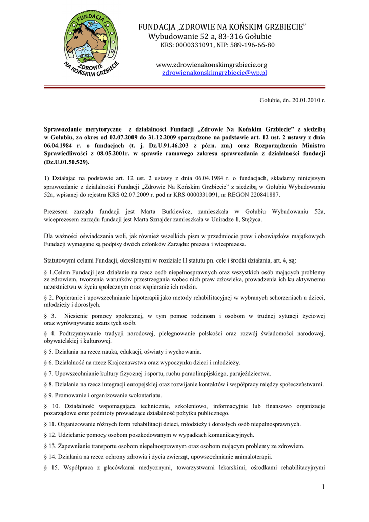 Sprawozdanie z działalności Fundacji z dnia 20.01.2010 r.