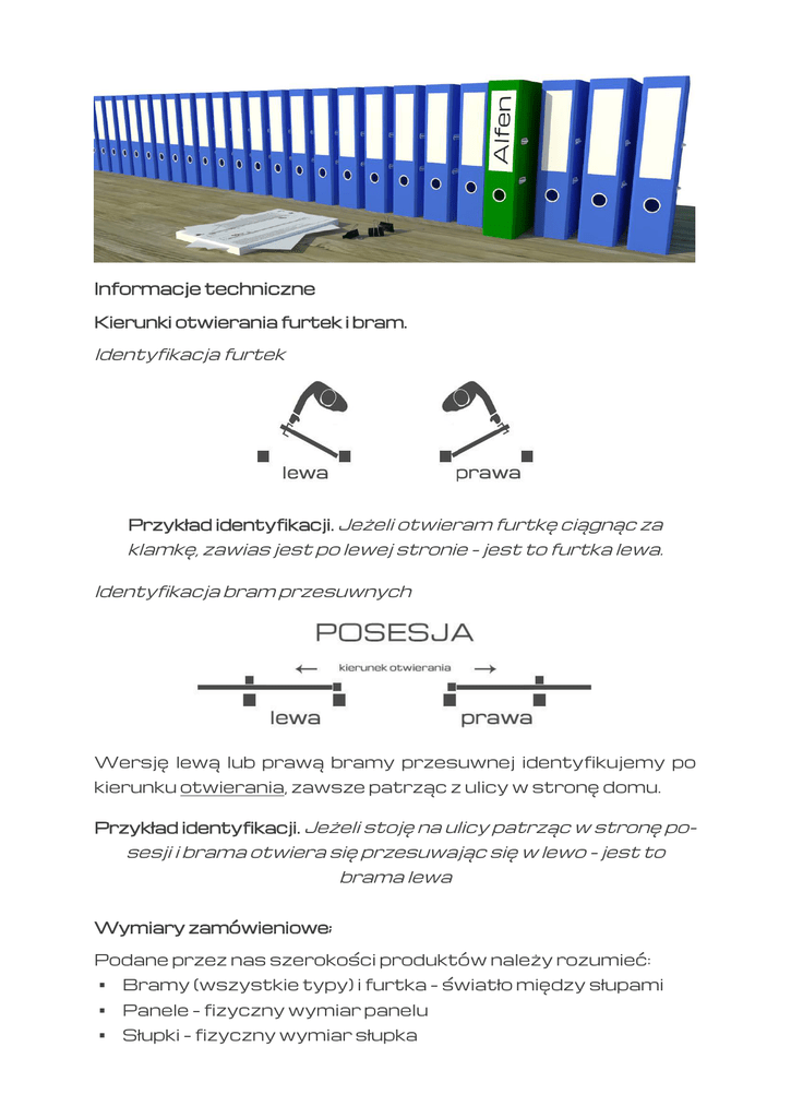 Informacje techniczne Kierunki otwierania furtek i bram. Identyfikacja furtek Przykład identyfikacji. Jeżeli otwieram furtkę ciągnąc za klamkę, zawias jest po lewej stronie – jest to furtka lewa. Identyfikacja bram przesuwnych Wersję lewą lub prawą bramy przesuwnej identyfikujemy po kierunku otwierania, zawsze patrząc z ulicy w stronę domu. Przykład identyfikacji. Jeżeli stoję na ulicy patrząc w stronę po- sesji i brama otwiera się przesuwając się w lewo – jest to brama lewa Wymiary zamówieniowe; Podane przez nas szerokości produktów należy rozumieć: Bramy (wszystkie typy) i furtka – światło między słupami Panele – fizyczny wymiar panelu Słupki – fizyczny wymiar słupka Niezwykle ważnymi elementami każdego ogrodzenia są wytrzymałe zawiasy, solidna listwa przymykowa oraz uniwersalny łącznik do paneli. Dzięki naszym innowacyjnym rozwiązaniom, zadbaliśmy o to, aby nasze ogrodzenia wyposażone były we wszystkie te elementy. Listwa przymykowa ALFEN [PATENT ZGŁOSZONY] Wersja z klamką Wersja z elektrozaczepem (manualna) (domofon) furtka lewa furtka prawa furtka lewa furtka prawa Nasza listwa przymykowa do furtek, jest jedynym tego typu rozwiązaniem na rynku ogrodzeń. Niezależnie od typu zamówionej furtki, zawsze otrzymasz ten sam zestaw. Przez odpowiednie przykręcenie szyldu (patrz rysunek – jasny element), uzyskasz listwę odpowiednią do Twojej furtki. Przez obrócenie szyldu, możesz łatwo zmienić furtkę z otwieranej ręcznie w furtkę z elektrozaczepem, sterowaną domofonem. Listwa wyposażona jest w zaślepkę i gumową uszczelkę, która gwarantuje cichą, komfortową pracę oraz uniemożliwia „obijanie” furtki podczas zamykania. Standardowo furtka wyposażona jest w krótką listwę, na życzenie wykonamy listwę o długości równej wysokości furtki. Listwa (profil aluminiowy) zawsze lakierowana jest w kolorze ogrodzenia. Szyld (stal) jest cynkowany galwanicznie. Łącznik ALFEN 1. [PATENT ZGŁOSZONY] 2. 3. 4. Łącznik do paneli jest uniwersalnym rozwiązaniem przy pomocy, którego zamontujesz panel zarówno do słupka aluminiowego jak i do słupka murowanego. Oś przykręcenia łącznika do słupka wypada 20mm poniżej górnej krawędzi belki poprzecznej panelu. Zawias ALFEN [PATENT ZGŁOSZONY] Kolejnym niespotykanym dotąd na rynku ogrodzeń rozwiązaniem jest nasz zawias. Umożliwia on cichą, precyzyjną oraz bezawaryjną pracę przez długie lata. Bezgłośną pracę gwarantuje zastosowanie nylonowego łożyska. Zawias umożliwia regulację 10mm, co daje 20mm tolerancji dla furtki, a dla bramy aż 40mm.