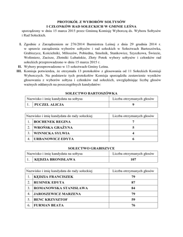 PROTOKÓŁ Z WYBORÓW SOŁTYSÓW I CZŁONKÓW RAD SOŁECKICH W GMINIE LEŚNA sporządzony w dniu 15 marca 2015 przez Gminną Komisję Wyborczą ds. Wyboru Sołtysów i Rad Sołeckich. I. Zgodnie z Zarządzeniem nr 276/2014 Burmistrza Leśnej z dnia 29 grudnia 2014 r. w sprawie zarządzenia wyborów sołtysów i rad sołeckich w Sołectwach Bartoszówka, Grabiszyce, Kościelniki, Miłoszów, Pobiedna, Smolnik, Stankowice, Szyszkowa, Świecie, Wolimierz, Zacisze, Złotniki Lubańskie, Złoty Potok wybory sołtysów i członków rad sołeckich przeprowadzono w dniu 15 marca 2015 r. II. Wybory przeprowadzono w 13 sołectwach Gminy Leśna. III. Komisja potwierdza, że otrzymała 13 protokołów z głosowania od 11 Sołeckich Komisji Wyborczych. Na podstawie tych protokołów Komisja sporządziła zestawienie wyników głosowania z wyborów sołtysa i członków rad sołeckich, uwzględniając liczbę głosów ważnych oddanych na poszczególnych kandydatów: SOŁECTWO BARTOSZÓWKA Nazwisko i imię kandydata na sołtysa 1. Liczba otrzymanych głosów PUCZEL ALICJA 9 Nazwisko i imię kandydata do rady sołeckiej Liczba otrzymanych głosów 1. BOCHENEK REGINA 7 2. WROŃSKA GRAŻYNA 5 3. WINNICKA SYLWIA 4 4. URBANOWICZ EDYTA 6 SOŁECTWO GRABISZYCE Nazwisko i imię kandydata na sołtysa Liczba otrzymanych głosów KĘDZIA BRONISŁAWA 107 1. Nazwisko i imię kandydata do rady sołeckiej Liczba otrzymanych głosów 1. KĘDZIA FRANCISZEK 79 2. RUSINEK EDYTA 87 3. ROMANOWSKA STANISŁAWA 84 4. JAROSZEWICZ MARZENA 79 5. BENC KRZYSZTOF 59 6. FURMAN BEATA 76 SOŁECTWO KOŚCIELNIKI Nazwisko i imię kandydata na sołtysa Liczba otrzymanych głosów 1. BOCZULA ELŻBIETA 76 2. SZULC LECH 79 Nazwisko i imię kandydata do rady sołeckiej Liczba otrzymanych głosów 1. WISZNIEWSKA ANNA 97 2. SZULC ANNA 49 3. ŻUKROWSKI ZBIGNIEW 38 4. SKRZYŃSKI TADEUSZ 26 5. GORAJEC ROBERT 80 6. GARGAŚ MARZENA 73 SOŁECTWO MIŁOSZÓW Nazwisko i imię kandydata na sołtysa Liczba otrzymanych głosów 1. SMUSZ ANITA 19 2. SIKORSKA MARZENA 65 Nazwisko i imię kandydata do rady sołeckiej Liczba otrzymanych głosów 1. KOŁODZIEJCZYK MIROSŁAW 70 2. STĘPNIAK-CZESZEK SYLWIA 69 3. KWIATKOWSKA KATARZYNA 66 4. ZIÓŁKOWSKI ADRIAN 62 5. MADURA MICHAŁ 64 SOŁECTWO POBIEDNA Nazwisko i imię kandydata na sołtysa Liczba otrzymanych głosów 1. WITCZAK FRANCISZEK 19 2. HAŁAS ANNA 81 Nazwisko i imię kandydata do rady sołeckiej Liczba otrzymanych głosów 1. SOBOLEWSKI PRZEMYSŁAW 55 2. WITKOWSKA IZABELA 68 3. ŁOZIŃSKI ARKADIUSZ 73 4. KOTLIŃSKA WERONIKA 65 SOŁECTWO SMOLNIK Nazwisko i imię kandydata na sołtysa 1. Liczba otrzymanych głosów STRASZAK WALTER Nazwisko i imię kandydata do rady sołeckiej 38 Liczba otrzymanych głosów 1. TRZASKACZ JERZY 37 2. KLIMOWICZ JADWIGA 34 3. KOZAK ALICJA 32 4. ZAŁĘCZNY DARIUSZ 34 5. MAKOWSKI WOJCIECH 32 SOŁECTWO STANKOWICE Nazwisko i imię kandydata na sołtysa Liczba otrzymanych głosów 1. KRAWCZYK WIESŁAW 61 2. KAZNOWSKI RAFAŁ 9 Nazwisko i imię kandydata do rady sołeckiej Liczba otrzymanych głosów 1. JEDNACZ BRONISŁAW 42 2. BILSKI GRZEGORZ 34 3. RAJCZAKOWSKI RADOSŁAW 34 4. KOZDROWSKI STANISŁAW 31 5. TYRAŁA KRZYSZTOF 38 SOŁECTWO SZYSZKOWA Nazwisko i imię kandydata na sołtysa Liczba otrzymanych głosów 1. MIĆKO JÓZEF 59 2. KUCZERA-MAJER JOLANTA 53 Nazwisko i imię kandydata do rady sołeckiej Liczba otrzymanych głosów 1. CHUDZIK KAROLINA 52 2. BEDNARZ DANUTA 42 3. MAJER TOMASZ 39 4. PRYPUTNIEWICZ JANUSZ 51 5. FEDOROWICZ TADEUSZ 28 6. KRAWCZYK EWA 55 7. SOŁTYS ADAM 56 8. TOKARSKA IZABELA 53 SOŁECTWO ŚWIECIE Nazwisko i imię kandydata na sołtysa Liczba otrzymanych głosów 1. WILCZYŃSKI MIROSŁAW 76 2. RAJCZAKOWSKI MICHAŁ 86 Nazwisko i imię kandydata do rady sołeckiej Liczba otrzymanych głosów 1. BIRKOWSKA MARTA 63 2. WOJCIESZEK KUTA WIESŁAWA 83 3. CZAJKOWSKA GRAŻYNA 52 4. JAWORSKI MIROSŁAW 96 5. OWCZAREK EDYTA 97 6. CHOMIAK RYSZARD 25 7. MĘCINA MARTA 77 8. SENKOWSKI MACIEJ 44 9. CHARO-JEDLIŃSKA HELENA 42 10. TROJNAR EWA 95 SOŁECTWO WOLIMIERZ Nazwisko i imię kandydata na sołtysa 1. FIJAŁKOWSKA-MOKOSA MONIKA Nazwisko i imię kandydata do rady sołeckiej Liczba otrzymanych głosów 55 Liczba otrzymanych głosów 1. GRYNIEWICZ MONIKA 53 2. FERENC BARBARA 51 3. JANKOWSKA JAGNA 51 SOŁECTWO ZACISZE Nazwisko i imię kandydata na sołtysa 1. Liczba otrzymanych głosów PULIKOWSKA BOGUSŁAWA 30 Nazwisko i imię kandydata do rady sołeckiej Liczba otrzymanych głosów 1. LUDKIEWICZ ZBIGNIEW 18 2. CIESIELSKA JUSTYNA 28 3. JANKOWICZ MARCIN 22 4. MULARCZYK ALICJA 31 SOŁECTWO ZŁOTNIKI LUBAŃSKIE Nazwisko i imię kandydata na sołtysa 1. Liczba otrzymanych głosów BORYSIEWICZ MAŁGORZATA Nazwisko i imię kandydata do rady sołeckiej 58 Liczba otrzymanych głosów 1. FEDOROWICZ ZOFIA 37 2. KOZAK ROBERT 46 3. WOŁOCH JADWIGA 41 4. LEBIECKI WITOLD 36 5. PODREZ MIROSŁAW 29 6. DZIARKOWSKI DANIEL 55 SOŁECTWO ZŁOTY POTOK Nazwisko i imię kandydata na sołtysa 1. RYPIEŃ ADAM Nazwisko i imię kandydata do rady sołeckiej Liczba otrzymanych głosów 16 Liczba otrzymanych głosów 1. STRZESZAK MAŁGORZATA 16 2. SZYPULSKA ANNA 17 3. KANIAK MARZENA 14 IV. Gminna Komisja Wyborcza stwierdza, że sołtysami i członkami rad sołeckich w poszczególnych sołectwach zostali: SOŁECTWO BARTOSZÓWKA Nazwisko i imię sołtysa: 1. PUCZEL ALICJA Nazwisko i imię członka rady sołeckiej: 1. BOCHENEK REGINA 2. WRIOŃSKA GRAŻYNA 3. WINNICKA SYLWIA 4. URBANOWICZ EDYTA SOŁECTWO GRABISZYCE Nazwisko i imię sołtysa: 1. KĘDZIA BRONISŁAWA Nazwisko i imię członka rady sołeckiej: 1. KĘDZIA FRANCISZEK 2. RUSINEK EDYTA 3. ROMANOWSKA STANISŁAWA 4. JAROSZEWICZ MARZENA 5. FURMAN BEATA SOŁECTWO KOŚCIELNIKI Nazwisko i imię sołtysa: 1. SZULC LECH Nazwisko i imię członka rady sołeckiej: 1. WISZNIEWSKA ANNA 2. SZULC ANNA 3. ŻUKROWSKI ZBIGNIEW 4. GORAJEC ROBERT 5. GARGAŚ MARZENA SOŁECTWO MIŁOSZÓW Nazwisko i imię sołtysa: 1. SIKORSKA MARZENA Nazwisko i imię członka rady sołeckiej 