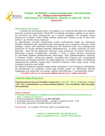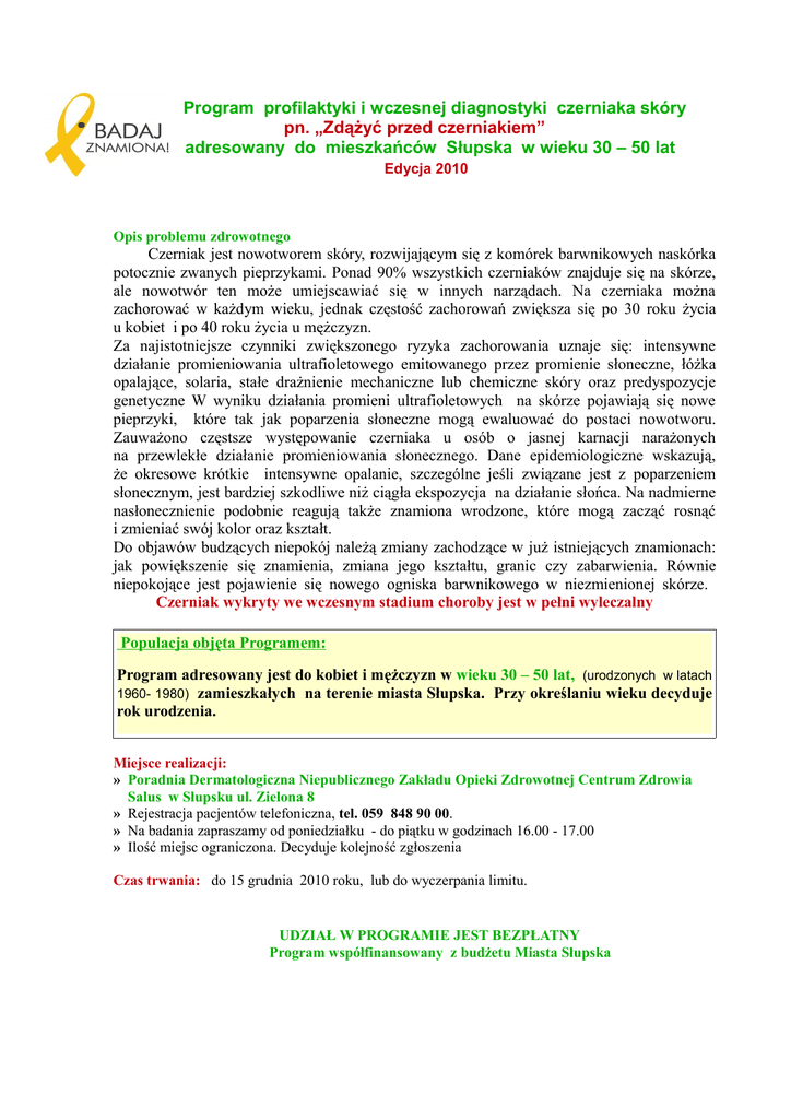 Program profilaktyki i wczesnej diagnostyki czerniaka skóry pn. „Zdążyć przed czerniakiem” adresowany do mieszkańców Słupska w wieku 30 – 50 lat Edycja 2010 Opis problemu zdrowotnego Czerniak jest nowotworem skóry, rozwijającym się z komórek barwnikowych naskórka potocznie zwanych pieprzykami. Ponad 90% wszystkich czerniaków znajduje się na skórze, ale nowotwór ten może umiejscawiać się w innych narządach. Na czerniaka można zachorować w każdym wieku, jednak częstość zachorowań zwiększa się po 30 roku życia u kobiet i po 40 roku życia u mężczyzn. Za najistotniejsze czynniki zwiększonego ryzyka zachorowania uznaje się: intensywne działanie promieniowania ultrafioletowego emitowanego przez promienie słoneczne, łóżka opalające, solaria, stałe drażnienie mechaniczne lub chemiczne skóry oraz predyspozycje genetyczne W wyniku działania promieni ultrafioletowych na skórze pojawiają się nowe pieprzyki, które tak jak poparzenia słoneczne mogą ewaluować do postaci nowotworu. Zauważono częstsze występowanie czerniaka u osób o jasnej karnacji narażonych na przewlekłe działanie promieniowania słonecznego. Dane epidemiologiczne wskazują, że okresowe krótkie intensywne opalanie, szczególne jeśli związane jest z poparzeniem słonecznym, jest bardziej szkodliwe niż ciągła ekspozycja na działanie słońca. Na nadmierne nasłonecznienie podobnie reagują także znamiona wrodzone, które mogą zacząć rosnąć i zmieniać swój kolor oraz kształt. Do objawów budzących niepokój należą zmiany zachodzące w już istniejących znamionach: jak powiększenie się znamienia, zmiana jego kształtu, granic czy zabarwienia. Równie niepokojące jest pojawienie się nowego ogniska barwnikowego w niezmienionej skórze. Czerniak wykryty we wczesnym stadium choroby jest w pełni wyleczalny Populacja objęta Programem: Program adresowany jest do kobiet i mężczyzn w wieku 30 – 50 lat, (urodzonych w latach 1960- 1980) zamieszkałych na terenie miasta Słupska. Przy określaniu wieku decyduje rok urodzenia. Miejsce realizacji: » Poradnia Dermatologiczna Niepublicznego Zakładu Opieki Zdrowotnej Centrum Zdrowia Salus w Słupsku ul. Zielona 8 » Rejestracja pacjentów telefoniczna, tel. 059 848 90 00. » Na badania zapraszamy od poniedziałku - do piątku w godzinach 16.00 - 17.00 » Ilość miejsc ograniczona. Decyduje kolejność zgłoszenia Czas trwania: do 15 grudnia 2010 roku, lub do wyczerpania limitu. UDZIAŁ W PROGRAMIE JEST BEZPŁATNY Program współfinansowany z budżetu Miasta Słupska