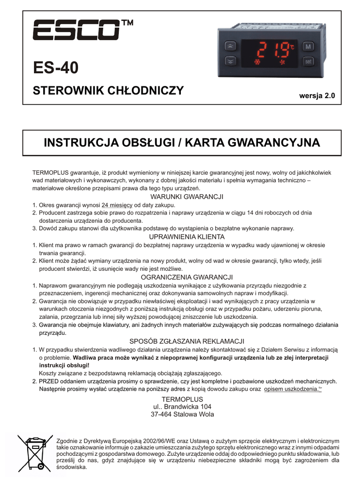 ES-40 STEROWNIK CHŁODNICZY wersja 2.0 INSTRUKCJA OBSŁUGI / KARTA GWARANCYJNA TERMOPLUS gwarantuje, iż produkt wymieniony w niniejszej karcie gwarancyjnej jest nowy, wolny od jakichkolwiek wad materiałowych i wykonawczych, wykonany z dobrej jakości materiału i spełnia wymagania techniczno – materiałowe określone przepisami prawa dla tego typu urządzeń. WARUNKI GWARANCJI 1. Okres gwarancji wynosi 24 miesięcy od daty zakupu. 2. Producent zastrzega sobie prawo do rozpatrzenia i naprawy urządzenia w ciągu 14 dni roboczych od dnia dostarczenia urządzenia do producenta. 3. Dowód zakupu stanowi dla użytkownika podstawę do wystąpienia o bezpłatne wykonanie naprawy. UPRAWNIENIA KLIENTA 1. Klient ma prawo w ramach gwarancji do bezpłatnej naprawy urządzenia w wypadku wady ujawnionej w okresie trwania gwarancji. 2. Klient może żądać wymiany urządzenia na nowy produkt, wolny od wad w okresie gwarancji, tylko wtedy, jeśli producent stwierdzi, iż usunięcie wady nie jest możliwe. OGRANICZENIA GWARANCJI 1. Naprawom gwarancyjnym nie podlegają uszkodzenia wynikające z użytkowania przyrządu niezgodnie z przeznaczeniem, ingerencji mechanicznej oraz dokonywania samowolnych napraw i modyfikacji. 2. Gwarancja nie obowiązuje w przypadku niewłaściwej eksploatacji i wad wynikających z pracy urządzenia w warunkach otoczenia niezgodnych z poniższą instrukcją obsługi oraz w przypadku pożaru, uderzeniu pioruna, zalania, przegrzania lub innej siły wyższej powodującej zniszczenie lub uszkodzenia. 3. Gwarancja nie obejmuje klawiatury, ani żadnych innych materiałów zużywających się podczas normalnego działania przyrządu. SPOSÓB ZGŁASZANIA REKLAMACJI 1. W przypadku stwierdzenia wadliwego działania urządzenia należy skontaktować się z Działem Serwisu z informacją o problemie. Wadliwa praca może wynikać z niepoprawnej konfiguracji urządzenia lub ze złej interpretacji instrukcji obsługi! Koszty związane z bezpodstawną reklamacją obciążają zgłaszającego. 2. PRZED oddaniem urządzenia prosimy o sprawdzenie, czy jest kompletne i pozbawione uszkodzeń mechanicznych. Następnie prosimy wysłać urządzenie na poniższy adres z kopią dowodu zakupu oraz opisem uszkodzenia. ES-40 STEROWNIK CHŁODNICZY wersja 2.0 INSTRUKCJA OBSŁUGI / KARTA GWARANCYJNA TERMOPLUS gwarantuje, iż produkt wymieniony w niniejszej karcie gwarancyjnej jest nowy, wolny od jakichkolwiek wad materiałowych i wykonawczych, wykonany z dobrej jakości materiału i spełnia wymagania techniczno – materiałowe określone przepisami prawa dla tego typu urządzeń. WARUNKI GWARANCJI 1. Okres gwarancji wynosi 24 miesięcy od daty zakupu. 2. Producent zastrzega sobie prawo do rozpatrzenia i naprawy urządzenia w ciągu 14 dni roboczych od dnia dostarczenia urządzenia do producenta. 3. Dowód zakupu stanowi dla użytkownika podstawę do wystąpienia o bezpłatne wykonanie naprawy. UPRAWNIENIA KLIENTA 1. Klient ma prawo w ramach gwarancji do bezpłatnej naprawy urządzenia w wypadku wady ujawnionej w okresie trwania gwarancji. 2. Klient może żądać wymiany urządzenia na nowy produkt, wolny od wad w okresie gwarancji, tylko wtedy, jeśli producent stwierdzi, iż usunięcie wady nie jest możliwe. OGRANICZENIA GWARANCJI 1. Naprawom gwarancyjnym nie podlegają uszkodzenia wynikające z użytkowania przyrządu niezgodnie z przeznaczeniem, ingerencji mechanicznej oraz dokonywania samowolnych napraw i modyfikacji. 2. Gwarancja nie obowiązuje w przypadku niewłaściwej eksploatacji i wad wynikających z pracy urządzenia w warunkach otoczenia niezgodnych z poniższą instrukcją obsługi oraz w przypadku pożaru, uderzeniu pioruna, zalania, przegrzania lub innej siły wyższej powodującej zniszczenie lub uszkodzenia. Gwarancja nie obejmuje klawiatury, ani żadnych innych materiałów zużywających się podczas normalnego działania 3. przyrządu. SPOSÓB ZGŁASZANIA REKLAMACJI 1. W przypadku stwierdzenia wadliwego działania urządzenia należy skontaktować się z Działem Serwisu dzwoniąc na numer telefonu 15 814 91 40 z informacją o problemie. Wadliwa praca może wynikać z niepoprawnej konfiguracji urządzenia lub ze złej interpretacji instrukcji obsługi! Koszty związane z bezpodstawną reklamacją obciążają zgłaszającego. 2 .PRZED oddaniem urządzenia prosimy o sprawdzenie, czy jest kompletne i pozbawione uszkodzeń mechanicznych. Następnie prosimy wysłać urządzenie na poniższy adres z kopią dowodu zakupu oraz opisem uszkodzenia. TERMOPLUS ul. Kwiatkowskiego 9 37-450 Stalowa Wola Zgodnie z Dyrektywą Europejską 2002/96/WE oraz Ustawą o zużytym sprzęcie elektrycznym i elektronicznym takie oznakowanie informuje o zakazie umieszczania zużytego sprzętu elektronicznego wraz z innymi odpadami pochodzącymi z gospodarstwa domowego. Zużyte urządzenie oddaj do odpowiedniego punktu składowania, lub prześlij do nas, gdyż znajdujące się w urządzeniu niebezpieczne składniki mogą być zagrożeniem dla środowiska. TERMOPLUS ul.. Brandwicka 104 37-464 Stalowa Wola Zgodnie z Dyrektywą Europejską 2002/96/WE oraz Ustawą o zużytym sprzęcie elektrycznym i elektronicznym takie oznakowanie informuje o zakazie umieszczania zużytego sprzętu elektronicznego wraz z innymi odpadami pochodzącymi z gospodarstwa domowego. Zużyte urządzenie oddaj do odpowiedniego punktu składowania, lub prześlij do nas, gdyż znajdujące się w urządzeniu niebezpieczne składniki mogą być zagrożeniem dla środowiska. 1. DANE TECHNICZNE 2 czujniki temperatury: NTC 5k przy 25°C wejście dwustanowe (normalnie zwarte lub rozwarte) Wejście: Zakres pomiarowy: -50...+150°C Dokładność pomiaru: ±0,5% Okres próbkowania: 330 ms Rozdzielczość: 0,1°C w całym zakresie Wyświetlacz: LED, 4 cyfry o wysokości 11mm z ikonami graficznymi Metoda regulacji: ON-OFF z histerezą Stopień i klasa ochrony: IP65 / II Zasilanie: 230V~ ±15% lub 12V=/~, max 3VA Warunki pracy: -5...60°C; 0...85%RH (