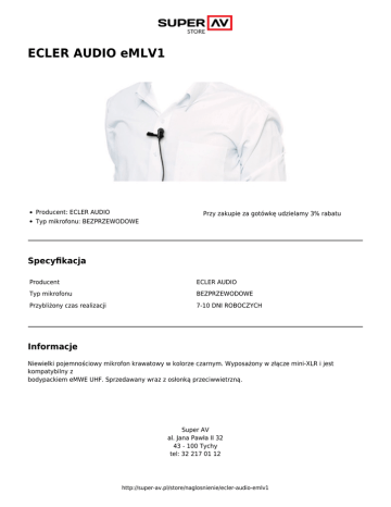 ECLER AUDIO eMLV1 Producent: ECLER AUDIO Typ mikrofonu: BEZPRZEWODOWE Przy zakupie za gotówkę udzielamy 3% rabatu Specyfikacja Producent ECLER AUDIO Typ mikrofonu BEZPRZEWODOWE Przybliżony czas realizacji 7-10 DNI ROBOCZYCH Informacje Niewielki pojemnościowy mikrofon krawatowy w kolorze czarnym. Wyposażony w złącze mini-XLR i jest kompatybilny z bodypackiem eMWE UHF. Sprzedawany wraz z osłonką przeciwwietrzną. Super AV al. Jana Pawła II 32 43 - 100 Tychy tel: 32 217 01 12 http://super-av.pl/store/naglosnienie/ecler-audio-emlv1