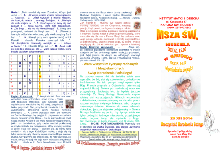 Hasła:1. „Dziś narodził się wam Zbawiciel, którym jest Jezus …”. 2. „W owym czasie wyszło rozporządzenie … Augusta”. 3. Józef wyruszył z miasta Nazaret, do Judei, do miasta … zwanego Betlejem. 4. „Nie było dla nich miejsca w …”. 5. Józef wyruszył, żeby się dać zapisać z … sobie Maryją, która była brzemienna. 6. „Dla Boga … nie ma nic niemożliwego” 7. „Kiedy tam przebywali, nadszedł dla Maryi czas …”. 8. „Pierwszy otwiera się na dar Boży, niech da się zaskoczyć Duchowi Świętemu i niech będzie Kościołem rodzącym dzieci, Kościołem matką. … [Homilia - z Domu Świętej Marty 19 XII 2014]. ten spis odbył się wówczas, gdy wielkorządcą Syrii był ….”. 9. „Stanął przy nich (pasterzach) anioł Pański i chwała Pańska zewsząd ich …”. 10. „Znajdziecie Niemowlę, owinięte w … i leżące w żłobie.” 11. „Chwała Bogu na …” 12. „Anioł rzekł do nich: Nie bójcie się, oto … wam radość wielką, która będzie udziałem całego narodu”. 1 x x 2 x C 3 4 D G 5 x C W S P x 6 7 x R 8 x x 9 O 10 x 11 W 12 x K W P S Z R A D O Ś Ć W I E L K A S A W Z U Ą Y I S Ś T x x S x x x x x O x x x x x E I A I A Ą A Z x x x I x x Ę x I H Papież Franciszek: „Z bezpłodności Pan ma moc wzbudzić nowe potomstwo, nowe życie – Takie jest dzisiejsze przesłanie. Gdy ludzkość jest wycieńczona, niezdolna by iść dalej, przychodzi łaska, przychodzi Syn, przychodzi zbawienie. I to wycieńczone stworzenie czyni miejsce nowemu stworzeniu ... A zatem potrzeba nam się otworzyć na Ducha Świętego, by przyjąć to „czynienie wszystkich rzeczy nowymi” przez Boga… To mi przywodzi na myśl naszą matkę Kościół i tak wiele rodzajów bezpłodności, jakich on doświadcza, gdy ciężar nadziei pokładanej w przykazaniach, ów pelagianizm, który wszyscy nosimy w sobie, staje się jałowy – Wydaje się, że damy radę urodzić – i nic z tego. Kościół jest matką, a staje się nią tylko wówczas, gdy otworzy się na nowość Boga, na moc Ducha. Gdy przyzna się przed sobą, że robi wszystko, co może, ale już więcej nie daje rady, wówczas przychodzi Duch” … Niech w to Boże Narodzenie nasz Kościół x Jan Paweł II: Musimy być ludźmi pokoju; musimy nawrócić się do Chrystusa, naszego pokoju, i być pewni, że Jego rozbrajająca miłość, którą promieniuje szopka, pokonuje wszelkie zagrożenia i przemoc. Trzeba nadal z ufnością prosić Dziecię, które narodziło się dla nas z Panny Maryi, by cudowna moc Jego pokoju oddaliła nienawiść i zemstę zagnieżdżone w ludzkim sercu. Musimy prosić Boga, by dobro i miłość zwyciężyły zło. [19 XII 2001-Aud. gen. i opłatek z Polakami] Stefan Kardynał Wyszyński – Zdaje się, że ludzkość przeoczyła największe zdarzenie w swych dziejach, że Ten, do którego tęskni i woła, już przyszedł, jest. Zdjął jarzmo nie dające się udźwignąć, otworzył więzienia umysłów i serc, stał się Prawodawcą miłości. INSTYTUT MATKI I DZIECKA . ul. Kasprzaka 17 KAPLICA ŚW. RODZINY (OBOK IZBY PRZYJĘĆ) (Kromka chleba2, XII, 25) - Wam wszystkim życzymy radosnych i błogosławionych Świąt Narodzenia Pańskiego! Na zdrowy rozum nikt nie śmiałby sobie sam wymyślić, że Bóg stał się człowiekiem, bo bałby się bluźnierstwa. Na taki pomysł mógł wpaść tylko Bóg. Prawda przyszła z Objawienia, tajemniczej mądrości Bożej. Święta po najdłuższej nocy nie przygnębiają. Zabierają lęk, że będzie jeszcze ciemniej.- Ze Świąt Bożego Narodzenia często robimy dni wzruszających, tkliwych wspomnień z dzieciństwa, czasem patrzymy na nie albo przez różowe okulary świętego Mikołaja, albo oczyma zasobnego dziecka, któremu do wielu zabawek dokupiono jeszcze stajenkę betlejemską. – Święta Bożego Myślenia są po to, by życzyć sobie nie tylko podwyżki, ładnego mieszkania, przystojnego męża, bogatej żony, ale myślenia o Bogu. [Jan Twardowski, W świetle Ewangelii, wyd. W drodze 2005. s.188]. MOJE POSTANOWIENIE: Pomodlę się o otwarcie na Ducha Świętego, aby przyjąć „czynienie wszystkich rzeczy nowymi” przez Boga … Kapelan IMiDz- x. Proboszcz A. Wójtowicz - 22 632 38 00 e-mail : [email protected] http://www.stanislaw-bm.pl/ Parafia Św. Stanisława BM-01-244 Warszawa;ul.Bema73/75 [gazetka do użytku wewnętrznego Instytutu] Spowiedź pół godziny przed i po Mszy Św. oraz na prośbę. Zwiastuję wam radość wielką, dziś narodził się wam Zbawiciel, którym jest Jezus Chrystus Łk 2,1-14 W owym czasie wyszło rozporządzenie Cezara Augusta, żeby przeprowadzić spis ludności w całym państwie. Pierwszy ten spis odbył się wówczas, gdy wielkorządcą Syrii był Kwiryniusz. Wybierali się więc wszyscy, aby się dać zapisać, każdy do swego miasta. Udał się także Józef z Galilei, z miasta Nazaret, do Judei, do miasta Dawidowego, zwanego Betlejem, ponieważ pochodził z domu i rodu Dawida, żeby się dać zapisać z poślubioną sobie Maryją, która była brzemienna. Kiedy tam przebywali, nadszedł dla Maryi czas rozwiązania. Porodziła swego pierworodnego Syna, owinęła Go w pieluszki i położyła w żłobie, gdyż nie było dla nich miejsca w gospodzie. W tej samej okolicy przebywali w polu pasterze i trzymali straż nocną nad swoją trzodą. Naraz stanął przy nich anioł Pański i chwała Pańska zewsząd ich oświeciła, tak że bardzo się przestraszyli. Lecz anioł rzekł do nich: Nie bójcie się! Oto zwiastuję wam radość wielką, która będzie udziałem całego narodu: dziś w mieście Dawida narodził się wam Zbawiciel, którym jest Mesjasz, Pan. A to będzie znakiem dla was: Znajdziecie Niemowlę, owinięte w pieluszki i leżące w żłobie. I nagle przyłączyło się do anioła mnóstwo zastępów niebieskich, które wielbiły Boga słowami: Chwała Bogu na wysokościach, a na ziemi pokój ludziom Jego upodobania - Naród kroczący (Łk 2,10-11) w c