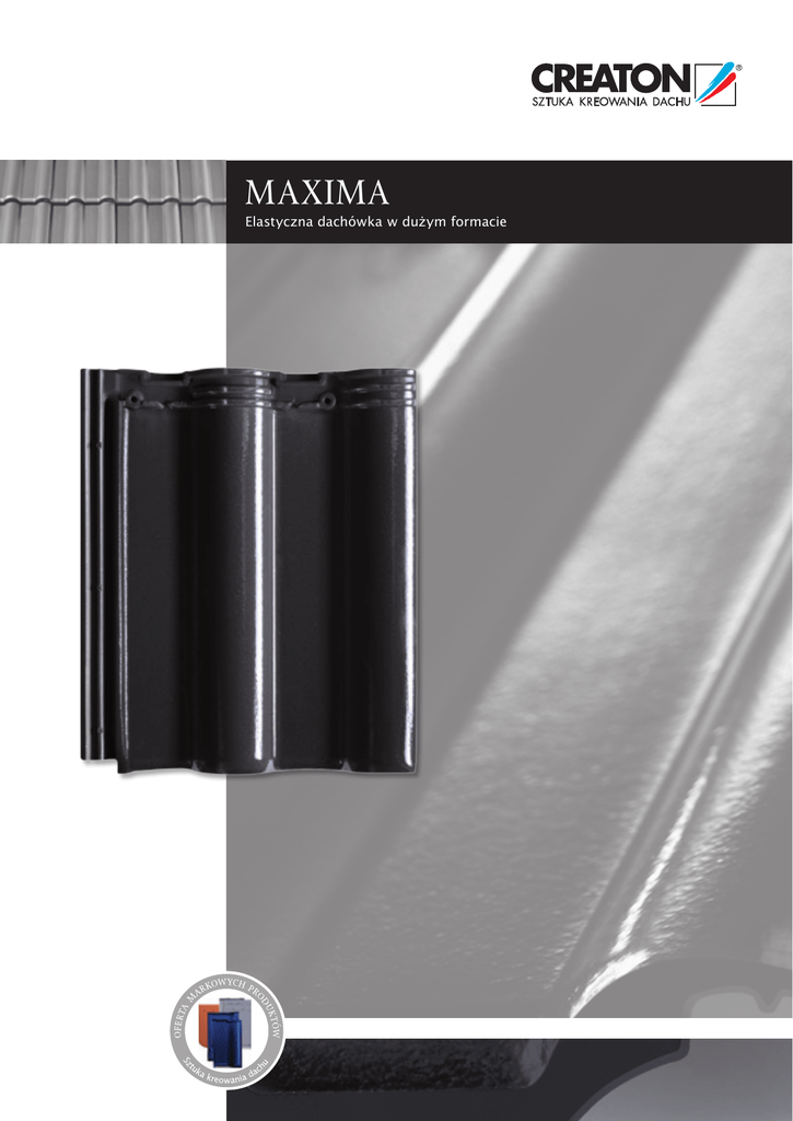 MAXIMA Elastyczna dachówka w dużym formacie 02I03 MAXIMA – jedyna w swoim rodzaju MAXIMA to dachówka, której wszystkie walory jakościowe zostały sprawdzone i docenione na przestrzeni lat przez wielu dekarzy w kraju i w Europie. Ta uniwersalna dachówka znajduje zastosowanie szczególnie w pracach dekarskich polegających na wymianie starego pokrycia na nowe. Ten naturalny produkt zwiększa wartość remontowanego dachu, nie tylko ze względu na wyjątkową estetykę i szereg rozwiązań systemowych. MAXIMA pasuje perfekcyjnie do istniejących połaci krytych dachówką cementową, co jest nieocenione głównie w zabudowie szeregowej. Za wyborem dachówki MAXIMA przemawiają liczne udogodnienia sprzyjające szybkiemu montażowi oraz argumenty o charakterze ekonomicznym. Nowe pokrycie dachowe nie wymaga w przyszości żadnych nakładów finansowych, odznacza się powierzchnią o trwałej kolorystyce odpornej na promienie UV oraz odpornością przed osadzaniem i wnikaniem zanieczyszczeń. 333 mm Mostki na spodzie dachówki Mostki na spodzie polepszają statykę i umożliwiają odprowadzenie na powierzchnię niżej położonej dachówki osiadającej wody. 41 mm Tolerancja przesuwu Tolerancja przesuwu nawet do 41 mm to możliwość optymalnego dostosowania rozstawu łat na połaci przy zachowaniu maksymalnej szczelności. Podwójne połączenie śrubowe 403 mm Dzięki fabrycznie przygotowanym otworom montażowym możliwe jest przytwierdzenie dachówki bez konieczności dodatkowego wiercenia. Otwory znajdują się w miejscu bezpiecznym od deszczu. Perfekcyjne dopasowanie MAXIMA świetnie sprawdza się podczas remontu dachu w zabudowie szeregowej. Jest kompatybilna z innymi modelami dachówek, np. cementową w formacie „10“ na dachu sąsiada. wiec wart y GLINY ojego zau f Tw ia! an jakośc zej is ps Stare pokrycie o ur Remont przy pomocy dachówki MAXIMA Na jle Duży format dachówki MAXIMA to szybkie i ekonomiczne krycie dachów dzięki użyciu ok. 10 dachówek na m2. Trzy żebra czołowe lepiej chronią przed deszczem. Dachówka stanowi inteligentną alternatywę dla dotychczasowego pokrycia dachowego. Unikalne rozwia˛zania technologiczne Warunkiem uzyskania wysokiej jakości oraz stabilności wymiarowej dachówek jest innowacyjna technika produkcyjna. Mieszanie najwyższej jakości gliny odbywa się w zamkniętych metalowych formach pod wysokim ciśnieniem, przez co powstaje idealnie utrzymująca wymiar dachówka. Dzięki odpowiedniemu ukierunkowaniu ognia osiągnięta została unikalna technika procesów przetwórczych i tym samym zredukowana wartość CO2. Zastosowanie najnowocześniejszej technologii oraz dążenie do zachowania równowagi w środowisku naturalnym gwarantuje, że dachówka MAXIMA jest produktem o możliwie najmniejszym negatywnym oddziaływaniu na środowisko. Najwyższa precyzja dzięki najnowocześniejszej technice produkcji 04I05 100% tr w a MAXIMA – liczne zalety i fascynuja˛ca pa ło śc i koloru czerwień naturalna „NUANCE“ miedziana angobowana „NUANCE“ ciemnobrązowa angobowana „FINESSE“ winna czerwień glazurowana „NUANCE“ w kolorze łupka angobowana „FINESSE“ brązowa glazurowana „NUANCE“ antracytowa angobowana „FINESSE“ czarna glazurowana Wszystkie powłoki dachówki MAXIMA oferowane są w najwyższym standardzie jakościowym. Kolekcja dachówek angobowanych „NUANCE” z jedwabistym połyskiem oraz gładką powierzchnią zachowują unikalną na rynku ceramiki budowlanej najwyższą odporność na zadrapania i uderzenia. Glazury z kolekcji „FINESSE“ optymalnie chronią dachówkę przed wpływem czynników atmosferycznych nadając jej jednocześnie intensywną barwę. leta trwalych kolorów ⁄ L AGODNE KRAWE˛DZIE ⁄ Dzięki wyjątkowo gładkim i nieostrym krawędziom, dachówki MAXIMA można w szybkim tempie układać bez obaw o skaleczenie. Zminimalizowane zostaje również ryzyko porastania mchem poprzez brak możliwości odkładania się zanieczyszeń na krawędziach. Dzięki temu dachówki pozostają dłużej czyste. MOŻLIWOŚĆ SZTAPLOWANIA Na powierzchni dachu można ułożyć stos z 8 dachówek MAXIMA. To zdecydowanie zapewnia łatwość montażu i optymalizuje logistykę dekarską. Pracom dekarskim sprzyja również duży format dachówek, gwarantujący szybkie i ekonomiczne krycie dachów dzięki mniejszemu zużyciu dachówek na m2. DOSKONALY SUROWIEC ⁄ Dachówka MAXIMA wraz z oryginalnymi akcesoriami produkowana jest z najczystszej gliny z najlepszych złóż. Jej staranny przerób i najwyższej jakości wypał wszystkich dodatków ceramicznych sprawiają, że cały system dachowy posiada jednolitą barwę oraz najwyższą jakość. PERFEKCYJNA POWIERZCHNIA Zastosowanie wysokiej jakości angob i glazur zwiększa odporność dachówek na negatywny wpływ czynników zewnętrznych oraz uszkodzenia mechaniczne. Dach przez długie lata wygląda jak nowy. UNIWERSALNA DACHÓWKA BOCZNA Dzięki swojej konstrukcji dachówka boczna jest niezwykle elastyczna w zastosowaniu. Dachówka gwarantuje bezpieczeństwo oraz zapewnia optymalny wygląd przy każdej wartości rozstawu łat z dostępnego zakresu. 06I08 ORYGINALNE AKCESORIA ESTETYKA BEZPIECZEŃSTWO JAKOŚĆ Oryginalne akcesoria dachowe Dachówka przelotowa ceramiczna do kominów gazowych Gwarancja szczelności i pięknego wyglądu dachu W ofercie oryginalnych akcesoriów „MANUFAKTUR“ Taśma wykończeniowa kominowa/ścienna dachowych CREATON znajduje się wszystko, co jest potrzebne, aby dach był nie tylko piękny, ale też szczelny i bezpieczny. Poniższe zestawienie na przykładzie dachówki HARMONIE prezentuje asortyment dla wszystkich modeli w ofercie CREATON. Adapter „SIGNUM“ Kominek „SIGNUM“ Zestaw funkcjonalny „SIGNUM“ + + kominek wentylacyjny / dachówka przelotowa + giętki przewód przyłączeniowy + adapter Dachówka boczna lewa/prawa Dachówka dwufalowa Dachówka przezroczysta Dachówka antenowa z gumową nasadką Drabina Wyłaz d