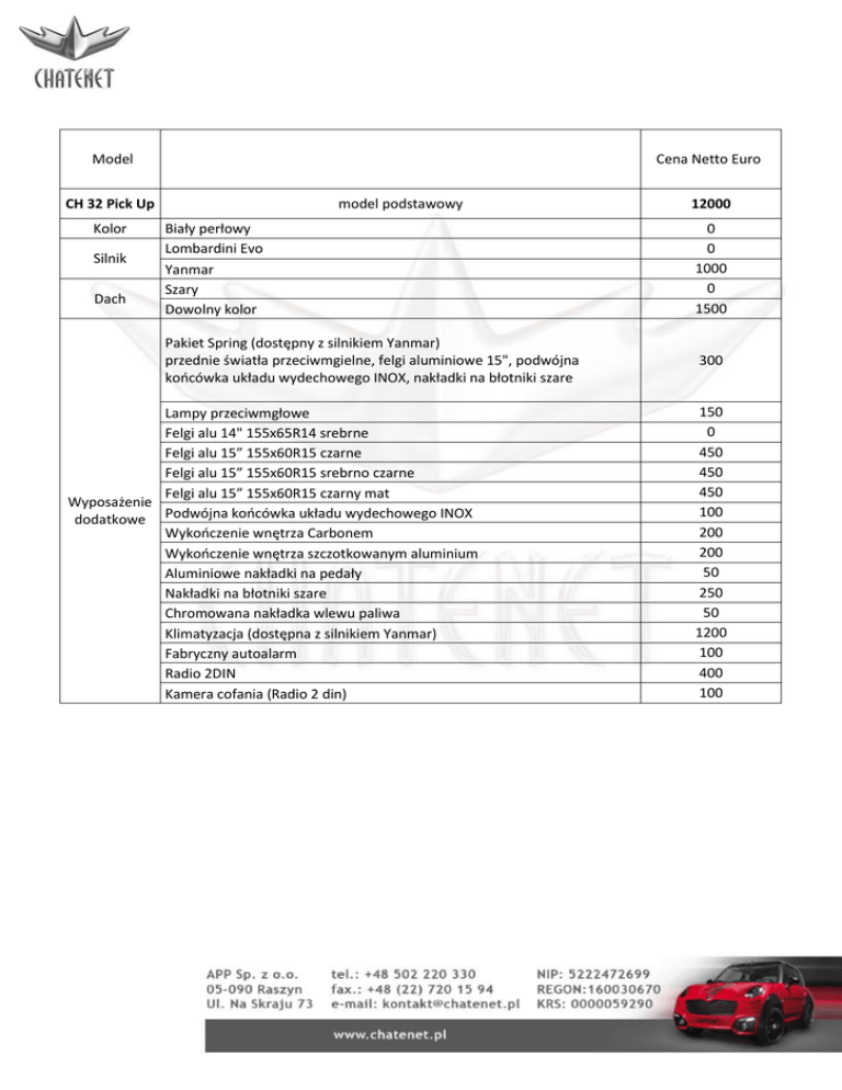Model Cena Netto Euro CH 32 Pick Up Kolor Silnik Dach model podstawowy 12000 Biały perłowy Lombardini Evo Yanmar Szary Dowolny kolor 0 0 1000 0 1500 Pakiet Spring (dostępny z silnikiem Yanmar) przednie światła przeciwmgielne, felgi aluminiowe 15", podwójna końcówka układu wydechowego INOX, nakładki na błotniki szare 300 Lampy przeciwmgłowe Felgi alu 14" 155x65R14 srebrne Felgi alu 15” 155x60R15 czarne Felgi alu 15” 155x60R15 srebrno czarne Felgi alu 15” 155x60R15 czarny mat Wyposażenie dodatkowe Podwójna końcówka układu wydechowego INOX Wykończenie wnętrza Carbonem Wykończenie wnętrza szczotkowanym aluminium Aluminiowe nakładki na pedały Nakładki na błotniki szare Chromowana nakładka wlewu paliwa Klimatyzacja (dostępna z silnikiem Yanmar) Fabryczny autoalarm Radio 2DIN Kamera cofania (Radio 2 din) 150 0 450 450 450 100 200 200 50 250 50 1200 100 400 100