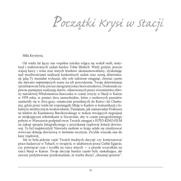Początki Krysi w Stacji Miła Krystyno, Od wielu lat łączy nas wspólna ścieżka wijąca się wokół osób, instytucji i realizowanych zadań bardzo Tobie bliskich. Wiele godzin, jeszcze więcej kawy i wina oraz innych trunków skonsumowaliśmy, dyskutując nad możliwościami realizacji konkretnych zadań oraz oceną determinacji, jaką Ty musiałaś wykazać, aby cele założone osiągnąć, chociaż często nie dawano najmniejszych szans na ich powodzenie. Twoja determinacja i przebojowość była zawsze nieograniczona i bezwarunkowa. Doskonale zapewne pamiętasz realizację darów, ofiarowanych przez wiceministra obrony narodowej Włodzimierza Sawczuka w czasie wizyty w Stacji w Kairze w 1978 roku, w postaci dwu samochodów, które z osobowych passatów zamieniły się w dwa gazy, ostatecznie przesłanych do Kairu i do Chartumu, gdzie przez wiele lat wspomagały Misję w Kadero w komunikacji z lokalnym neolitycznym środowiskiem. Pamiętam, jak namawiałaś Profesora na telefon do Kazimierza Barcikowskiego w trakcie trwających negocjacji ze strajkującymi robotnikami w Szczecinie, aby w czasie parogodzinnego pobytu w Warszawie podpisał owoc Twoich zmagań z FOTO-KINO-FILM na zakup sprzętu fotograficznego z pozyskanej rządowej dotacji dewizowej. To był majstersztyk! Niewielu osobom w kraju udało się zrealizować wówczas dotację dewizową w terminie rocznym. Zwykle wracała ona do kasy rządowej. Ale to była jedynie część Twoich trudnych decyzji: czy kontynuować prace badawcze w Tebach, w świątyni, w ulubionym przez Ciebie Egipcie, czy poświęcać czas i wysiłki na rzecz innych — a przede wszystkim na rzecz Stacji w Kairze. Twoje decyzje bardzo często były zaskakujące, ale zawsze podyktowane przekonaniem, że trzeba służyć „słusznej sprawie”. 31 Powracająca misja sudańska na tarasie Stacji w Kairze. Pośrodku Lech Krzyżaniak adorowany przez Ewę Krygier i Krystynę Polaczek. Za nimi od lewej: Marek Steinborn, Stefan Jakobielski, Jacek Nowakowski, Włodzimierz Godlewski, Marek Chłodnicki. Pomagałaś organizować konferencje międzynarodowe w Warszawie, w Chantilly i w Cambridge. Z szacunkiem do Ciebie odnosili się Jean Leclant, J. Martin Plumley i Paul van Moorsel. Stałaś się „kobietą, która wszystko może” załatwić z poczuciem pełnej odpowiedzialności. Przed dwoma laty, przy długim stole w Centrum, gdy już podjęłaś decyzję o ograniczeniu Twych publicznych działań, zapytałaś, kto powołał Cię na sekretarza Stacji (Centrum), gdy Stacja powróciła na łono Uniwersytetu Warszawskiego. Działo się to w trudnym, pełnym nadziei i wielkiej niepewności roku 1979. Prorektor Uniwersytetu Warszawskiego, Prof. Kazimierz Dobrowolski, wystąpił wówczas z propozycją uregulowania trudnych formalno-prawnych relacji Profesora z Uniwersytetem Warszawskim. Gdy po jednym z długich spacerów po dziedzińcu Uniwersytetu wróciłem do gabinetu Profesora, aby zrelacjonować stan wstępnych ustaleń z prorektorem Dobrowolskim, które torowały drogę Profesorowi, aby mógł wziąć udział w posiedzeniu Senatu, co było warunkiem Profesora i miało doprowadzić do powołania krajowego sekretariatu Stacji w Kairze na Uniwersytecie Warszawskim, Profesor przez chwilę głośno „myślał”, kogo zaproponować na stanowisko sekretarza: „… tak, tak… to będzie Krystyna Polaczek” – Profesor nie miał wątpliwości. Gdy po kilku miesiącach zabrakło Profesora, prorektor Dobrowolski już wiedział, kogo ma zatrudnić na stanowisku sekretarza Stacji w Warszawie. To byłaś Ty, Krystyno. Jednoosobowa gwarancja istnienia Stacji na Uniwersytecie Warszawskim. Wspaniale pełniłaś tę funkcję przez wiele lat, nie szczędząc czasu i zdrowia. Jestem Ci bardzo wdzięczny. Nie zawiodłaś Profesora. Wielu radosnych chwil, już bez nałożonej na Ciebie odpowiedzialności, życzą Ci Włodek Godlewski z Lilką 33