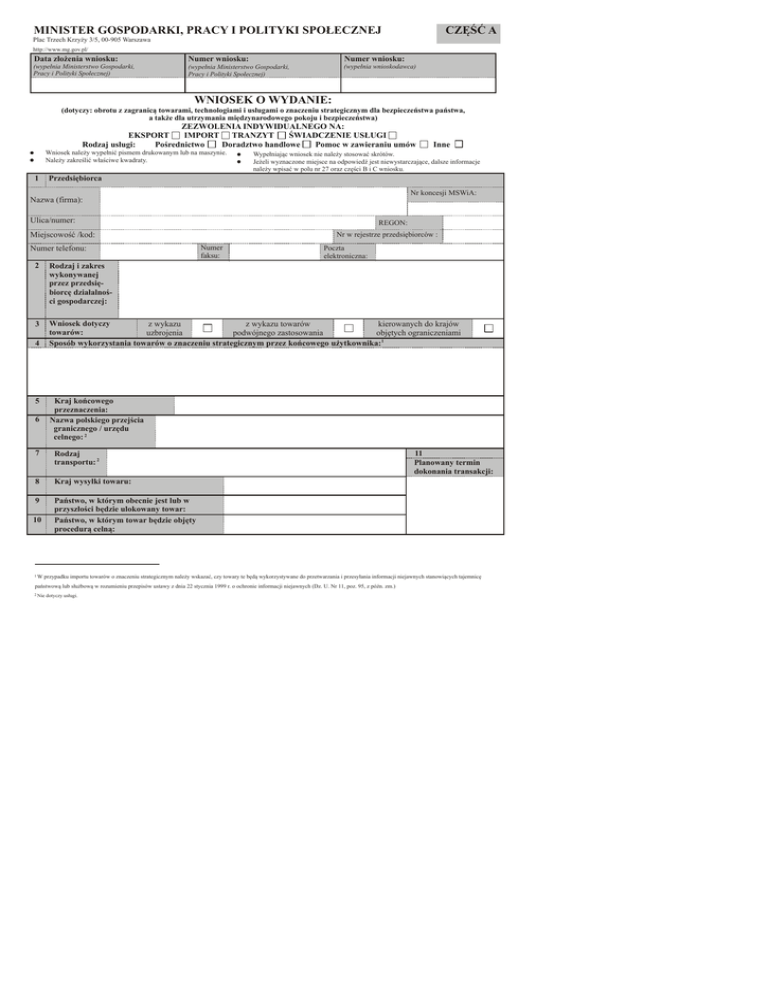 MINISTER GOSPODARKI, PRACY I POLITYKI SPOŁECZNEJ CZĘŚĆ A Plac Trzech Krzyży 3/5, 00905 Warszawa http://www.mg.gov.pl/ Data złożenia wniosku: (wypełnia Ministerstwo Gospodarki, Pracy i Polityki Społecznej) Numer wniosku: Numer wniosku: (wypełnia Ministerstwo Gospodarki, Pracy i Polityki Społecznej) (wypełnia wnioskodawca) WNIOSEK O WYDANIE: (dotyczy: obrotu z zagranicą towarami, technologiami i usługami o znaczeniu strategicznym dla bezpieczeństwa państwa, a także dla utrzymania międzynarodowego pokoju i bezpieczeństwa) ZEZWOLENIA INDYWIDUALNEGO NA: EKSPORT IMPORT TRANZYT ŚWIADCZENIE USŁUGI Rodzaj usługi: Pośrednictwo Doradztwo handlowe Pomoc w zawieraniu umów Inne Wniosek należy wypełnić pismem drukowanym lub na maszynie. Należy zakreślić właściwe kwadraty. 1 Wypełniając wniosek nie należy stosować skrótów. Jeżeli wyznaczone miejsce na odpowiedź jest niewystarczające, dalsze informacje należy wpisać w polu nr 27 oraz części B i C wniosku. Przedsiębiorca Nr koncesji MSWiA: Nazwa (firma): Ulica/numer: REGON: Miejscowość /kod: Numer telefonu: Nr w rejestrze przedsiębiorców : Numer faksu: Poczta elektroniczna: 2 Rodzaj i zakres wykonywanej przez przedsię biorcę działalnoś ci gospodarczej: 3 Wniosek dotyczy kierowanych do krajów z wykazu z wykazu towarów towarów: objętych ograniczeniami uzbrojenia podwójnego zastosowania Sposób wykorzystania towarów o znaczeniu strategicznym przez końcowego użytkownika:1 4 5 6 Kraj końcowego przeznaczenia: Nazwa polskiego przejścia granicznego / urzędu celnego: 2 7 Rodzaj transportu: 2 8 Kraj wysyłki towaru: 9 Państwo, w którym obecnie jest lub w przyszłości będzie ulokowany towar: Państwo, w którym towar będzie objęty procedurą celną: 10 11 Planowany termin dokonania transakcji: 1 W przypadku importu towarów o znaczeniu strategicznym należy wskazać, czy towary te będą wykorzystywane do przetwarzania i przesyłania informacji niejawnych stanowiących tajemnicę państwową lub służbową w rozumieniu przepisów ustawy z dnia 22 stycznia 1999 r. o ochronie informacji niejawnych (Dz. U. Nr 11, poz. 95, z późn. zm.) 2 Nie dotyczy usługi. 12 3 Nr koncesji MSWiA : Nazwa (firma): Eksporter: Ulica/numer: 13 Miejscowość /kod: Państwo: Numer telefonu: REGON: 3 Nr w rejestrze przedsiębiorców 3 Poczta elektroniczna: Numer faksu: 3 Nr koncesji MSWiA : Nazwa (firma): Importer: Ulica/numer: 14 Miejscowość /kod: REGON: 3 Państwo: Numer telefonu: Nr w rejestrze przedsiębiorców 3 Poczta elektroniczna: 3 Nr koncesji MSWiA : Numer faksu: Nazwa (firma): Końcowy użytkownik:4 Ulica/numer: Miejscowość /kod: Państwo: REGON: 3 Nr w rejestrze przedsiębiorców: Numer faksu: Numer telefonu: 3 Poczta elektroniczna: 3 15 Nr koncesji MSWiA : Nazwa (firma): Producent:4 Ulica/numer: 16 Miejscowość /kod: REGON: 3 Państwo: Nr w rejestrze przedsiębiorców 3 Numer faksu: Numer telefonu: Poczta elektroniczna: 3 Nr koncesji MSWiA : Nazwa (firma): Inny partner handlowy4 Ulica/numer: Miejscowość /kod: REGON: 3 Państwo: Nr w rejestrze przedsiębiorców 3 Numer faksu: Numer telefonu: Poczta elektroniczna: Charakter czynności realizowanych na rzecz transakcji: 17 Osoba odpowiedzialna u przedsiębiorcy za ko ordynację kontroli obrotu towarami o zna czeniu strategicznym Imię i nazwisko: Stanowisko: Numer telefonu: 3 Nie dotyczy zagranicznych partnerów handlowych. 4 Pozostałych partnerów handlowych należy umieścić w części C wniosku. Numer faksu: Poczta elektroniczna: 18 19 20 21 22 23 24 26 27 5 NIE TAK Towary o znaczeniu strategicznym wymienione w części B wniosku są specjalnie zaprojektowane lub przystosowane do wykorzystania nuklearnego.5 NIE TAK Towary o znaczeniu strategicznym wymienione w części B wniosku są specjalnie zaprojektowane lub przystosowane do wykorzystania wojskowego lub do produkcji towarów o zastosowaniu wojskowym. 5 Towary o znaczeniu strategicznym wymienione w części B wniosku mogą być wykorzystane w badaniach, NIE TAK produkcji, obsłudze, konserwacji, transporcie, wykrywaniu, magazynowaniu broni jądrowej, chemicznej, 5 biologicznej lub środków do jej przenoszenia. NIE TAK Istnieją podstawy do przypuszczeń, że te towary lub technologie mogą być użyte do celów wymienionych w polach 1820.5 Na podstawie dotychczasowych rozmów handlowych istnieją podstawy do przypuszczeń, że importer lub NIE TAK deklarowany końcowy użytkownik dokona reeksportu towarów lub technologii wymienionych we wniosku lub 5 nastąpi zmiana ich końcowego wykorzystania. NIE TAK Czy zagraniczni partnerzy handlowi są uprawnieni przez właściwe władze własnego kraju do udziału w obrocie towarami i technologiami wymienionymi we wniosku? NIE NIE TAK TAK Dołączam wniosek o wydanie certyfikatu Dołączam wniosek o poświadczenie 25 importowego: oświadczenia końcowego użytkownika: Oświadczenie: Ja, niżej podpisany, oświadczam, że: a) zgodnie z moją wiedzą i przekonaniem, wszystkie informacje podane w częściach A, B i C niniejszego wniosku oraz wszystkie przedstawione dokumenty są prawdziwe i kompletne oraz w pełni i wiernie opisują warunki zamówienia i inne fakty dotyczące transakcji handlowej, b) podejmę niezbędne działania, żeby towary lub technologie, o których mowa we wniosku, dotarły do końcowego użytkownika, c) poinformuję pisemnie zagranicznego importera, że zmiana sposobu wykorzystania lub końcowego użytkownika wymagają uprzedniej zgody polskiego organu kontroli obrotu, d) poinformuję inne strony wymienione w niniejszym wniosku o konieczności uzyskania zezwolenia polskiego organu kontroli obrotu, e) niezwłocznie powiadomię Ministra Gospodarki, Pracy i Polityki Społecznej o wszelkich zmianach w umowie. Imię, nazwisko, stanowisko Dodatkowe informacje: Dotyczy eksportu. Podpis Pieczęć firmowa Data CZĘŚĆ B Data złożenia wniosku: (wypełnia Ministerstwo Gospodarki, Pracy i Polityki Społecznej) Numer wniosku: Numer wniosku w