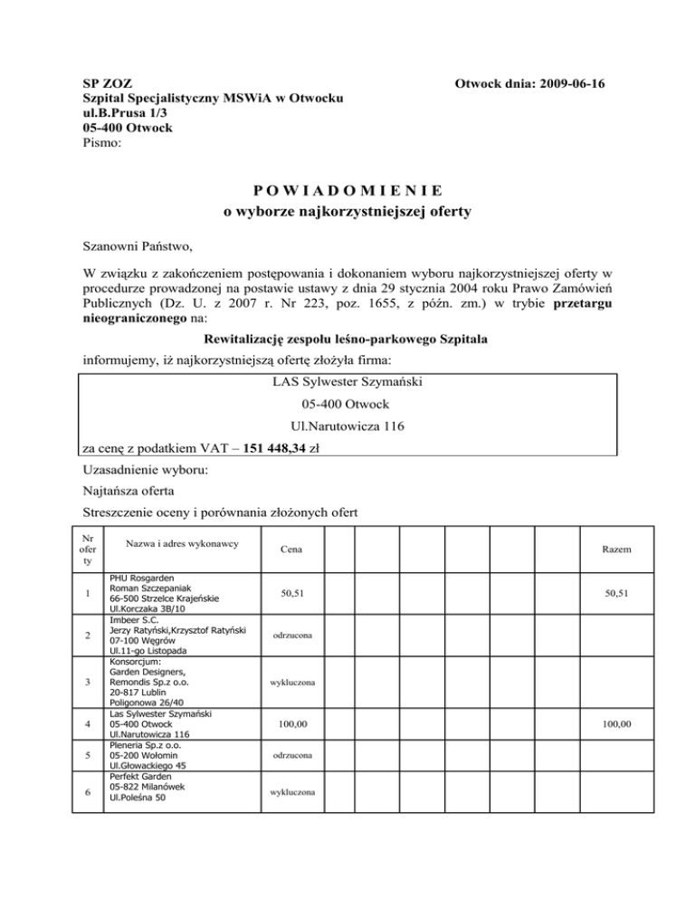 SP ZOZ Szpital Specjalistyczny MSWiA w Otwocku ul.B.Prusa 1/3 05-400 Otwock Pismo: Otwock dnia: 2009-06-16 POWIADOMIENIE o wyborze najkorzystniejszej oferty Szanowni Państwo, W związku z zakończeniem postępowania i dokonaniem wyboru najkorzystniejszej oferty w procedurze prowadzonej na postawie ustawy z dnia 29 stycznia 2004 roku Prawo Zamówień Publicznych (Dz. U. z 2007 r. Nr 223, poz. 1655, z późn. zm.) w trybie przetargu nieograniczonego na: Rewitalizację zespołu leśno-parkowego Szpitala informujemy, iż najkorzystniejszą ofertę złożyła firma: LAS Sylwester Szymański 05-400 Otwock Ul.Narutowicza 116 za cenę z podatkiem VAT – 151 448,34 zł Uzasadnienie wyboru: Najtańsza oferta Streszczenie oceny i porównania złożonych ofert Nr ofer ty 1 2 3 4 5 6 Nazwa i adres wykonawcy PHU Rosgarden Roman Szczepaniak 66-500 Strzelce Krajeńskie Ul.Korczaka 3B/10 Imbeer S.C. Jerzy Ratyński,Krzysztof Ratyński 07-100 Węgrów Ul.11-go Listopada Konsorcjum: Garden Designers, Remondis Sp.z o.o. 20-817 Lublin Poligonowa 26/40 Las Sylwester Szymański 05-400 Otwock Ul.Narutowicza 116 Pleneria Sp.z o.o. 05-200 Wołomin Ul.Głowackiego 45 Perfekt Garden 05-822 Milanówek Ul.Poleśna 50 Cena Razem 50,51 50,51 odrzucona wykluczona 100,00 odrzucona wykluczona 100,00 7 8 9 Ogród Usługi Ogrodnicze Leszek Kułak 66-440 Skwierzyna Ul.Lawendowa 1 Przedsiębiorstwo Usług ogrodniczych Flora Sp. z o.o. 03-574 Warszawa Ul.Radzymińska 116 Pielęgnacja Drzew Pomników Przyrody S.C. 07-100 Węgrów Ul.Pogodna 21 odrzucona odrzucona odrzucona Oferta Konsorcjum: Garden Designers, Remondis Sp.z o.o. 20-817 Lublin Poligonowa 26/40 została wykluczona na podstawie art.24 ust.2 pkt 3 ustawy Prawo zamówień publicznych z uwagi nie dostarczenia następujących dokumentów 1. Wykonawca Garden Designers a) Informacja z Krajowego Rejestru Karnego b) Zaświadczenie z właściwego organu podatkowego 2. Wykonawca Remondis a) Informacja z Krajowego Rejestru Karnego b) Zaświadczenie z właściwego organu podatkowego c) Zaświadczenie z ZUS Oferta firmy: Perfekt Garden 05-822 Milanówek Ul.Poleśna 50 została wykluczona podstawie art.24 ust.2 pkt 3 ustawy Prawo zamówień publicznych z uwagi nie dostarczenia następujących dokumentów 1. wpisu do rejestru gospodarczego 2. informacji z Krajowego Rejestru Karnego 3. zaświadczenia z właściwego organu podatkowego 4. zaświadczenie z ZUS Oferty firm: 1. Imbeer S.C.Jerzy Ratyński, Krzysztof Ratyński, 07-100 Węgrów, Ul.11-go Listopada 2. Pleneria Sp.z o.o., 05-200 Wołomin, Ul.Głowackiego 45 3. Ogród Usługi Ogrodnicze Leszek Kułak, 66-440 Skwierzyna, Ul.Lawendowa 1 4. Przedsiębiorstwo Usług Ogrodniczych, Flora Sp. z o.o., 03-574 Warszawa, Ul.Radzymińska 116 5. Pielęgnacja Drzew Pomników Przyrody S.C., 07-100 Węgrów , Ul.Pogodna 21 zostały odrzucone na podstawie na podstawie art.89 ust.1 pkt 6 Zadanie „rewitalizacja zespołu leśno-parkowego Szpitala” mieści się w grupowaniu PKWiU 01.41.12-00.00 (Usługi związane z zagospodarowaniem terenów zieleni}. Dla powyższego grupowania stosuje się stawkę VAT w wysokości 7 %.. Jednocześnie zawiadamiamy, iż wobec czynności podjętych przez zamawiającego w toku postępowania mają Państwo prawo wnieść protest w terminach i formie określonych w art. 180 ustawy Prawo Zamówień Publicznych.