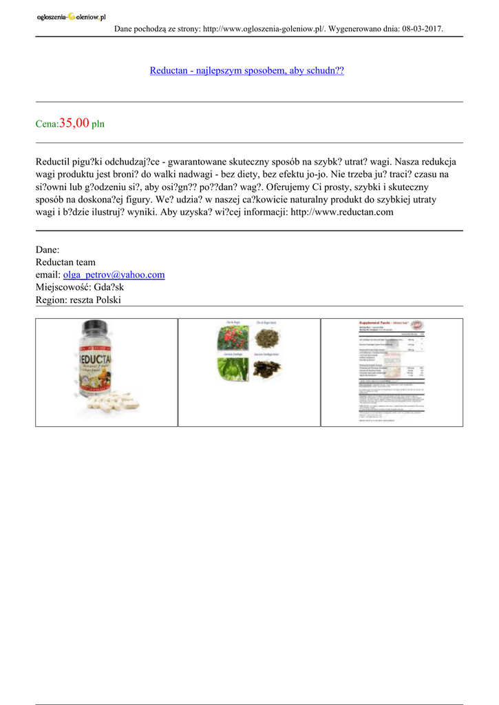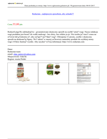 Dane pochodzą ze strony: http://www.ogloszenia-goleniow.pl/. Wygenerowano dnia: 08-03-2017. Reductan - najlepszym sposobem, aby schudn?? Cena:35,00 pln Reductil pigu?ki odchudzaj?ce - gwarantowane skuteczny sposób na szybk? utrat? wagi. Nasza redukcja wagi produktu jest broni? do walki nadwagi - bez diety, bez efektu jo-jo. Nie trzeba ju? traci? czasu na si?owni lub g?odzeniu si?, aby osi?gn?? po??dan? wag?. Oferujemy Ci prosty, szybki i skuteczny sposób na doskona?ej figury. We? udzia? w naszej ca?kowicie naturalny produkt do szybkiej utraty wagi i b?dzie ilustruj? wyniki. Aby uzyska? wi?cej informacji: http://www.reductan.com Dane: Reductan team email: [email protected] Miejscowość: Gda?sk Region: reszta Polski