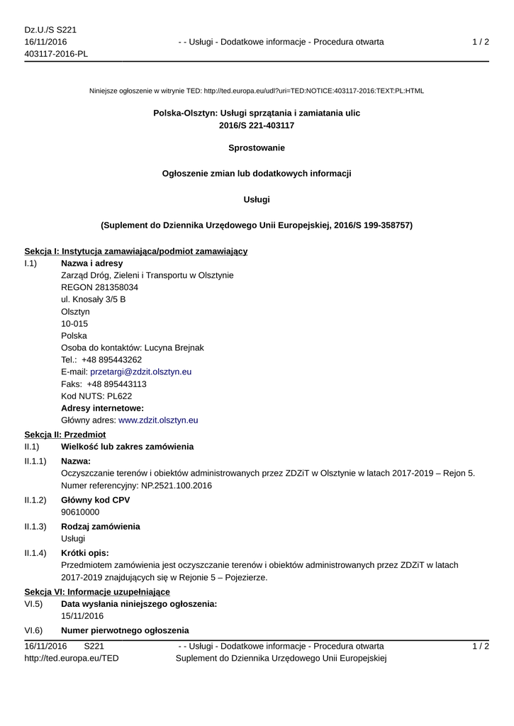 Dz.U./S S221 16/11/2016 403117-2016-PL - - Usługi - Dodatkowe informacje - Procedura otwarta 1/2 Niniejsze ogłoszenie w witrynie TED: http://ted.europa.eu/udl?uri=TED:NOTICE:403117-2016:TEXT:PL:HTML Polska-Olsztyn: Usługi sprzątania i zamiatania ulic 2016/S 221-403117 Sprostowanie Ogłoszenie zmian lub dodatkowych informacji Usługi (Suplement do Dziennika Urzędowego Unii Europejskiej, 2016/S 199-358757) Sekcja I: Instytucja zamawiająca/podmiot zamawiający I.1) Nazwa i adresy Zarząd Dróg, Zieleni i Transportu w Olsztynie REGON 281358034 ul. Knosały 3/5 B Olsztyn 10-015 Polska Osoba do kontaktów: Lucyna Brejnak Tel.: +48 895443262 E-mail: [email protected] Faks: +48 895443113 Kod NUTS: PL622 Adresy internetowe: Główny adres: www.zdzit.olsztyn.eu Sekcja II: Przedmiot II.1) Wielkość lub zakres zamówienia II.1.1) Nazwa: Oczyszczanie terenów i obiektów administrowanych przez ZDZiT w Olsztynie w latach 2017-2019 – Rejon 5. Numer referencyjny: NP.2521.100.2016 II.1.2) Główny kod CPV 90610000 II.1.3) Rodzaj zamówienia Usługi II.1.4) Krótki opis: Przedmiotem zamówienia jest oczyszczanie terenów i obiektów administrowanych przez ZDZiT w latach 2017-2019 znajdujących się w Rejonie 5 – Pojezierze. Sekcja VI: Informacje uzupełniające VI.5) Data wysłania niniejszego ogłoszenia: 15/11/2016 VI.6) Numer pierwotnego ogłoszenia 16/11/2016 S221 http://ted.europa.eu/TED - - Usługi - Dodatkowe informacje - Procedura otwarta Suplement do Dziennika Urzędowego Unii Europejskiej 1/2 Dz.U./S S221 16/11/2016 403117-2016-PL - - Usługi - Dodatkowe informacje - Procedura otwarta 2/2 Numer ogłoszenia w Dz.Urz. UE – OJ/S: 2016/S 199-358757 Sekcja VII: Zmiany VII.1) Informacje do zmiany lub dodania VII.1.2) Tekst, który należy poprawić w pierwotnym ogłoszeniu Numer sekcji: IV.2.2 Miejsce, w którym znajduje się tekst do modyfikacji: Termin składania ofert lub wniosków o dopuszczenie do udziału Zamiast: Data: 21/11/2016 Czas lokalny: 10:00. Powinno być: Data: 28/11/2016 Czas lokalny: 10:00. Numer sekcji: IV.2.7 Miejsce, w którym znajduje się tekst do modyfikacji: Warunki otwarcia ofert Zamiast: Data: 21/11/2016 Czas lokalny: 10:30 Miejsce: Zarząd Dróg, Zieleni i Transportu w Olsztynie ul. Szrajbera 9/10, pok. 112 10-007 Olsztyn. Powinno być: Data: 28/11/2016 Czas lokalny: 10:30 Miejsce: Zarząd Dróg, Zieleni i Transportu w Olsztynie ul. Szrajbera 9/10, pok. 112 10-007 Olsztyn. VII.2) Inne dodatkowe informacje: 16/11/2016 S221 http://ted.europa.eu/TED - - Usługi - Dodatkowe informacje - Procedura otwarta Suplement do Dziennika Urzędowego Unii Europejskiej 2/2
