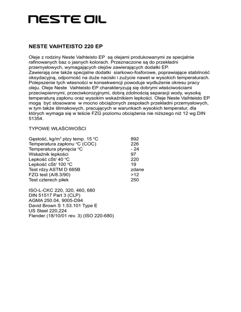 NESTE VAIHTEISTO 220 EP Oleje z rodziny Neste Vaihteisto EP są olejami produkowanymi ze specjalnie rafinowanych baz o jasnych kolorach. Przeznaczone są do przekładni przemysłowych, wymagających olejów zawierających dodatki EP. Zawierają one także specjalne dodatki siarkowo-fosforowe, poprawiające stabilność oksydacyjną, odporność na duże naciski i zużycie nawet w wysokich temperaturach. Polepszenie tych własności w konsekwencji powoduje wydłużenie okresu pracy oleju. Oleje Neste Vaihteisto EP charakteryzują się dobrymi właściwościami przeciwpiennymi, przeciwkorozyjnymi, dobrą zdolnością separacji wody, wysoką temperaturą zapłonu oraz wysokim wskaźnikiem lepkości. Oleje Neste Vaihteisto EP mogą być stosowane w mocno obciążonych zespołach przekładni przemysłowych, w tym także ślimakowych, pracujących w warunkach wysokich temperatur, dla których wymaga się w teście FZG poziomu obciążenia nie niższego niż 12 wg DIN 51354. TYPOWE WŁAŚCIWOŚCI Gęstość, kg/m3 ptzy temp. 15 оС Temperatura zapłonu oC (COC) Temperatura płynięcia oC Wskaźnik lepkości Lepkość cSt/ 40 oC Lepkość cSt/ 100 oC Test rdzy ASTM D 665B FZG test (A/8.3/90) Test czterech piłek ISO-L-CKC 220, 320, 460, 680 DIN 51517 Part 3 (CLP) AGMA 250.04, 9005-D94 David Brown S 1.53.101 Type E US Steel 220,224 Flender (18/10/01 rev. 3) (ISO 220-680) 892 226 - 24 97 220 19 zdane >12 250
