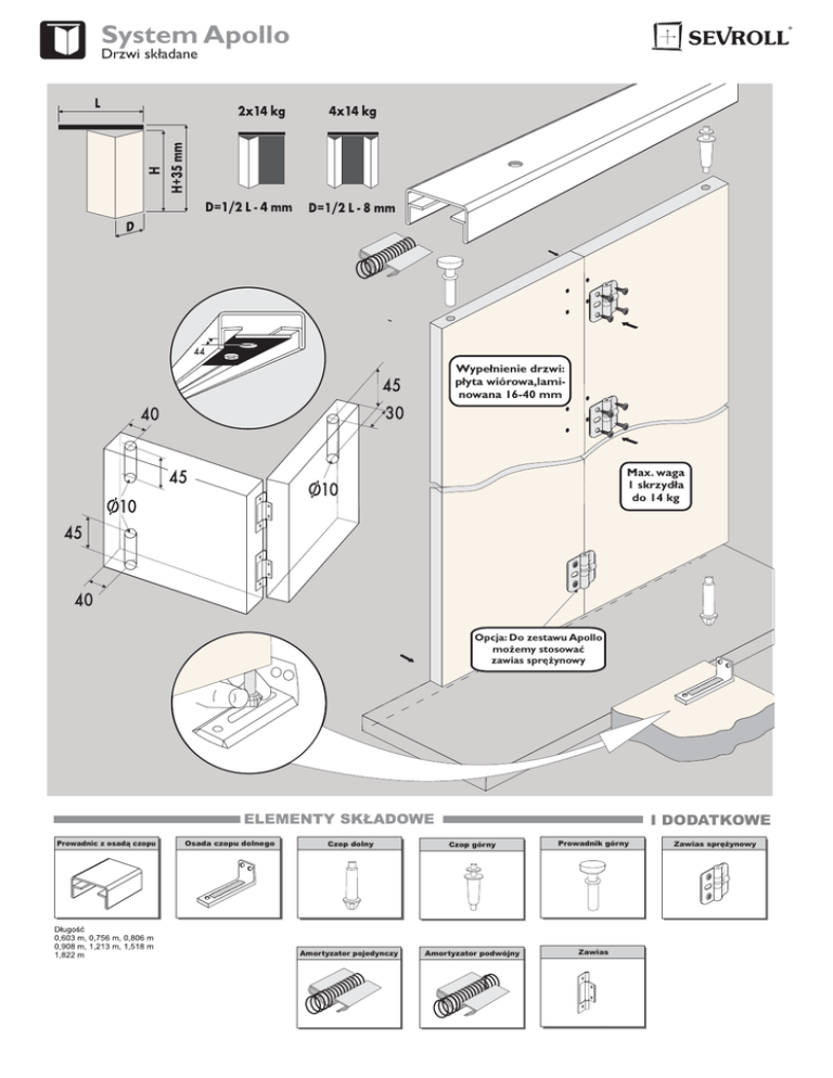 System Apollo Drzwi składane Wypełnienie drzwi: płyta wiórowa,laminowana 16-40 mm Max. waga 1 skrzydła do 14 kg Opcja: Do zestawu Apollo możemy stosować zawias sprężynowy I DODATKOWE Prowadnic z osadą czopu Osada czopu dolnego Czop dolny Czop górny Prowadnik górny Amortyzator pojedynczy Amortyzator podwójny Zawias Zawias sprężynowy