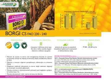 BORGI CS FAO 230 - 240 • Polecana do uprawy na ziarno oraz energetyczną kiszonkę (w uprawie na kiszonkę cechuje się większą strawnością dzięki przedłużonej zieloności liści) • Średni plon ziarna ok. 120 dt/ha w badaniach rozpoznawczych COBORU/ PZPK w serii ziarnowej w 2012 roku • Odmiana z mocnym wigorem początkowym tolerancyjna na wiosenne chłody • Wyjątkowa stabilność plonowania na ziarno dzięki zdolności adaptacji do zmiennych warunków glebowych BORGI CS fao 230 - 240 NKA PRZE Z PRZE Z AZ R BI O www.caussade-nasiona.pl suchej masy z ha odmiany Średnio wczesne • Wysoka zdrowotność roślin i ziarna od siewu do zbiorów morfologia i genetyka: wymagania glebowe: zalecana obsada roślin: mieszaniec trójliniowy, ziarno typu flint-dent, rośliny wysokie, bogato ulistnione z efektem stay-green polecana do uprawy na wszystkich kompleksach glebowych utrzymanych w dobrej kulturze rolnej 79 000 – 85 000 szt./ha CZENIE NA O ZIA CZENIE NA G N O PRZE Z przeznaczenie: CZENIE NA 10 • Wysoko oceniana w doświadczeniach polowych pod względem wydajnośc KIS Z • Polecana do uprawy na ziarno oraz energetyczną kiszonkę (w uprawie na kiszonkę cechuje się większą strawnością dzięki przedłużonej zieloności liści). • Odmiana z mocnym wigorem początkowym, tolerancyjna na wiosenne chłody. • Wyjątkowa stabilność plonowania na ziarno, dzięki zdolności adaptacji do zmiennych warunków glebowych. • Wysoko oceniana w doświadczeniach polowych pod względem wydajności suchej masy z ha. • Wysoka zdrowotność roślin i ziarna od siewu do zbiorów. www.caussade-nasiona.pl Wyniki Plonowania na ziarno 2015 – Caussade Strips Trial Station Strzelin (doświadczenie ścisłe): plon ziarna 73,4 dt/ha przy 14% wody (wilgotność podczas zbioru 26,3%) (w suchym, niekorzystnym dla uprawy kukurydzy sezonie) 2016 – Caussade Strips Trial Station Mikoszów (doświadczenia ścisłe): plon ziarna = 111 dt/ha przy 14% wody (wilgotność podczas zbioru 21,6%) Wyniki Plonowania na kiszonkę 2012 – w doświadczeniach rozpoznawczych COBORU/PZPK: plon ogólny suchej masy 207,1 dt/ha 2016 – Caussade Strips Trial Station Pawłowice (doświadczenia ścisłe): 106% wzorca = plon świeżej masy 566 dt/ha (plon suchej masy = 250,1 dt/ha)