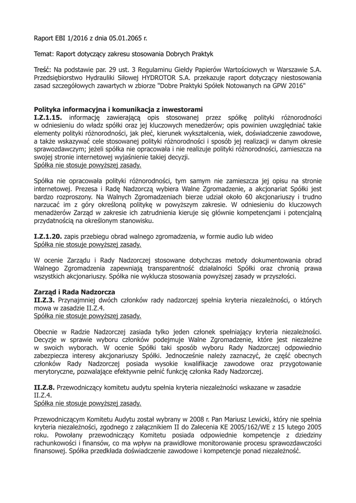 Raport EBI 1/2016 z dnia 05.01.2065 r. Temat: Raport dotyczący zakresu stosowania Dobrych Praktyk Treść: Na podstawie par. 29 ust. 3 Regulaminu Giełdy Papierów Wartościowych w Warszawie S.A. Przedsiębiorstwo Hydrauliki Siłowej HYDROTOR S.A. przekazuje raport dotyczący niestosowania zasad szczegółowych zawartych w zbiorze "Dobre Praktyki Spółek Notowanych na GPW 2016" Polityka informacyjna i komunikacja z inwestorami I.Z.1.15. informację zawierającą opis stosowanej przez spółkę polityki różnorodności w odniesieniu do władz spółki oraz jej kluczowych menedżerów; opis powinien uwzględniać takie elementy polityki różnorodności, jak płeć, kierunek wykształcenia, wiek, doświadczenie zawodowe, a także wskazywać cele stosowanej polityki różnorodności i sposób jej realizacji w danym okresie sprawozdawczym; jeżeli spółka nie opracowała i nie realizuje polityki różnorodności, zamieszcza na swojej stronie internetowej wyjaśnienie takiej decyzji. Spółka nie stosuje powyższej zasady. Spółka nie opracowała polityki różnorodności, tym samym nie zamieszcza jej opisu na stronie internetowej. Prezesa i Radę Nadzorczą wybiera Walne Zgromadzenie, a akcjonariat Spółki jest bardzo rozproszony. Na Walnych Zgromadzeniach bierze udział około 60 akcjonariuszy i trudno narzucać im z góry określoną politykę w powyższym zakresie. W odniesieniu do kluczowych menadżerów Zarząd w zakresie ich zatrudnienia kieruje się głównie kompetencjami i potencjalną przydatnością na określonym stanowisku. I.Z.1.20. zapis przebiegu obrad walnego zgromadzenia, w formie audio lub wideo Spółka nie stosuje powyższej zasady. W ocenie Zarządu i Rady Nadzorczej stosowane dotychczas metody dokumentowania obrad Walnego Zgromadzenia zapewniają transparentność działalności Spółki oraz chronią prawa wszystkich akcjonariuszy. Spółka nie wyklucza stosowania powyższej zasady w przyszłości. Zarząd i Rada Nadzorcza II.Z.3. Przynajmniej dwóch członków rady nadzorczej spełnia kryteria niezależności, o których mowa w zasadzie II.Z.4. Spółka nie stosuje powyższej zasady. Obecnie w Radzie Nadzorczej zasiada tylko jeden członek spełniający kryteria niezależności. Decyzje w sprawie wyboru członków podejmuje Walne Zgromadzenie, które jest niezależne w swoich wyborach. W ocenie Spółki taki sposób wyboru Rady Nadzorczej odpowiednio zabezpiecza interesy akcjonariuszy Spółki. Jednocześnie należy zaznaczyć, że część obecnych członków Rady Nadzorczej posiada wysokie kwalifikacje zawodowe oraz przygotowanie merytoryczne, pozwalające efektywnie pełnić funkcję członka Rady Nadzorczej. II.Z.8. Przewodniczący komitetu audytu spełnia kryteria niezależności wskazane w zasadzie II.Z.4. Spółka nie stosuje powyższej zasady. Przewodniczącym Komitetu Audytu został wybrany w 2008 r. Pan Mariusz Lewicki, który nie spełnia kryteria niezależności, zgodnego z załącznikiem II do Zalecenia KE 2005/162/WE z 15 lutego 2005 roku. Powołany przewodniczący Komitetu posiada odpowiednie kompetencje z dziedziny rachunkowości i finansów, co ma wpływ na prawidłowe monitorowanie procesu sprawozdawczości finansowej. Spółka przedkłada doświadczenie zawodowe i kompetencje ponad niezależność. Walne zgromadzenie i relacje z akcjonariuszami IV.Z.2. Jeżeli jest to uzasadnione z uwagi na strukturę akcjonariatu spółki, spółka zapewnia powszechnie dostępną transmisję obrad walnego zgromadzenia w czasie rzeczywistym. Spółka nie stosuje powyższej zasady. Spółka oświadcza, że nie będzie zapewniała transmisji obrad walnego zgromadzenia w czasie rzeczywistym. Wynika to z nie uchwalenia przez Walne Zgromadzenie Akcjonariuszy w dniu 26.06.2010 roku zmian w Statucie oraz Regulaminie WZA, dopuszczających transmitowanie obrad WZA z wykorzystaniem sieci internet, rejestrowania przebiegu oraz upubliczniania go na stronie internetowej Spółki. Decyzja jest uzasadniona strukturą akcjonariatu, gdyż kilku największych akcjonariuszy i znaczna większość mniejszych akcjonariuszy, którzy w zdecydowanej większości są obecnymi lub byłymi pracownikami spółki, zawsze uczestniczy osobiście w zgromadzeniach. Dotychczasowy brak głosów ze strony pozostałych akcjonariuszy instytucjonalnych oraz indywidualnych o konieczności wprowadzenia tego typu transmisji, budzi przekonanie, że transmisja obrad Walnego Zgromadzenia w czasie rzeczywistym jest niecelowa. W przypadku pojawienia się ze strony akcjonariuszy życzenia takiej formy transmisji, Zarząd przedstawi propozycje uchwał w tym zakresie na Walnym Zgromadzeniu. Prezes Zarządu: Wacław Kropiński Członek Zarządu: Mariusz Lewicki