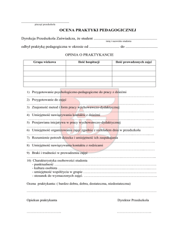 ................................................. pieczęć przedszkola OCENA PRAKTYKI PEDAGOGICZNEJ Dyrekcja Przedszkola Zaświadcza, że student ................................................................. imię i nazwisko studenta odbył praktykę pedagogiczna w okresie od ............................... do ................................. OPINIA O PRAKTYKANCIE Grupa wiekowa Ilość hospitacji Ilość prowadzonych zajęć 1) Przygotowanie psychologiczno-pedagogiczne do pracy z dziećmi ……………………………………………………………………………………….…… 2) Przygotowanie do zajęć …………………………………………………………………………………….……… 3) Znajomość metod i form pracy wychowawczo-dydaktycznej ……………………………………………………………………………..………….….. 4) Umiejętność nawiązywania kontaktu z dziećmi ………………………………………………………………………….……………..…. 5) Przejawiana inicjatywa w pracy wychowawczo-dydaktycznej ………………………………………………………………………………………….… 6) Umiejętność organizowania zajęć zgodnie z rozkładem dnia w przedszkolu ……………………………………………………………………………..…………..…. 7) Rozumienie potrzeb dziecka i umiejętność ich zaspakajania …………………………………………………………………………………………….. 8) Umiejętność nawiązywania kontaktu z rodzicami ……………………………………………………………………………………..……… 9) Braki i trudności w prowadzeniu zajęć …………………………………………………………………….……………………….. 10) Charakterystyka osobowości studenta - punktualność …………………………………………………………………………. - kultura osobista ……………………………………………….……..…………..…… - umiejętność współżycia w grupie ……………………………………………………. - stosunek do wyznaczonych zajęć. ……………………………………………………. Ocena praktykanta: ( bardzo dobra, dobra, dostateczna, niedostateczna) ……………………………………………………………………………………………… Opiekun praktykanta Dyrektor Przedszkola ……………………….. ………………………..