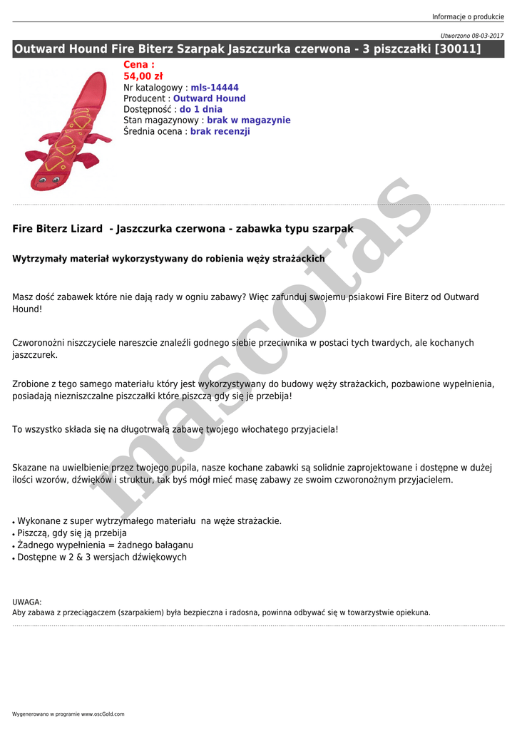 Informacje o produkcie Utworzono 08-03-2017 Outward Hound Fire Biterz Szarpak Jaszczurka czerwona - 3 piszczałki [30011] Cena : 54,00 zł s Nr katalogowy : mls-14444 Producent : Outward Hound Dostępność : do 1 dnia Stan magazynowy : brak w magazynie Średnia ocena : brak recenzji co ta Fire Biterz Lizard - Jaszczurka czerwona - zabawka typu szarpak Wytrzymały materiał wykorzystywany do robienia węży strażackich Masz dość zabawek które nie dają rady w ogniu zabawy? Więc zafunduj swojemu psiakowi Fire Biterz od Outward Hound! Czworonożni niszczyciele nareszcie znaleźli godnego siebie przeciwnika w postaci tych twardych, ale kochanych jaszczurek. m as Zrobione z tego samego materiału który jest wykorzystywany do budowy węży strażackich, pozbawione wypełnienia, posiadają niezniszczalne piszczałki które piszczą gdy się je przebija! To wszystko składa się na długotrwałą zabawę twojego włochatego przyjaciela! Skazane na uwielbienie przez twojego pupila, nasze kochane zabawki są solidnie zaprojektowane i dostępne w dużej ilości wzorów, dźwięków i struktur, tak byś mógł mieć masę zabawy ze swoim czworonożnym przyjacielem. ● ● ● ● Wykonane z super wytrzymałego materiału na węże strażackie. Piszczą, gdy się ją przebija Żadnego wypełnienia = żadnego bałaganu Dostępne w 2 & 3 wersjach dźwiękowych UWAGA: Aby zabawa z przeciągaczem (szarpakiem) była bezpieczna i radosna, powinna odbywać się w towarzystwie opiekuna. Wygenerowano w programie www.oscGold.com