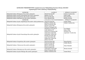 KONKURSY PRZEDMIOTOWE organizowane przez Małopolskiego Kuratora Oświaty 2014/2015 -najważniejsza forma rywalizacji międzyszkolnej: KONKURS Małopolski Konkurs Biologiczny dla uczniów gimnazjów Małopolski Konkurs Języka Francuskiego dla uczniów gimnazjów Małopolski Konkurs Geograficzny dla uczniów gimnazjów Małopolski Konkurs Matematyczny dla uczniów gimnazjów KONKURS Małopolski Konkurs Języka Angielskiego dla uczniów szkoły podstawowej Małopolski Konkurs Biologiczny dla uczniów gimnazjów Małopolski Konkurs Języka Francuskiego dla uczniów gimnazjów Małopolski Konkurs Geograficzny dla uczniów gimnazjów Małopolski Konkurs Historyczny dla uczniów gimnazjów Małopolski Konkurs Matematyczny dla uczniów gimnazjów Małopolski Konkurs Języka Polskiego dla uczniów gimnazjów LAUREAT Michał Górecki IIIF Barbara Frey IIF Piotr Zawiślan IID Piotr Olkuśnik IIID OPIEKUN NAUKOWY Jolanta Czuchnowska Marta Gołąb Kinga Rokicka Bożena Jeziorek FINALISTA ETAPU WOJEWÓDZKIEGO OPIEKUN NAUKOWY Wojciech Smoła 6b Joanna Wadas Barbara Cybulska IIG Jolanta Czuchnowska Daniel Wojtaszek IIID Michał Catania IIIG Wiktoria Domagała IIIG Magdalena Folwarska IF Ewa Brągiel Anna Jakóbska IIF Marta Gołąb Gabriela Szczepanek IIID Wioletta Lasa Aleksandra Trojak IIIF Agnieszka Czechowska Aleksandra Wałach IIIF Klaudia Postolska IIIF Anna Radwańska IIIF Małgorzata Cebula IIIF Milena Firlit IIIF Wojciech Pasek IID Kinga Rokicka Wojciech Pasek IID Jolanta Ślęczka Bartosz Ostafin IIF Bartosz Sierant IIIC Marta Michalik Patryk Korpak IIID Aleksandra Ciastoń IIID Bożena Jeziorek Daniel Wojtaszek IIID Barbara Szaflarska IIIC Joanna Broda KONKURSY TEMATYCZNE organizowane przez Małopolskiego Kuratora Oświaty LAUREAT KONKURS Konkurs Historyczny dla uczniów gimnazjum "Upadek I Rzeczypospolitej - napoleońskie nadzieje i ład wiedeński (1764 - 1815)". U podstaw społeczeństwa obywatelskiego Biblijny Konkurs Tematyczny dla uczniów gimnazjum „Z Mądrością Proroków Przez Życie” KONKURS Konkurs Historyczny dla uczniów gimnazjum "Walka Polaków o niepodległość i granice w latach 1914-1921. Wielkie bitwy i bohaterowie wydarzeń" Konkurs Informatyczny dla uczniów gimnazjum "Rozwiązywanie problemów z wykorzystaniem komputera” Bartosz Sierant IIIC Magdalena Folwarska IF FINALISTA ETAPU WOJEWÓDZKIEGO OPIEKUN NAUKOWY Wioletta Ruda Ks. Piotr Pietruszka OPIEKUN NAUKOWY Michał Gałka IID Patryk Korpak IIID Jolanta Ślęczka Marta Michalik Grzegorz Gackowski IIID Konrad Kurzydym IIID Wojciech Wiercioch Gratulujemy! OSIĄGNIĘCIA NASZYCH UCZNIÓW W KONKURSACH I PRZEGLĄDACH POZASZKOLNYCH W ROKU SZKOLNYM 2014/2015 KONKURSY, TURNIEJE, PRZEGLĄDY – ICH ORGANIZATORZY IX edycja ogólnopolskiego konkursu plastycznego „Podróże po Polsce” Przedszkole Samorządowe nr 22 Kraków, Lena Gajdzik 1c Przykopy 10 Ogólnopolski konkurs na projekt robota dla Im Jan Kopacz 2a dzieci ze szkół podstawowych; Akademia IIm Lidia Unrug 2a LAUREACI Wyróżnienie: NAUCZYCIELE– OPIEKUNOWIE Iwona Włodarz Katarzyna Tabor Profesora Trybika - Akademicki Inkubator Przedsiębiorczości Politechniki Krakowskiej Konkurs małopolski „Drogi do niepodległości” Dom Kultury Podgórze III m Szymon Jeleń 2a Wyróżnienie: Jan Kopacz, Paweł Łakatosz 2a, Weronika Wrona 2c Kategoria 6- 7 lat Kategoria 8- 9lat IIm Aleksandra Grabiec 1b Im Emilia Zawiślak 2b Małopolski konkurs „Barwy Jesieni” – edycja IIIm Zofia Jagieła, Róża Buchwic 1b XII Dom Kultury Soboniowice Wyróżnienie: Bartosz Mróz 2c Alicja Barnak 3a Twórczość plastyczna Twórczość poetycka Małopolski Przegląd Twórczości Dzieci Nagroda: IIIm Jan Wiśniewski 3a i Młodzieży „Triada 2015” – Mateusz Sawa 2c MD Kultury im. K.I. Gałczyńskiego Wyróżnienie: Krystian Zięcina 1a, Dominika Banaś 2b, Zuzanna Baczyńska 2c Nagroda: Wanda Cora, Anna Krzak, Zuzanna Wandas, 1a, Ola Grabiec 1b, Szymon Jeleń, Adam Kijewski, Jan Kopacz, Łucja Pasternak, Lidia Dzielnicowy konkurs plastyczny "Nasza Unrug, Kacper Sikora 2a, Dominika Banaś 2b, Bartek Czerwonka, choinka" Dom Kultury Dwór Czeczów Jakub Hajduk, Bartosz Mróz, Weronika Wrona, Mateusz Sawa 2c, Alicja Barnak, Alicja Czechowska, Wojciech Jankowicz, Krzysztof Krupa, Alicja Młynek, Jan Wiśniewski 3a Konkurs fotograficzny „Zimą malowane” DK Nagroda: Podgórze Magdalena Drąg, Julia Strąg 1a, Dominika Banaś 2b Krakowska Rodzina 2015 Nasze Miejsce w Krakowie MDK „Dom Harcerza” Im Maja Guzik - Michalec 1b IIIm Wanda Cora 1a, Jan Kopacz 2a V edycja Festiwalu Teatralnego Bajkolandiaprzedstawienie "Brzydkie kaczątko" Im klasa 1c ZS im. Brata Alojzego Kosiby w Wieliczce Katarzyna Tabor Renata Nizioł Marta Ziobro Halina Dąbrowska Grażyna Łuczak Marta Kąkol Marta Ziobro Halina Dąbrowska Marta Kąkol Renata Nizioł Marta Ziobro Halina Dąbrowska Marta Kąkol Grażyna Łuczak Renata Nizioł Katarzyna Tabor Marta Ziobro Halina Dąbrowska Renata Nizioł Grażyna Łuczak Renata Nizioł Katarzyna Tabor Iwona Włodarz Halina Błoniarz Międzyszkolny konkurs plastyczny "Aniołowo" ZSP nr 2 ul. Zamojskiego Konkurs plastyczny „ Wielkanoc” Dom Kultury „Dwór Czeczów” Nagroda: Magdalena Drąg, Julia Gaździk, Weronika Piotrowska, Julia Strąg 1a Nagroda: Wanda Cora, Magdalena Drąg, Marika Głuszak, Wojciech Kropiowski, Anna Krzak, Sebastian Mendyk, Bartek Preisner, Lena Przybyś, Zuzanna Wandas1a Róż Buchwic, Maria Gołąbek, Franek Górny, Blanka Hudy1b Maria Anuszkiewicz, Paweł Łakatosz, Grzegorz Pawłowski, Lidia Unrug, Kacper Sikora 2a Dominika Banaś, Karolina Kowalska, Ala Miłek, Emilka Rodecka, Wiktoria Rzepecka 2b Zuzanna Baczyńska, Rozalia Duda, Kuba Hajduk, Maja Fedoryszak, Olga Krzyworzeka, Maja Orzechowska, Kalian Płonka, Mateusz Sawa 2c Alicja Cielecka, Wojtek Jankowicz, Alicja Młynek, Piotr Natanek, Maciek Orlewski, Antek Sawa, Jan Wiśniewski 3a Konkurs dzielnicowy „Tak widzę Kraków” SP111 Marika Głuszak 1a, Róża Buchwic, 