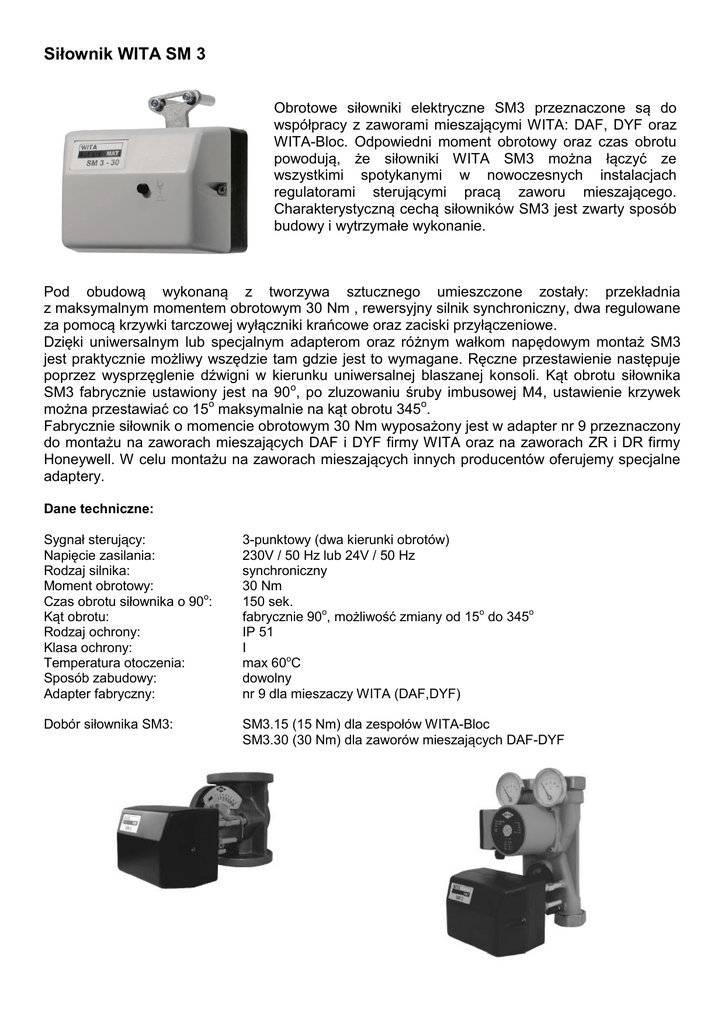 Siłownik WITA SM 3 Obrotowe siłowniki elektryczne SM3 przeznaczone są do współpracy z zaworami mieszającymi WITA: DAF, DYF oraz WITA-Bloc. Odpowiedni moment obrotowy oraz czas obrotu powodują, że siłowniki WITA SM3 można łączyć ze wszystkimi spotykanymi w nowoczesnych instalacjach regulatorami sterującymi pracą zaworu mieszającego. Charakterystyczną cechą siłowników SM3 jest zwarty sposób budowy i wytrzymałe wykonanie. Pod obudową wykonaną z tworzywa sztucznego umieszczone zostały: przekładnia z maksymalnym momentem obrotowym 30 Nm , rewersyjny silnik synchroniczny, dwa regulowane za pomocą krzywki tarczowej wyłączniki krańcowe oraz zaciski przyłączeniowe. Dzięki uniwersalnym lub specjalnym adapterom oraz różnym wałkom napędowym montaż SM3 jest praktycznie możliwy wszędzie tam gdzie jest to wymagane. Ręczne przestawienie następuje poprzez wysprzęglenie dźwigni w kierunku uniwersalnej blaszanej konsoli. Kąt obrotu siłownika SM3 fabrycznie ustawiony jest na 90o, po zluzowaniu śruby imbusowej M4, ustawienie krzywek można przestawiać co 15o maksymalnie na kąt obrotu 345o. Fabrycznie siłownik o momencie obrotowym 30 Nm wyposażony jest w adapter nr 9 przeznaczony do montażu na zaworach mieszających DAF i DYF firmy WITA oraz na zaworach ZR i DR firmy Honeywell. W celu montażu na zaworach mieszających innych producentów oferujemy specjalne adaptery. Dane techniczne: Sygnał sterujący: Napięcie zasilania: Rodzaj silnika: Moment obrotowy: Czas obrotu siłownika o 90o: Kąt obrotu: Rodzaj ochrony: Klasa ochrony: Temperatura otoczenia: Sposób zabudowy: Adapter fabryczny: 3-punktowy (dwa kierunki obrotów) 230V / 50 Hz lub 24V / 50 Hz synchroniczny 30 Nm 150 sek. fabrycznie 90o, możliwość zmiany od 15o do 345o IP 51 I max 60oC dowolny nr 9 dla mieszaczy WITA (DAF,DYF) Dobór siłownika SM3: SM3.15 (15 Nm) dla zespołów WITA-Bloc SM3.30 (30 Nm) dla zaworów mieszających DAF-DYF Schemat wymiarowy Schemat podłączenia elektrycznego Po zdjęciu pokrywy dostępna jest listwa zaciskowa. Siłownik należy podłączyć według załączonych rysunków. Przewód 4 x 0.75