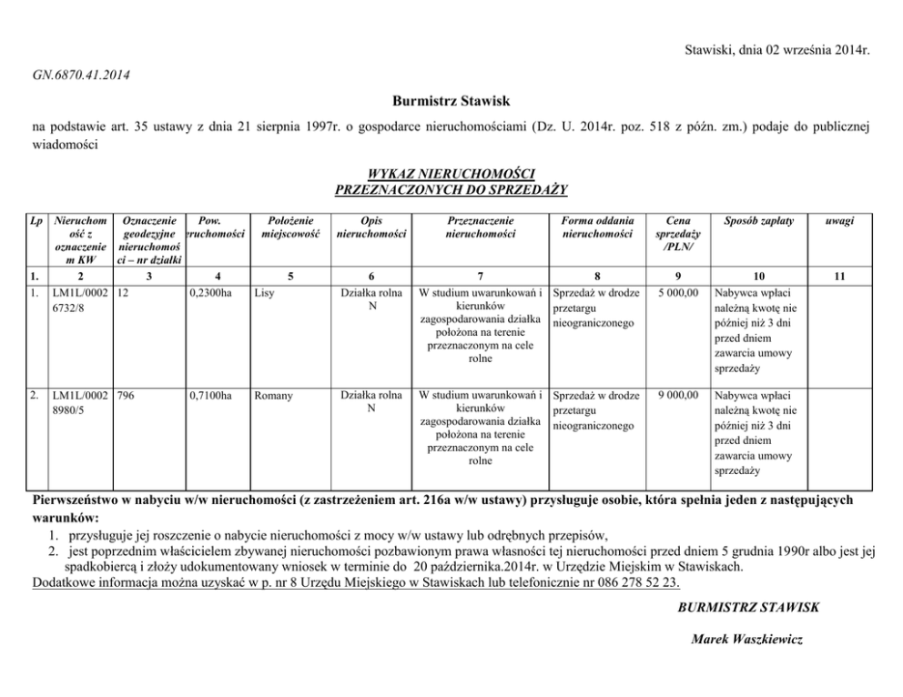 Stawiski, dnia 02 września 2014r. GN.6870.41.2014 Burmistrz Stawisk na podstawie art. 35 ustawy z dnia 21 sierpnia 1997r. o gospodarce nieruchomościami (Dz. U. 2014r. poz. 518 z późn. zm.) podaje do publicznej wiadomości WYKAZ NIERUCHOMOŚCI PRZEZNACZONYCH DO SPRZEDAŻY Lp 1. 1. 2. Nieruchom Oznaczenie Pow. Położenie ość z geodezyjnenieruchomości miejscowość oznaczenie nieruchomoś m KW ci – nr działki 2 3 4 5 LM1L/0002 12 0,2300ha Lisy 6732/8 LM1L/0002 796 8980/5 0,7100ha Romany Opis nieruchomości Przeznaczenie nieruchomości Forma oddania nieruchomości Cena sprzedaży /PLN/ Sposób zapłaty uwagi 11 6 Działka rolna N 7 8 W studium uwarunkowań i Sprzedaż w drodze kierunków przetargu zagospodarowania działka nieograniczonego położona na terenie przeznaczonym na cele rolne 9 5 000,00 10 Nabywca wpłaci należną kwotę nie później niż 3 dni przed dniem zawarcia umowy sprzedaży Działka rolna N W studium uwarunkowań i Sprzedaż w drodze kierunków przetargu zagospodarowania działka nieograniczonego położona na terenie przeznaczonym na cele rolne 9 000,00 Nabywca wpłaci należną kwotę nie później niż 3 dni przed dniem zawarcia umowy sprzedaży Pierwszeństwo w nabyciu w/w nieruchomości (z zastrzeżeniem art. 216a w/w ustawy) przysługuje osobie, która spełnia jeden z następujących warunków: 1. przysługuje jej roszczenie o nabycie nieruchomości z mocy w/w ustawy lub odrębnych przepisów, 2. jest poprzednim właścicielem zbywanej nieruchomości pozbawionym prawa własności tej nieruchomości przed dniem 5 grudnia 1990r albo jest jej spadkobiercą i złoży udokumentowany wniosek w terminie do 20 października.2014r. w Urzędzie Miejskim w Stawiskach. Dodatkowe informacja można uzyskać w p. nr 8 Urzędu Miejskiego w Stawiskach lub telefonicznie nr 086 278 52 23. BURMISTRZ STAWISK Marek Waszkiewicz