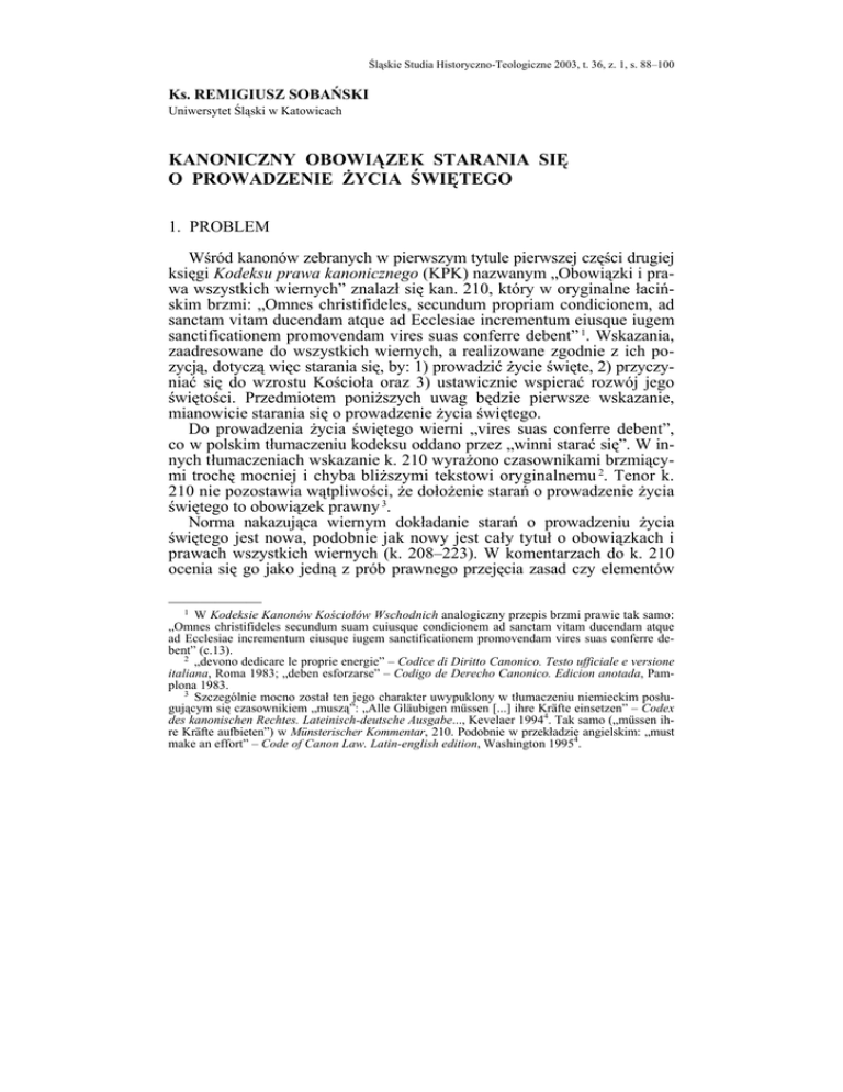 Śląskie Studia Historyczno-Teologiczne 2003, t. 36, z. 1, s. 88–100 Ks. REMIGIUSZ SOBAŃSKI Uniwersytet Śląski w Katowicach KANONICZNY OBOWIĄZEK STARANIA SIĘ O PROWADZENIE ŻYCIA ŚWIĘTEGO 1. PROBLEM Wśród kanonów zebranych w pierwszym tytule pierwszej części drugiej księgi Kodeksu prawa kanonicznego (KPK) nazwanym „Obowiązki i prawa wszystkich wiernych” znalazł się kan. 210, który w oryginalne łacińskim brzmi: „Omnes christifideles, secundum propriam condicionem, ad sanctam vitam ducendam atque ad Ecclesiae incrementum eiusque iugem sanctificationem promovendam vires suas conferre debent” 1. Wskazania, zaadresowane do wszystkich wiernych, a realizowane zgodnie z ich pozycją, dotyczą więc starania się, by: 1) prowadzić życie święte, 2) przyczyniać się do wzrostu Kościoła oraz 3) ustawicznie wspierać rozwój jego świętości. Przedmiotem poniższych uwag będzie pierwsze wskazanie, mianowicie starania się o prowadzenie życia świętego. Do prowadzenia życia świętego wierni „vires suas conferre debent”, co w polskim tłumaczeniu kodeksu oddano przez „winni starać się”. W innych tłumaczeniach wskazanie k. 210 wyrażono czasownikami brzmiącymi trochę mocniej i chyba bliższymi tekstowi oryginalnemu 2. Tenor k. 210 nie pozostawia wątpliwości, że dołożenie starań o prowadzenie życia świętego to obowiązek prawny 3. Norma nakazująca wiernym dokładanie starań o prowadzeniu życia świętego jest nowa, podobnie jak nowy jest cały tytuł o obowiązkach i prawach wszystkich wiernych (k. 208–223). W komentarzach do k. 210 ocenia się go jako jedną z prób prawnego przejęcia zasad czy elementów —————— 1 W Kodeksie Kanonów Kościołów Wschodnich analogiczny przepis brzmi prawie tak samo: „Omnes christifideles secundum suam cuiusque condicionem ad sanctam vitam ducendam atque ad Ecclesiae incrementum eiusque iugem sanctificationem promovendam vires suas conferre debent” (c.13). 2 „devono dedicare le proprie energie” – Codice di Diritto Canonico. Testo ufficiale e versione italiana, Roma 1983; „deben esforzarse” – Codigo de Derecho Canonico. Edicion anotada, Pamplona 1983. 3 Szczególnie mocno został ten jego charakter uwypuklony w tłumaczeniu niemieckim posługującym się czasownikiem „muszą”: „Alle Gläubigen müssen [...] ihre Kräfte einsetzen” – Codex des kanonischen Rechtes. Lateinisch-deutsche Ausgabe..., Kevelaer 19944. Tak samo („müssen ihre Kräfte aufbieten”) w Münsterischer Kommentar, 210. Podobnie w przekładzie angielskim: „must make an effort” – Code of Canon Law. Latin-english edition, Washington 19954. KANONICZNY OBOWIĄZEK STARANIA SIĘ O PROWADZENIE ŻYCIA ŚWIĘTEGO 89 eklezjologicznych rozproszonych w tekstach soborowych 4, a określony w nim obowiązek postrzega się jako wypływający z uczestnictwa w posłannictwie Chrystusa 5. Podczas gdy niektórzy autorzy uznają prawo Kościoła do ingerowania w sferę religijną człowieka 6, to jednak nie brak autorów, którzy – podchodząc do zagadnienia z punktu widzenia prawnoteoretycznego – generalnie kwestionują formułowanie obowiązków religijnych i etycznych jako normy prawa kanonicznego. Uważają oni ubieranie wymogów religijnych czy etycznych w szaty prawa za niebezpieczne i szkodliwe, gdyż może to prowadzić do wyłącznie formalnego ich spełniania, przez co pozostają bez wartości etycznej 7. Wedle niektórych udzielanie kanonicznych wskazań dotyczących osobistego życia wiernych miało sens w czasach, gdy prawo odgrywało znaczną rolę edukacyjną i było busolą w sprawach codziennego życia 8. Znacznie głębiej sięga – idąca w tym samym kierunku – argumentacja wykazująca, że przedmiotem prawa kościelnego mogą być wyłącznie (podobnie jak w prawie świeckim) intersubiektywne relacje, dające się wyrazić we wzajemnych roszczeniach i zobowiązaniach, a nie należą do nich dyspozycje religijne czy etyczne, gdyż te mają swoje miejsce na płaszczyźnie znacznie głębszej, nie poddającej się unormowaniu prawnemu 9. Jak z tego widać, podważa się nie tylko stosowność kanonicznej regulacji wymogów religijnych i etycznych, lecz także ich podatność na takie regulacje. Właśnie tą kwestią zamierzamy się zająć. 2. NORMY „Norma” należy do pojęć wciąż dyskutowanych 10. Roboczo możemy oprzeć się na opisowej definicji normy jako reguły zachowania, występu—————— 4 E. C o r e c c o, Der Katalog der Pflichten und Rechte des Gläubigen im CIC, [w:] Ministerium Iustitiae. Festschrift für Heribert Heinemann zur Vollendung des 60. Lebensjahres, Red. A. Gabriels, H. J. F. Reinhardt, Essen 1985, s. 186; D. C e n a l m o r, [w:] Comentario exegetico al Codigo de Derecho Canonico, Pamplona 1995, II, s. 74. 5 Np. H. J. R e i n h a r d t, [w:] Münsterischer Kommentar, 210, 1. 6 W. A y m a n s, ‘Munus’ und ‘sacra potestas’, [w:] Les Droits Fondamentaux du Chrétien dans l’Église et dans la société. Actes du Ive Congrès International de Droit Canonique Fribourg (Suisse) 6.–11.X.1990, eds. E. Corecco, N. Herzog, A. Scola, Fribourg–Freiburg–Milano 1981, s. 192. 7 Tak np. M. K a i s e r, Die Rolle des Gesetzgebers in der Kirche. Überlegungen im Hinblick auf die Revision des kirchlichen Gesetzbuches, [w:] Ius Populi Dei, Miscellanea in honorem Raymondi Bidagor, red. U. Navarette, Roma 1972, I, s. 473. 8 P. H u i z i n g, Reichweite und Grenzen das positiven Rechts im Vergleich zur Sittlichkeit, [w:] Recht und Sittlichkeit, Red. J. Gründel, Fribourg–Freiburg–Wien 1982, s. 113 (Studien zur theol. Ethik 10). 9 H.-J. H ö h n, Gnade vor Recht? Sozialtheoretische Überlegungen zu Ansatz und Aufbau einer Theologie des Kirchenrechts, „Freiburger Zeitschrift für Philosophie und Theologie” 33 (1986) 377. 10 R. S o b a ń s k i, Nauki podstawowe prawa kanonicznego, t. I: Teoria prawa kanonicznego, Warszawa 2001, s. 69–114. 90 Ks