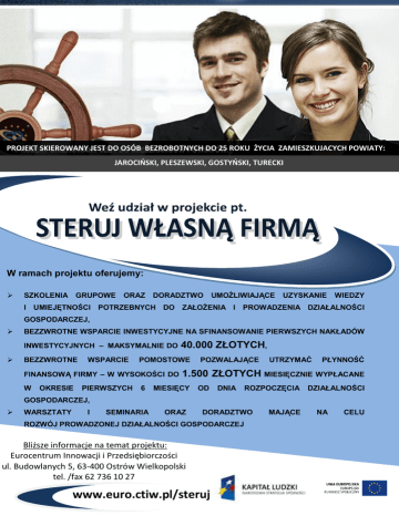 PROJEKT SKIEROWANY JEST DO OSÓB BEZROBOTNYCH DO 25 ROKU ŻYCIA ZAMIESZKUJACYCH POWIATY: JAROCIŃSKI, PLESZEWSKI, GOSTYŃSKI, TURECKI W ramach projektu oferujemy: SZKOLENIA GRUPOWE ORAZ DORADZTWO UMOŻLIWIAJĄCE UZYSKANIE WIEDZY I UMIEJĘTNOŚCI POTRZEBNYCH DO ZAŁOŻENIA I PROWADZENIA DZIAŁALNOŚCI GOSPODARCZEJ, BEZZWROTNE WSPARCIE INWESTYCYJNE NA SFINANSOWANIE PIERWSZYCH NAKŁADÓW INWESTYCYJNYCH – MAKSYMALNIE DO BEZZWROTNE WSPARCIE POMOSTOWE FINANSOWĄ FIRMY – W WYSOKOŚCI DO W OKRESIE PIERWSZYCH 40.000 ZŁOTYCH, 6 POZWALAJĄCE UTRZYMAĆ PŁYNNOŚĆ 1.500 ZŁOTYCH MIESIĘCZNIE WYPŁACANE MIESIĘCY OD DNIA ROZPOCZĘCIA DZIAŁALNOŚCI GOSPODARCZEJ, WARSZTATY I SEMINARIA ORAZ DORADZTWO ROZWÓJ PROWADZONEJ DZIAŁALNOŚCI GOSPODARCZEJ Bliższe informacje na temat projektu: Eurocentrum Innowacji i Przedsiębiorczości ul. Budowlanych 5, 63-400 Ostrów Wielkopolski tel. /fax 62 736 10 27 www.euro.ctiw.pl/steruj MAJĄCE NA CELU Eurocentrum Innowacji i Przedsiębiorczości ul. Budowlanych 5, 63-400 Ostrów Wielkopolski tel. /fax 62 736 10 27, tel. 62 735 06 68 Eurocentrum Innowacji i Przedsiębiorczości jest stowarzyszeniem naukowo – technicznym, którego działalność obejmuje usługi doradcze, szkoleniowe oraz usługi informacyjne. Dominującą formą świadczonych usług jest bogata oferta szkoleniowa dla różnych podmiotów gospodarczych oraz osób fizycznych. Ponadto oferujemy bezpłatne informacje w Punkcie Konsultacyjnym oraz Punkcie Europe Direct na temat dotacji unijnych oraz zasad prowadzenia działalności gospodarczej. Wysoką jakość usług gwarantuje certyfikat i akredytacja w Krajowym Systemie Usług – KSU. PN-EN ISO www.euro.ctiw.pl Projekt realizowany w ramach Działania 6.2 Programu Operacyjnego Kapitał Ludzki, współfinansowany przez Unię Europejską w ramach Europejskiego Funduszu Społecznego PUBLIKACJA DYSTRYBUOWANA BEZPŁATNIE 9001:2009