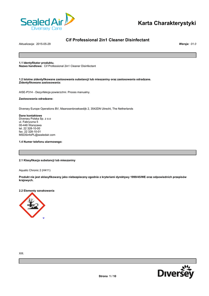 Karta Charakterystyki Cif Professional 2in1 Cleaner Disinfectant Wersja: 01.0 Aktualizacja: 2015-05-29 1.1 Identyfikator produktu. Nazwa handlowa: Cif Professional 2in1 Cleaner Disinfectant 1.2 Istotne zidentyfikowane zastosowania substancji lub mieszaniny oraz zastosowania odradzane. Zidentyfikowane zastosowania: AISE-P314 - Dezynfekcja powierzchni. Proces manualny. Zastosowania odradzane: Diversey Europe Operations BV, Maarssenbroeksedijk 2, 3542DN Utrecht, The Netherlands Dane kontaktowe Diversey Polska Sp. z o.o ul. Fabryczna 5 00-446 Warszawa tel. 22 328-10-00 fax. 22 328-10-01 [email protected] 1.4 Numer telefonu alarmowego: 2.1 Klasyfikacja substancji lub mieszaniny Aquatic Chronic 2 (H411) Produkt nie jest sklasyfikowany jako niebezpieczny zgodnie z kryteriami dyrektywy 1999/45/WE oraz odpowiednich przepisów krajowych. 2.2 Elementy oznakowania XIII. Strona 1 / 10 KARTA CHARAKTERYSTYKI Cif Professional 2in1 Cleaner Disinfectant 3.2 Mieszaniny Numer WE Numer CAS 270-325-2 68424-85-1 amoniowe, benzyl-C12-16-alkildimetyl, chlorki Numer REACH danych * Polimer. Wdychanie Kontakt z oczami: pierwszej pomocy: Wdychanie: Kontakt z oczami: substancji, patrz sekcja 11. alkoholu. 6.4 Odniesienia do innych sekcji Strona 2 / 10 Klasyfikacja zgodna z (WE) 1272/2008 Skin Corr. 1B (H314) Acute Tox. 4 (H302) Acute Tox. 4 (H312) Aquatic Acute 1 (H400) Aquatic Chronic 1 (H410) Klasyfikacja Xn;R21/22 C;R34 N;R50 Uwagi Procent wagowy 0.1-1 KARTA CHARAKTERYSTYKI Cif Professional 2in1 Cleaner Disinfectant pojemniku. Zalecane procedury monitorowania: chlorki chlorki chlorki krótkoterminowe skutki miejscowe krótkoterminowe skutki ogólnoustrojowe skutki miejscowe skutki ogólnoustrojowe danych danych danych danych krótkoterminowe skutki miejscowe krótkoterminowe skutki ogólnoustrojowe (mg / kg mc) skutki miejscowe skutki ogólnoustrojowe (mg / kg mc) danych danych danych danych krótkoterminowe skutki miejscowe krótkoterminowe skutki ogólnoustrojowe (mg / kg mc) skutki miejscowe skutki ogólnoustrojowe (mg / kg mc) danych danych danych danych krótkoterminowe skutki miejscowe krótkoterminowe skutki ogólnoustrojowe skutki miejscowe skutki ogólnoustrojowe danych danych danych danych krótkoterminowe skutki miejscowe krótkoterminowe skutki ogólnoustrojowe skutki miejscowe skutki ogólnoustrojowe danych danych danych danych Wody powierzchniowe, Okresowe (mg / l) Oczyszczalnia (mg / l) danych danych danych danych 3) chlorki 3) chlorki chlorki Strona 3 / 10 KARTA CHARAKTERYSTYKI Cif Professional 2in1 Cleaner Disinfectant chlorki Osady morskie (mg / kg) Gleba (mg / kg) W powietrzu (mg/m3) (mg / kg) danych danych danych danych produktu: Ochrona oczu / twarzy: konieczna. Ochrona dróg oddechowych: wód powierzchniowych i wód gruntowych. Metoda / uwaga Barwa: Przejrzysty, Purpurowy Zapach: Charakterystyczny Próg zapachu Nie dotyczy pH: Nie Dane dla substancji, temperatura wrzenia: Metoda (°C) > 107 atmosferyczne (hPa) Metody nie podano Metoda / uwaga Nie dotyczy. Podtrzymuje palenie: Nie dotyczy. Metoda / uwaga Metoda (Pa) Metody nie podano Temperatura (°C) 20 danych Metoda / uwaga 1.00 g/cm³ (20 °C) Metoda (g/l) Rozpuszczalny. Strona 4 / 10 Metody nie podano Temperatura (°C) KARTA CHARAKTERYSTYKI Cif Professional 2in1 Cleaner Disinfectant Metoda / uwaga 9.2. Inne informacje Korozja metali: Nie powoduje korozji SEKCJA 11: Informacje toksykologiczne Punkt Gatunek: Metoda Czas ekspozycji (h) Szczur Metody nie podano Gatunek: Metoda Szczur Metody nie podano Gatunek: Metoda (mg / kg) LD 50 398 Punkt Czas ekspozycji (h) (mg / kg) LD 50 800 - 1420 Punkt (mg / l) Czas ekspozycji (h) Brak danych Wynik Gatunek Metoda Metody nie podano Czas ekspozycji Wynik Gatunek Metoda Metody nie podano Czas ekspozycji Strona 5 / 10 KARTA CHARAKTERYSTYKI Cif Professional 2in1 Cleaner Disinfectant uszkodzenie. Wynik Gatunek Metoda Czas ekspozycji Gatunek Metoda Czas ekspozycji (h) danych. Wynik Nie uczulajacy. Wynik Metody nie podano Gatunek Metoda Czas ekspozycji danych Wynik (in vitro) Metoda Wynik (in vivo) (in vitro) OECD 471 (EU B.12/13) benzyl-C12-16-alkildimetyl, chlorki Metoda (in vivo) Zmiana Punkt Specyficzny efekt Gatunek Metoda Czas ekspozycji (mg / kg mc / d) Brak benzyl-C12-16-alkildim etyl, chlorki inne skutki danych Punkt Gatunek Metoda Czas ekspozycji (dni) Gatunek Metoda Czas ekspozycji (dni) Gatunek Metoda Czas ekspozycji (dni) (mg/kg bw/d) Brak benzyl-C12-16-alkildimetyl, chlorki danych Punkt (mg/kg bw/d) Brak benzyl-C12-16-alkildimetyl, chlorki danych Punkt (mg/kg bw/d) Brak benzyl-C12-16-alkildimetyl, chlorki danych Drogi Punkt Gatunek Metoda (mg/kg bw/d) Brak benzyl-C12-16-alkildim etyl, chlorki danych Strona 6 / 10 Czas ekspozycji (dni) Komentarze docelowe KARTA CHARAKTERYSTYKI Cif Professional 2in1 Cleaner Disinfectant Potencjalne szkodliwe skutki dla zdrowia i objawy SEKCJA 12: Informacje ekologiczne Punkt Gatunek Metoda Ryby Metody nie podano Gatunek Metoda Dafnia metody nie podano Gatunek Metoda badawcza Pseudokirchner iella subcapitata OECD 201 Gatunek Metoda Czas ekspozycji (dni) - Inokulum Metoda Osad czynny OECD 209 Czas ekspozycji 0.5 godzin (a) (y) (mg / l) LC 50 0.85 Punkt (mg / l) EC 50 0.02 Punkt (mg / l) EC 50 0.06 Punkt (mg / l) Brak Czas ekspozycji (h) 96 Czas ekspozycji (h) 48 Czas ekspozycji (h) 96 danych Punkt EC 20 Punkt (mg / l) 10 Gatunek Metoda Czas ekspozycji Zaobserwowano efekty Gatunek Metoda Czas ekspozycji Zaobserwowane skutki Gatunek Metoda Czas ekspozycji (dni) - Zaobserwowane skutki Gatunek Metoda Czas ekspozycji (dni) - Zaobserwowane skutki (mg / l) Brak benzyl-C12-16-alkildimetyl, chlorki danych Punkt (mg / l) Brak benzyl-C12-16-alkildimetyl, chlorki danych Punkt (mg / kg / dw osadu) Brak benzyl-C12-16-alkildimetyl, chlorki danych Punkt (mg / kg / dw gleby) Brak benzyl-C12-16-alkildimetyl, chlorki danych Strona 7 / 10 KARTA CHARAKTERYSTYKI Cif Professional 2in1 Cleaner Disinfectant Punkt Gatunek Metoda badawcza Czas ekspozycji (dni) - Zaobserwowane skutki Gatunek M