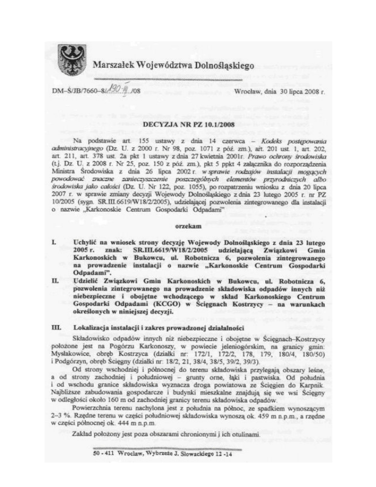 2 Działalność prowadzona na terenie składowiska obejmuje: kontrolę ilościową i jakościową dostarczanych na teren składowiska odpadów, mechaniczno–ręczne sortowanie zmieszanych odpadów komunalnych, doczyszczanie odpadów o charakterze surowcowym pochodzących ze zbiórki selektywnej, demontaŜ odpadów wielkogabarytowych, kompostowanie odpadów biodegradowalnych pochodzących ze zbiórki selektywnej oraz frakcji średniej wydzielonej podczas mechanicznego sortowania odpadów, odzysk niektórych rodzajów odpadów polegający na ich wykorzystaniu do tworzenia warstw izolacyjnych, rekultywacyjnych oraz budowy obwałowania wokół kwatery i ogroblowań w jej obrębie, unieszkodliwianie odpadów poprzez składowanie w kwaterze składowiska. IV. IV.1. Rodzaj instalacji i warunki eksploatacyjne Rodzaj i parametry instalacji Instalacją będącą przedmiotem niniejszego pozwolenia jest istniejące, nadpoziomowe docelowo czterosektorowe składowisko odpadów innych niŜ niebezpieczne i obojętne w Ścięgnach Kostrzycy. W obrębie składowiska wyodrębnia się: obecnie eksploatowany sektor 1, zrekultywowaną hałdę składowiskową, rezerwę terenu pod sektor 2, rezerwę terenu pod sektory 3 i 4. Sektor 1 obejmuje część starej kwatery składowiskowej oraz kwaterę czynną, obecnie eksploatowaną. Rozmieszczenie poszczególnych sektorów obrazuje załącznik nr 1. Składowisko wyposaŜone jest w system drenaŜu wód podziemnych, w skład którego wchodzą: – dwa główne ciągi – wschodni i zachodni, wykonane z rur kamionkowych perforowanych ø 150 mm, które łączą się w części północnej składowiska i jednym wylotem odprowadzają wody drenaŜowe do rowu północnego. Do głównych ciągów włączone są tzw. sięgacze, tj: – do ciągu zachodniego trzy sięgacze ø 110 mm – dwa pod czynną kwaterą sektora 1 i jeden na północnym przedpolu składowiska, – do ciągu wschodniego – jeden sięgacz ø 110 mm biegnący wzdłuŜ północnego przedpola składowiska. Wody drenaŜowe są jedynym źródłem zasilania rowu północnego, który przed wylotem tych wód jest suchy. Odcieki z terenu składowiska ujmowane są za pośrednictwem systemu drenaŜu odcieków – ciągu drenaŜowego ø 110 mm biegnącego wzdłuŜ wschodniej granicy składowiska (odbiornik odcieków z sektora 1 oraz starej hałdy składowiskowej), uchodzącego powyŜej starej hałdy składowiskowej do wspólnego przewodu zbiorczego o średnicy ø 160 mm, kierującego odcieki do pompowni (studnia betonowa ø 2m), a następnie do zbiornika retencyjnego (1700 m3, uszczelniony matą bentonitową i geomembraną PEHD o grubości 2 mm). Gromadzone w zbiorniku retencyjnym odcieki po napowietrzeniu są recyrkulowane na złoŜe odpadów, a ich nadmiar wywoŜony do oczyszczalni ścieków w Mysłakowicach. IV.1.1 Sektor 1 W skład sektora 1 wchodzi część starej, zrekultywowanej, czasowo zamkniętej hałdy składowiskowej oraz kwatera czynna, będąca obecnie miejscem eksploatacji. 3 IV.1.1.1. Czynna kwatera składowiska Zdolność przyjmowania odpadów do składowania w czynnej kwaterze sektora 1 wynosi 100 000 Mg/rok (ok. 400 Mg/dobę), jej pojemność wynosi 300 000 Mg. Kwatera zajmuje powierzchnię ok. 2,58 ha. Część kwatery o powierzchni ok. 1,4 ha została wykonana w płytkim wykopie (tzw. część podpoziomowa), natomiast pozostała część o pow. ok. 1,18 ha została umieszczona na powierzchni gruntu (tzw. część nadpoziomowa). Kwatera została uszczelniona w części podpoziomowej warstwą iłu o miąŜszości 0,5 m na dnie oraz 0,3 m na skarpach (współczynnik wodoprzepuszczalności 10-9 m/s), w części podpoziomowej matą bentonitową. Zarówno w części podpoziomowej, jak nadpoziomowej kolejną warstwą uszczelnienia jest geomembrana syntetyczna PEHD o grubości 2 mm przykryta geowłókniną. Na geowłókninie ułoŜono warstwę filtracyjnoochronną Ŝwirową (16/32 mm) o grubości 0,3 m, w której znajduje się drenaŜ odcieków wykonany z rur perforowanych PEHD ø 100 oraz ø 200 mm. Odcieki odprowadzane są następnie rurociągiem zbiorczym ø 110 ułoŜonym na zewnątrz kwatery w sposób omówiony w pkt IV.1 niniejszej decyzji. Dla odgazowania czynnej kwatery wykonywano 2 studnie odgazowujące nadbudowywane wraz z przyrostem miąŜszości złoŜa odpadów. Poziome warstwy izolacyjne rozdzielające warstwy odpadów, wykonane z materiału gruboziarnistego, pełnią dodatkową funkcję poziomego drenaŜu gazowego. Wokół całej kwatery wykonano obwałowanie ziemne o wysokości 2,5 m, które będzie nadbudowywane wraz z kolejnymi warstwami składowanych odpadów. IV.1.1.2. Stara kwatera składowiska Stara kwatera składowiska o powierzchni ok. 4,5 ha, została czasowo zamknięta i zrekultywowana. W ramach rekultywacji kwatery przeformowano jej bryłę nadając skarpom nachylenie 1:3 oraz uporządkowano gospodarkę wodną i odciekową przez: odtworzenie sieci rowów powierzchniowych poza złoŜem odpadów, odtworzenie warunków przepływu wód gruntowych spiętrzonych wskutek niewłaściwego składowania odpadów w przeszłości, obniŜenie zwierciadła wody gruntowej w miejscach jej spiętrzenia w okresach wysokich stanów (zastosowano 2 ciągi drenaŜowe wzdłuŜ północnej skarpy starej kwatery – pod dnem nowej kwatery nr 1), wykonanie drenaŜu wód zanieczyszczonych, umieszczonego wewnątrz kwatery, odprowadzającego te wody do drenaŜu odcieków z nowej kwatery 1 (zastosowano 1 przewód drenaŜowy odcieków, który włączony jest do zbiorczego przewodu drenaŜu odcieków z nowej i starej kwatery). Dla odcięcia dopływu wód opadowych do złoŜa starej kwatery wykonano na jej wierzchowinie pokrywę uszczelniająco – rekultywacyjną złoŜoną z: warstwy wyrównawczej piasku (połoŜonej bezpośrednio na odpadach) o miąŜszości 10 cm, geomembrany PEHD grubości 1 mm, geowłókniny o gramaturze 500 g/m2, warstwy podglebia o miąŜszości 30 cm, warstwy urodzajnej 5–10 cm. Zr