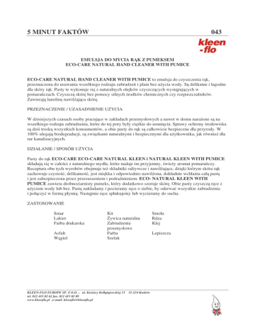 5 MINUT FAKTÓW 043 EMULSJA DO MYCIA R K Z PUMEKSEM ECO-CARE NATURAL HAND CLEANER WITH PUMICE ECO-CARE NATURAL HAND CLEANER WITH PUMICE to emulsja do czyszczenia r k, przeznaczona do usuwania wszelkiego rodzaju zabrudze i plam bez u ycia wody. S delikatne i łagodne dla skóry r k. Pasty te wykonuje si z naturalnych olejków czyszcz cych wyst puj cych w pomara czach. Czyszcz skór bez pomocy silnych rodków chemicznych czy rozpuszczalników. Zawieraj lanolin nawil aj ca skór . PRZEZNACZENIE / UZASADNIENIE U YCIA W dzisiejszych czasach osoby pracuj ce w zakładach przemysłowych a nawet w domu nara one s na wszelkiego rodzaju zabrudzenia, które do tej pory były ci kie do usuni cia. Sprawy ochrony rodowiska s dzi trosk wszystkich konsumentów, a obie pasty do r k s całkowicie bezpieczne dla przyrody. W 100% ulegaj biodegradacji, s zwi zkami naturalnymi i bezpiecznymi dla u ytkownika, jak równie dla rur kanalizacyjnych. DZIAŁANIE / SPOSÓB U YCIA Pasty do r k ECO-CARE ECO-CARE NATURAL KLEEN i NATURAL KLEEN WITH PUMICE składaj si w cało ci z naturalnego mydła, które nadaje im przyjemny, wie y aromat pomara czy. Receptura obu tych wyrobów obejmuje te składniki od ywcze i nawil aj ce, dzi ki którym skóra r k zachowuje czysto , delikatno , jest mi kka i odpowiednio nawil ona, dokładnie wchłania cał past i jest zabezpieczona przez przesuszeniem i podra nieniem. ECO- NATURAL KLEEN WITH PUMICE zawiera drobnoziarnisty pumeks, który dodatkowo szoruje skór . Obie pasty czyszcz r ce z u yciem wody lub bez. Past nakładamy i pocieramy r ce o siebie, by oderwa wszystkie zabrudzenia i poł czy w form płynn . Nast pnie r ce spłukujemy lub wycieramy do sucha. ZASTOSOWANIE Smar Lakier Farba drukarska Asfalt W giel Kit ywica naturalna Zabrudzenia przemysłowe Farba Szelak KLEEN-FLO EUROPE SP. Z O.O. ; ul. Ku nicy Kołł tajowskiej 13 31-234 Kraków tel. 012 415 02 63 fax. 012 415 02 09 www.kleenflo.pl ;e-mail: [email protected] Smoła Rdza Klej Lepiszcza 5 MINUT FAKTÓW 043 MIEJSCA ZASTOSOWANIA Pasty ECO-CARE ECO-CARE NATURAL KLEEN AND NATURAL KLEEN WITH PUMICE przeznaczony s do stosowania w takich miejscach jak: Punkty sprzeda y art. motoryzacyjnych Przystanie jachtowe Specjalistyczne punkty naprawcze Sklepy z artykułami przemysłowymi Sklepy spo ywcze Salony sprzeda y motocykli Kopalnie Hurtownie Stacje obsługi Salony samochodowe O rodki zaopatrzenia przemysłu Domy towarowe Sklepy dla majsterkowiczów Drukarnie Młyny Salony sprzeda y pojazdów niegowych KORZY CI DLA NABYWCY / ODBIORCY · rodek zawiera lanolin oraz substancje działaj ce wygładzaj co, regeneruj co i nawil aj co na skór . · Zło ony z naturalnych olejków czyszcz cych wyst puj cych w pomara czach. · Posiada oryginaln wo wie ych pomara czy. · Nietłusty, nie pozostawia adnej warstwy. · Nie zawiera silnych, szkodliwych rozpuszczalników. · rodek łatwo ulega rozkładowi. · Nie testowany na zwierz tach. · Bezwodny (stosowany z wod lub bez). · Do u ytku przez okr gły rok. · Stosowanie nie jest ograniczone do adnej pory roku. OPAKOWANIA: Nr katalogowy 043 4 x 3,5 l KLEEN-FLO EUROPE SP. Z O.O. ; ul. Ku nicy Kołł tajowskiej 13 31-234 Kraków tel. 012 415 02 63 fax. 012 415 02 09 www.kleenflo.pl ;e-mail: [email protected]