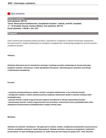 BDO - informacje o szkoleniu Opis szkolenia Dane o szkoleniu Kod szkolenia: 587716 Temat: Nowoczesne budżetowanie i zarządzanie kosztami - metody, techniki, narzędzia 17 - 18 Grudzień Poznań, Centrum Miasta, Kod szkolenia: 587716 Koszt szkolenia: 1190.00 + 23% VAT Program Celem szkolenia jest przekazanie praktycznej wiedzy i wykształcenie umiejętności w zakresie skutecznego zastosowania kluczowych technik i narzędzi budżetowania ze szczególnym uwzględnieniem nowoczesnego podejścia do rachunku kosztów i zarządzania kosztami. Adresaci: Szkolenie skierowane jest do menedżerów wyższego i średniego szczebla, podejmujących decyzje dotyczące budżetów, kosztów i rentowności, a także specjalistów tworzących i administrujących systemem controllingu i budżetowania (zarządzania). Korzyści: - uczestnicy poznają praktyczne aspekty, techniki i narzędzia budżetowania, w tym rachunku kosztów - umiejętności zdobyte w trakcie szkolenia powinny zwiększyć skuteczność działań w zakresie realizacji celów przedsiębiorstwa - poznane techniki i metody mogą skutecznie wspierać menedżerów w zakresie optymalizacji kosztów - prezentowane techniki i metody mogą przyczynić się do budowy i wzmocnienia kultury przedsiębiorstwa, która zabezpiecza funkcjonowanie przedsiębiorstwa w długim okresie czasu Metodyka: Szkolenie ma charakter interaktywny. Tam gdzie jest to możliwe, wiedza i umiejętności przekazywane są przy pomocy ćwiczeń, przykładów rynkowych i paneli dyskusyjnych. Wykłady natomiast, nasycone są anegdotami, metaforami i porównaniami. W myśl chińskiego przysłowia, że "jeden obraz jest wart więcej niż tysiące słów", treść szkolenia BDO - informacje o szkoleniu wizualizowana jest tak, aby przekaz był możliwie plastyczny i trafiał do wyobraźni uczestników szkolenia. W szkoleniu wykorzystywana jest wiedza zdobyta w projektach doradczych, która nadaje zajęciom wymiaru praktycznego. Prowadzący wychodzą z założenia, że szkolenie powinno być nie tylko "przygodą intelektualną", ale również impulsem do zmian, które powinny się przełożyć na wyniki przedsiębiorstwa i zabezpieczenie jego funkcjonowania w długim okresie czasu. 1. Cechy i narzędzia budżetowania: - Orientacja na cele, jako jeden z kierunków działania budżetowania: - zarządzenie przez cele - zasady skutecznego stawiania celów - najczęściej spotykane błędy i ich konsekwencje - Orientacja na "wąskie gardła" - znaczenie analizy "wąskich gardeł" w budżetowaniu - Sprzężenie wyprzedzające: - planowanie - błędy i mity planowania oraz ich konsekwencje - perspektywy planowania (okres, rodzaj, informacje bazowe) - rodzaje planowania (strategiczne, operacyjne, dyspozycyjne) - planowanie a prognoza - analiza odchyleń i jej znaczenie - Koncentracja na rachunkowości zarządczej: - różnice między rachunkowością zarządczą i finansową - zależności między rachunkowością zarządczą a finansową istotne dla budowy systemu budżetowania - zależność zarządzania przez cele, budżetowania i rachunkowości zarządczej - Koncentracja na aspektach personalnych - podejście współuczestniczące w budżetowaniu - motywowanie pracowników do udziału w budżetowaniu - zasady komunikowania się w procesie budżetowania - tworzenie języka ekonomicznego i budowanie kultury przedsiębiorstwa 2. Rachunkowość zarządcza i podstawy rachunku kosztów na potrzeby budżetowania - analiza przypadku - Ocena rentowności - Pokrycie finansowe - Klasyfikacja kosztów - Koszty standardowe - Rentowność a analiza portfela produktów - Rentowność a krzywa życia produktów - Krzywa uczenia się i krzywa doświadczenia - Dolna granica ceny - Ćwiczenie - zależności i powiązania podstawowych pojęć rachunkowości zarządczej BDO - informacje o szkoleniu 3. Gra decyzyjna - metodyka rozwiązywania problemów złożonych w budżetowaniu: - Wykorzystanie zarządzania przez cele - Wykorzystanie technik planistycznych - Metodyka konferencji budżetowych 4. Wielostopniowy rachunek (kosztów) pokryć finansowych jako podstawa do budowy systemu budżetowania i platforma integracji narzędzi i technik zarządzania: - Budowa i zasady działania rachunku pokryć finansowych - Korzyści rachunku pokryć finansowych - Budżety elastyczne jako analityczne źródło informacji zarządczej - Analityczne rachunki pokryć finansowych - Wykorzystanie rachunku do decyzji o outsourcingu i optymalizacji kosztów 5. Ośrodki odpowiedzialności (kosztów, zysku) w układzie funkcjonalnym i procesowym: - Zasady definiowania ośrodków odpowiedzialności (miejsc powstawania kosztów) na potrzeby zarządzania procesowego i rachunku kosztów ABC - Mierniki ośrodków odpowiedzialności - Sposoby weryfikacji mierników ośrodków odpowiedzialności 6. Rozliczanie świadczeń wewnętrznych w przedsiębiorstwie: - Sposoby rozliczania świadczeń wewnętrznych, ich wady i zalety - Zasady rozliczania świadczeń wewnętrznych - Zastosowanie kosztów i przychodów kalkulacyjnych do rozliczania świadczeń wewnętrznych i do korekt wyników - Przykłady rozliczania świadczeń wewnętrznych 7. Budżetowanie jako system samouczący - Proces budżetowania - Korekty budżetu - Ocena pracowników w oparciu o budżety BDO - informacje o szkoleniu 8. Balanced Scorecard jako narzędzie powiązane z budżetowaniem - Przełożenie strategii na budżetowanie - Kaskadowanie i wykorzystanie BSC do optymalizacji kosztów - Optymalizacja kosztów w oparciu o skaskadowane BSC Prowadzący Piotr Skrzyniarz Prezes Polskiego Stowarzyszenia Doradców Organizacji, Członek Rady Pomorskiego Oddziału Wojewódzkiego NFZ, wykładowca na studiach podyplomowych w Wyższej Szkole Bankowej w Gdańsku, doświadczony trener w zakresie budżetowania i controllingu, doradca przedsiębiorstw w zakresie projektowania i wdrażania systemów zarządzania. Kierował bądź uczestniczył w projektach wdrożenia systemów budżetowan