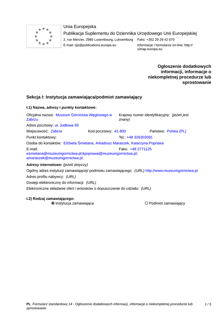 Unia Europejska Publikacja Suplementu do Dziennika Urzędowego Unii Europejskiej 2, rue Mercier, 2985 Luxembourg, Luksemburg Faks: +352 29 29 42 670 E-mail: [email protected] Informacje i formularze on-line: http:// simap.europa.eu Ogłoszenie dodatkowych informacji, informacje o niekompletnej procedurze lub sprostowanie Sekcja I: Instytucja zamawiająca/podmiot zamawiający I.1) Nazwa, adresy i punkty kontaktowe: Oficjalna nazwa: Muzeum Górnictwa Węglowego w Zabrzu Krajowy numer identyfikacyjny: (jeżeli jest znany) _____ Adres pocztowy: ul. Jodłowa 59 Miejscowość: Zabrze Kod pocztowy: 41-800 Punkt kontaktowy: _____ Państwo: Polska (PL) Tel.: +48 326303091 Osoba do kontaktów: Elżbieta Śmietana, Arkadiusz Maraszek, Katarzyna Poprawa E-mail: Faks: +48 2771125 [email protected];[email protected]; [email protected]; Adresy internetowe: (jeżeli dotyczy) Ogólny adres instytucji zamawiającej/ podmiotu zamawiającego: (URL) http://www.muzeumgornictwa.pl Adres profilu nabywcy: (URL) _____ Dostęp elektroniczny do informacji: (URL) _____ Elektroniczne składanie ofert i wniosków o dopuszczenie do udziału: (URL) _____ I.2) Rodzaj zamawiającego: Instytucja zamawiająca Podmiot zamawiający PL Formularz standardowy 14 - Ogłoszenie dodatkowych informacji, informacje o niekompletnej procedurze lub sprostowanie 1/5 Sekcja II: Przedmiot zamówienia II.1.1) Nazwa nadana zamówieniu: „Zakup, dostawa i montaż sprzętu multimedialnego oraz elementów scenografii na potrzeby stworzenia podziemnej trasy turystycznej w wyrobiskach Głównej Kluczowej Sztolni Dziedzicznej w Zabrzu” ZP/40/ MGW/2015 Zamówienie realizowane jest w ramach projektu pn. „Europejski Ośrodek Kultury Technicznej i Turystyki Przemysłowej”. Zadanie współfinansowane ze środków Unii Europejskiej z Europejskiego Funduszu Rozwoju Regionalnego w ramach Programu Operacyjnego Innowacyjna Gospodarka na lata 2007-2013 Działanie 6.4 Innowacje w produkty turystyczne o znaczeniu ponadregionalnym. II.1.2) Krótki opis zamówienia lub zakupu: (podano w pierwotnym ogłoszeniu) Przedmiotem zamówienia jest stworzenie kompleksowej podziemnej trasy turystycznej (zwanej dalej trasą) wraz z dostawą i montażem sprzętu multimedialnego, dostawą i zabudową elementów scenografii, montażem replik, rekonstrukcji i eksponatów muzealnych przekazanych przez Zamawiającego i skonfigurowaniem stworzonej na potrzeby trasy sieci teleinformatycznej z istniejącą siecią Zamawiającego. Miejscem realizacji trasy turystycznej są wyrobiska zlikwidowanej Głównej Kluczowej Sztolni Dziedzicznej (Dalej: GKSD) oraz łączące się z nią wyrobiska kopalni węgla kamiennego „Królowa Luiza” (po 1945 r. „Zabrze”). Trasa przebiega przez odcinek GKSD o długości ok 2,5 km obejmujący wyrobiska od wylotu sztolni w rejonie ul. K. Miarki do rejonu Szybu „Carnall” na terenie dawnego Sztolni Królowa Luiza przy ul. Wolności 410 Parametry środowiskowe w obiekcie ulegają zmianom w zależności od pory roku. W okresie roku 2014 temperatura zmieniała się w zakresie 2,3-19,8 stopni C. a wilgotność w zakresie 64 - 94%. Wyrobiska objęte projektem położone są na głębokości do ok 50 m. Wszystkie wyrobiska objęte są nadzorem zgodnie z zapisami ustawy Prawo Górnicze i Geologiczne. Wykonanie zamówienia obejmuje m.in.: dostawę i montaż sprzętu wystawienniczego oraz elementów scenografii, wykonanie prac scenograficznych, wykonanie opisów i informacji dla turystów w j. polskim i j. obcych, zakup, dostawę i montaż sprzętu multimedialnego i nagłośnieniowego, konfigurację w ramach sieci teleinformatycznej wszystkich multimedialnych elementów trasy, uruchomienie wszystkich elementów trasy poprzez właściwe włączenie się i konfiguracje z sieciami (teleinformatyczna, elektryczna) Zamawiającego, zakup, dostawę i montaż oświetlenia scenograficznego, zaprojektowanie, dostarczenie i montaż wydruków wielkoformatowych, przygotowanie oraz wdrożenie systemu bezobsługowego uruchamiania stanowisk multimedialnych. Realizacja zadania podzielona zostanie na 3 etapy: Etap I – zakup i dostawa sprzętu multimedialnego i scenograficznego Zadanie 1 – dostawa sprzętu multimedialnego i oświetlenia Wykonawca zobowiązuje się do zakupienia i dostarczenia sprzętu multimedialnego i oświetlenia zgodnie ze specyfikacją, sprawdzenia poprawności jego funkcjonowania, przeprowadzenia testów funkcjonalności oraz zdeponowania sprzętu w magazynach Zamawiającego. Równolegle Wykonawca, w oparciu posiadane przez Zamawiającego dokumenty projektowe (projekt instalacji elektrycznej, projekt instalacji teletechnicznej) opracuje, zrealizuje i wdroży system bezobsługowego uruchamiania elementów trasy. Zadanie 2 – dostawa elementów scenografii Wykonawca wykona elementy scenografii opisane w projekcie, w tym m.in. ławki, podesty, repliki narzędzi lub fragmentów narzędzi, wydruki wielko i małoformatowe, elementy scenografii w postaci ekspozytorów, stołów narzędziowych, podestów ekspozycyjnych, torowisk, stanowisk pracy, elementów ekspozycji (gabloty, podesty) i innych elementów opisanych dalszej części SIWZ oraz projekcie aranżacji. Wykonawca ponadto w ramach prac związanych z realizacją Etapu II zdeponuje elementy scenografii w magazynach Zamawiającego z uwzględnieniem ich zabezpieczenia przed uszkodzeniami mechanicznymi i warunkami atmosferycznymi (wilgoć, kurz). Etap II – uruchomienie i instalacja sprzętu multimedialnego, oświetlenia i budowa scenografii wraz z montażem muzealiów i replik powierzonych przez zamawiającego Wykonawca przeprowadzi wszelkie prace montażowe, budowlane i scenograficzne mające na celu przygotowanie wszystkich elementów trasy turystycznej, w tym: zainstaluje i uruchomi urządzenia multimedialne zakupione w Etapie I, zamontuje i zabuduje wykonane w Etapie I elementy scenografii wraz z muzealiami i PL Formularz standardowy 14 - Ogłoszenie dodatkowych informacji, informacje o 