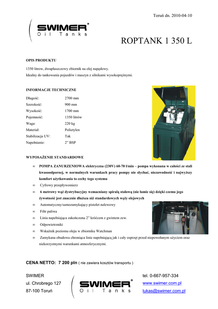 Toruń dn. 2010-04-10 ROPTANK 1 350 L OPIS PRODUKTU 1350 litrow, dwupłaszczowy zbiornik na olej napędowy. Idealny do tankowania pojazdów i maszyn z silnikami wysokopręŜnymi. INFORMACJE TECHNICZNE Długość: 2700 mm Szerokość: 900 mm Wysokość: 1700 mm Pojemność: 1350 litrów Waga: 220 kg Materiał: Polietylen Stabilizacja UV: Tak Napełnianie: 2” BSP WYPOSAśENIE STANDARDOWE • POMPA ZANURZENIOWA elektryczna (230V) 60-70 l/min – pompa wykonana w całości ze stali kwasoodpornej, w normalnych warunkach pracy pompy nie słychać, niezawodność i najwyŜszy komfort uŜytkowania to cechy tego systemu • Cyfrowy przepływomierz • 6 metrowy wąŜ dystrybucyjny wzmacniany spiralą stalową (nie łamie się) dzięki czemu jego Ŝywotność jest znacznie dłuŜsza niŜ standardowych węŜy olejowych • Automatyczny/samozamykający pistolet nalewowy • Filtr paliwa • Linia napełniająca zakończona 2” króćcem z gwintem zew. • Odpowietrzniki • Wskaźnik poziomu oleju w zbiorniku Watchman • Zamykana obudowa chroniąca linie napełniającą jak i cały osprzęt przed niepowołanym uŜyciem oraz niekorzystnymi warunkami atmosferycznymi. CENA NETTO: 7 200 pln ( nie zawiera kosztów transportu ) SWIMER tel. 0-667-957-334 ul. Chrobrego 127 www.swimer.com.pl 87-100 Toruń [email protected] Toruń dn. 2010-04-10 ROPTANK 1 400 L OPIS PRODUKTU 1400 litrow, dwupłaszczowy zbiornik na olej napędowy. Idealny do tankowania pojazdów i maszyn z silnikami wysokopręŜnymi. INFORMACJE TECHNICZNE Średnica: 1576 mm Wysokość: 1800 mm Pojemność: 1400 litrów Waga: 180 kg Materiał: Polietylen Stabilizacja UV: Tak Napełnianie: 2” BSP WYPOSAśENIE STANDARDOWE • POMPA ZANURZENIOWA elektryczna (230V) 60-70 l/min – pompa wykonana w całości ze stali kwasoodpornej, w normalnych warunkach pracy pompy nie słychać, niezawodność i najwyŜszy komfort uŜytkowania to cechy tego systemu • Cyfrowy przepływomierz • 6 metrowy wąŜ dystrybucyjny wzmacniany spiralą stalową (nie łamie się) dzięki czemu jego Ŝywotność jest znacznie dłuŜsza niŜ standardowych węŜy olejowych • Automatyczny/samozamykający pistolet nalewowy • Filtr paliwa • Linia napełniająca zakończona 2” króćcem z gwintem zew. • Odpowietrzniki • Wskaźnik poziomu oleju w zbiorniku Watchman • Zamykana obudowa chroniąca linie napełniającą jak i cały osprzęt przed niepowołanym uŜyciem oraz niekorzystnymi warunkami atmosferycznymi. CENA NETTO: 7 200 pln ( nie zawiera kosztów transportu ) SWIMER tel. 0-667-957-334 ul. Chrobrego 127 www.swimer.com.pl 87-100 Toruń [email protected] Toruń dn. 2010-04-10 ROPTANK 2 500 L OPIS PRODUKTU 2500 litrow, dwupłaszczowy zbiornik na olej napędowy. Idealny do tankowania pojazdów i maszyn z silnikami wysokopręŜnymi. INFORMACJE TECHNICZNE Długość: 2820 mm Szerokość: 1500 mm Wysokość: 1650 mm Pojemność: 2500 litrów Waga: 290 kg Materiał: Polietylen Stabilizacja UV: Tak Napełnianie: 2” BSP WYPOSAśENIE STANDARDOWE • POMPA ZANURZENIOWA elektryczna (230V) 60-70 l/min – pompa wykonana w całości ze stali kwasoodpornej, w normalnych warunkach pracy pompy nie słychać, niezawodność i najwyŜszy komfort uŜytkowania to cechy tego systemu • Cyfrowy przepływomierz • 6 metrowy wąŜ dystrybucyjny wzmacniany spiralą stalową (nie łamie się) dzięki czemu jego Ŝywotność jest znacznie dłuŜsza niŜ standardowych węŜy olejowych • Automatyczny/samozamykający pistolet nalewowy • Filtr paliwa • Linia napełniająca zakończona 2” króćcem z gwintem zew. • Odpowietrzniki • Wskaźnik poziomu oleju w zbiorniku Watchman • Zamykana obudowa chroniąca linie napełniającą jak i cały osprzęt przed niepowołanym uŜyciem oraz niekorzystnymi warunkami atmosferycznymi. CENA NETTO: 10 500 pln ( cena nie zawiera kosztów transportu ) SWIMER tel. 0-667-957-334 ul. Chrobrego 127 www.swimer.com.pl 87-100 Toruń [email protected] Toruń dn. 2010-04-10 ROPTANK 3 500 L OPIS PRODUKTU 3500 litrow, dwupłaszczowy zbiornik na olej napędowy. Idealny do tankowania pojazdów i maszyn z silnikami wysokopręŜnymi. INFORMACJE TECHNICZNE Średnica: 2000 mm Wysokość: 2500 mm Pojemność: 3500 litrów Waga: 370 kg Materiał: Polietylen Stabilizacja UV: Tak Napełnianie: 2” BSP WYPOSAśENIE • POMPA ZANURZENIOWA elektryczna (230V) 60-70 l/min – pompa wykonana w całości ze stali kwasoodpornej, w normalnych warunkach pracy pompy nie słychać, niezawodność i najwyŜszy komfort uŜytkowania to cechy tego systemu • Cyfrowy przepływomierz • 6 metrowy wąŜ dystrybucyjny wzmacniany spiralą stalową (nie łamie się) dzięki czemu jego Ŝywotność jest znacznie dłuŜsza niŜ standardowych węŜy olejowych • Automatyczny/samozamykający pistolet nalewowy • Filtr paliwa • System alarmowy ( przepełnienia / przecieku ) • Zawór zapobiegający przepełnieniu zbiornika podczas jego napełniania. • Linia napełniająca zakończona 2” króćcem z gwintem zew. na poziomie roboczym zapewniająca maksymalne bezpieczeństwo podczas napełniania zbiornika Odpowietrzniki • Wskaźnik poziomu oleju w zbiorniku Watchman • Zamykana obudowa chroniąca linie napełniającą jak i cały osprzęt przed niepowołanym uŜyciem oraz niekorzystnymi warunkami atmosferycznymi bez trudu mieszcząca 15m wąŜ dystrybucyjny CENA NETTO: 13 600 pln ( nie zawiera kosztów transportu ) SWIMER tel. 0-667-957-334 ul. Chrobrego 127 www.swimer.com.pl 87-100 Toruń [email protected] Toruń dn. 2010-04-10 ROPTANK 6 000 L OPIS PRODUKTU 6000 litrow, dwupłaszczowy zbiornik na olej napędowy. Idealny do tankowania pojazdów i maszyn z silnikami wysokopręŜnymi. INFORMACJE TECHNICZNE Średnica: 2547 mm Wysokość: 2650 mm Pojemność: 6000 litrów Waga: 430 kg Materiał: Polietylen Stabilizacja UV: Tak Napełnianie: 2” BSP WYPOSAśENIE • POMPA ZANURZENIOWA elektryczna (230V) 60-70 l/min – pompa wykonana w całości ze stali kwasoodpornej, w no