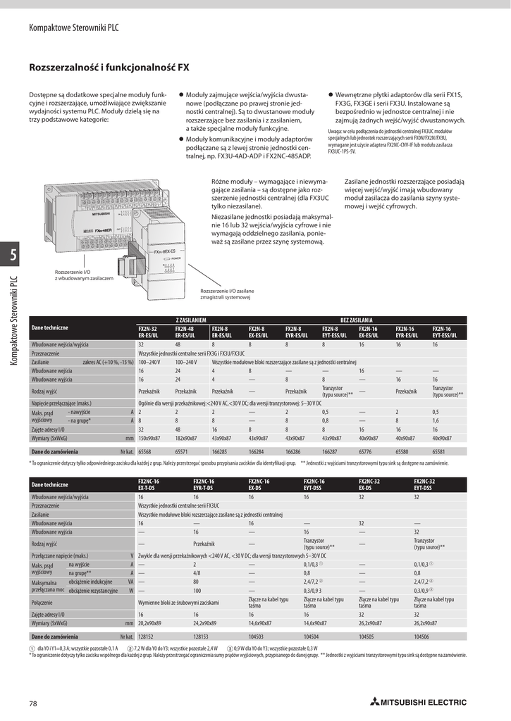 Kompaktowe Sterowniki PLC Rozszerzalność i funkcjonalność FX Dostępne są dodatkowe specjalne moduły funkcyjne i rozszerzające, umożliwiające zwiększanie wydajności systemu PLC. Moduły dzielą się na trzy podstawowe kategorie: zz Moduły zajmujące wejścia/wyjścia dwustanowe (podłączane po prawej stronie jednostki centralnej). Są to dwustanowe moduły rozszerzające bez zasilania i z zasilaniem, a także specjalne moduły funkcyjne. zz Wewnętrzne płytki adaptorów dla serii FX1S, FX3G, FX3GE i serii FX3U. Instalowane są bezpośrednio w jednostce centralnej i nie zajmują żadnych wejść/wyjść dwustanowych. Uwaga: w celu podłączenia do jednostki centralnej FX3UC modułów specjalnych lub jednostek rozszerzających serii FX0N/FX2N/FX3U, wymagane jest użycie adaptera FX2NC-CNV-IF lub modułu zasilacza FX3UC-1PS-5V. zz Moduły komunikacyjne i moduły adaptorów podłączane są z lewej stronie jednostki centralnej, np. FX3U-4AD-ADP i FX2NC-485ADP. Różne moduły – wymagające i niewymagające zasilania – są dostępne jako rozszerzenie jednostki centralnej (dla FX3UC tylko niezasilane). Niezasilane jednostki posiadają maksymalnie 16 lub 32 wejścia/wyjścia cyfrowe i nie wymagają oddzielnego zasilania, ponieważ są zasilane przez szynę systemową. 5 Kompaktowe Sterowniki PLC Zasilane jednostki rozszerzające posiadają więcej wejść/wyjść imają wbudowany moduł zasilacza do zasilania szyny systemowej i wejść cyfrowych. Rozszerzenie I/O z wbudowanym zasilaczem Rozszerzenie I/O zasilane zmagistrali systemowej Dane techniczne Wbudowane wejścia/wyjścia Przeznaczenie Zasilanie zakres AC (+10 %, -15 %) Wbudowane wejścia Wbudowane wyjścia Rodzaj wyjść Napięcie przełączające (maks.) - nawyjście Maks. prąd wyjściowy - na grupę* Zajęte adresy I/O Wymiary (SxWxG) Dane do zamówienia A A mm Z ZASILANIEM BEZ ZASILANIA FX2N-32 FX2N-48 FX2N-8 FX2N-8 FX2N-8 FX2N-8 FX2N-16 ER-ES/UL ER-ES/UL ER-ES/UL EX-ES/UL EYR-ES/UL EYT-ESS/UL EX-ES/UL 32 48 8 8 8 8 16 Wszystkie jednostki centralne serii FX3G i FX3U/FX3UC 100–240 V 100–240 V Wszystkie modułowe bloki rozszerzające zasilane są z jednostki centralnej 16 24 4 8 — — 16 16 24 4 — 8 8 — Tranzystor Przekaźnik Przekaźnik Przekaźnik — Przekaźnik (typu source)** — Ogólnie dla wersji przekaźnikowej:<240 V AC,<30 V DC; dla wersji tranzystorowej: 5–30 V DC 2 2 2 — 2 0,5 — 8 8 8 — 8 0,8 — 32 48 16 8 8 8 16 150x90x87 182x90x87 43x90x87 43x90x87 43x90x87 43x90x87 40x90x87 Nr kat. 65568 65571 166285 166284 166286 166287 65776 FX2N-16 EYR-ES/UL 16 FX2N-16 EYT-ESS/UL 16 — 16 Przekaźnik — 16 Tranzystor (typu source)** 2 8 16 40x90x87 0,5 1,6 16 40x90x87 65580 65581 * To ograniczenie dotyczy tylko odpowiedniego zacisku dla każdej z grup. Należy przestrzegać sposobu przypisania zacisków dla identyfikacji grup. ** Jednostki z wyjściami tranzystorowymi typu sink są dostępne na zamówienie. FX2NC-16 FX2NC-16 FX2NC-16 EX-T-DS EYR-T-DS EX-DS 16 16 16 Wszystkie jednostki centralne serii FX3UC Wszystkie modułowe bloki rozszerzające zasilane są z jednostki centralnej 16 — 16 — 16 — Dane techniczne Wbudowane wejścia/wyjścia Przeznaczenie Zasilanie Wbudowane wejścia Wbudowane wyjścia Rodzaj wyjść Przełączane napięcie (maks.) na wyjście Maks. prąd wyjściowy na grupę** obciążenie indukcyjne Maksymalna przełączana moc obciążenie rezystancyjne V A A VA W Połączenie Zajęte adresy I/O Wymiary (SxWxG) Dane do zamówienia mm FX2NC-16 EYT-DSS 16 — 16 Tranzystor — Przekaźnik — (typu source)** Zwykle dla wersji przekaźnikowych <240 V AC, <30 V DC; dla wersji tranzystorowych 5–30 V DC — 2 — 0,1/0,3 1 — 4/8 — 0,8 — 80 — 2,4/7,2 2 — 100 — 0,3/0,9 3 Złącze na kabel typu Złącze na kabel typu Wymienne bloki ze śrubowymi zaciskami taśma taśma 16 16 16 16 20,2x90x89 24,2x90x89 14,6x90x87 14,6x90x87 Nr kat. 128152 128153 104503 104504 FX2NC-32 EX-DS 32 FX2NC-32 EYT-DSS 32 32 — — — 32 Tranzystor (typu source)** — — — — Złącze na kabel typu taśma 32 26,2x90x87 0,1/0,3 1 0,8 2,4/7,2 2 0,3/0,9 3 Złącze na kabel typu taśma 32 26,2x90x87 104505 104506 1 dla Y0 i Y1=0,3 A; wszystkie pozostałe 0,1 A 2 7,2 W dla Y0 do Y3; wszystkie pozostałe 2,4 W 3 0,9 W dla Y0 do Y3; wszystkie pozostałe 0,3 W * To ograniczenie dotyczy tylko zacisku wspólnego dla każdej z grup. Należy przestrzegać ograniczenia sumy prądów wyjściowych, przypisanego do danej grupy. ** Jednostki z wyjściami tranzystorowymi typu sink są dostępne na zamówienie. 78