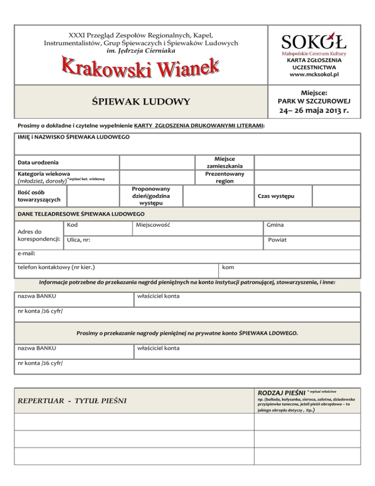 XXXI Przegląd Zespołów Regionalnych, Kapel, Instrumentalistów, Grup Śpiewaczych i Śpiewaków Ludowych im. Jędrzeja Cierniaka KARTA ZGŁOSZENIA UCZESTNICTWA www.mcksokol.pl Miejsce: PARK W SZCZUROWEJ ŚPIEWAK LUDOWY 24– 26 maja 2013 r. Prosimy o dokładne i czytelne wypełnienie KARTY ZGŁOSZENIA DRUKOWANYMI LITERAMI: IMIĘ i NAZWISKO ŚPIEWAKA LUDOWEGO Miejsce zamieszkania Prezentowany region Data urodzenia Kategoria wiekowa (młodzież, dorosły)*wpisać kat. wiekową Proponowany dzień/godzina występu Ilość osób towarzyszących Czas występu DANE TELEADRESOWE ŚPIEWAKA LUDOWEGO Kod Adres do korespondencji: Miejscowość Gmina Ulica, nr: Powiat e-mail: telefon kontaktowy (nr kier.) kom Informacje potrzebne do przekazania nagród pieniężnych na konto instytucji patronującej, stowarzyszenia, i inne: nazwa BANKU właściciel konta nr konta /26 cyfr/ Prosimy o przekazanie nagrody pieniężnej na prywatne konto ŚPIEWAKA LDOWEGO. nazwa BANKU właściciel konta nr konta /26 cyfr/ REPERTUAR - TYTUŁ PIEŚNI RODZAJ PIEŚNI * wpisać właściwe np. (ballada, kołysanka, sieroca, zalotna, dziadowska przyśpiewka taneczna, jeżeli pieśń obrzędowa – to jakiego obrzędu dotyczy , itp.) DANE TELEADRESOWE INSTYTUCJI Pełna nazwa instytucji Kod Miejscowość Powiat Adres do korespondencji Ulica, nr: tel. kontaktowy (nr kier.) e-mail: Prosimy o nadesłanie karty zgłoszenia do dnia: 30 kwiatnia 2013 r. POCZTĄ: lub FAX: lub E-MAIL: MCK SOKÓŁ – Biuro Organizacyjne w Tarnowie Rynek 16, 33-100 Tarnów (14) 626 07 61 [email protected] UWAGA! ● prosimy o przywiezienie ze sobą aktualnego, imiennego wykazu ŚPIEWAKÓW LUDOWYCH potwierdzonego przez instytucję delegującą, ● w przypadku zgłoszenia ŚPIEWAKÓW LUDOWYCH, a nie wzięcia udziału w KRAKOWSKIM WIANKU w Szczurowej organizatorzy mają prawo obciążyć poniesionymi kosztami instytucj ę delegującą. pieczątka instytucji delegującej OŚWIADCZAM, ŻE ZAPOZNAŁAM/ŁEM SIĘ Z TREŚCIĄ REGULAMINU I AKCEPTUJĘ JEGO TREŚĆ. podpis śpiewaka ludowego pieczęć i podpis osoby upoważnionej do delegowania Miejscowość, data
