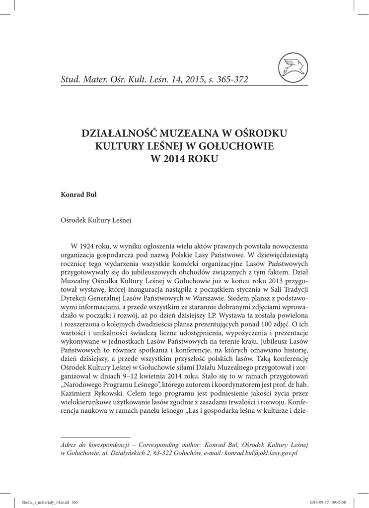 Stud. Mater. Ośr. Kult. Leśn. 14, 2015, s. 365-372 DZIAŁALNOŚĆ MUZEALNA W OŚRODKU KULTURY LEŚNEJ W GOŁUCHOWIE W 2014 ROKU Konrad Bul Ośrodek Kultury Leśnej W 1924 roku, w wyniku ogłoszenia wielu aktów prawnych powstała nowoczesna organizacja gospodarcza pod nazwą Polskie Lasy Państwowe. W dziewięćdziesiątą rocznicę tego wydarzenia wszystkie komórki organizacyjne Lasów Państwowych przygotowywały się do jubileuszowych obchodów związanych z tym faktem. Dział Muzealny Ośrodka Kultury Leśnej w Gołuchowie już w końcu roku 2013 przygotował wystawę, której inauguracja nastąpiła z początkiem stycznia w Sali Tradycji Dyrekcji Generalnej Lasów Państwowych w Warszawie. Siedem plansz z podstawowymi informacjami, a przede wszystkim ze starannie dobranymi zdjęciami wprowadzało w początki i rozwój, aż po dzień dzisiejszy LP. Wystawa ta została powielona i rozszerzona o kolejnych dwadzieścia plansz prezentujących ponad 100 zdjęć. O ich wartości i unikalności świadczą liczne udostępnienia, wypożyczenia i prezentacje wykonywane w jednostkach Lasów Państwowych na terenie kraju. Jubileusz Lasów Państwowych to również spotkania i konferencje, na których omawiano historię, dzień dzisiejszy, a przede wszystkim przyszłość polskich lasów. Taką konferencję Ośrodek Kultury Leśnej w Gołuchowie siłami Działu Muzealnego przygotował i zorganizował w dniach 9–12 kwietnia 2014 roku. Stało się to w ramach przygotowań „Narodowego Programu Leśnego”, którego autorem i koordynatorem jest prof. dr hab. Kazimierz Rykowski. Celem tego programu jest podniesienie jakości życia przez wielokierunkowe użytkowanie lasów zgodnie z zasadami trwałości i rozwoju. Konferencja naukowa w ramach panelu leśnego „Las i gospodarka leśna w kulturze i dzie- Adres do korespondencji – Corresponding author: Konrad Bul, Ośrodek Kultury Leśnej w Gołuchowie, ul. Działyńskich 2, 63-322 Gołuchów, e-mail: [email protected] Studia_i_materialy_14.indd 365 2015-09-17 09:41:58 366 Konrad Bul dzictwie narodowym” zgromadziła 88 uczestników, którzy wysłuchali 21 prelegentów, pracowników naukowych uniwersytetów humanistycznych i przyrodniczych z całego kraju, a także leśników-praktyków. Wyniki konferencji zostały już opublikowane w roku 2014. Organizacja panelu leśnego poza murami Instytutu Badawczego Leśnictwa i poza murami jednej z uczelni leśnych, w siedzibie Ośrodka Kultury Leśnej w Gołuchowie, jest wyróżnieniem dla Ośrodka – miejsca, gdzie historia leśnictwa przeplata się ze współczesnością, gdzie ekspozycje muzealne wzbogacane są przedsięwzięciami opowiadającymi o roli lasów we współczesnym świecie, gdzie spotykają się na konferencjach i sympozjach naukowcy z różnych dziedzin, a na festynach kulturowych szerokie rzesze społeczeństwa. Drugim tego typu spotkaniem zorganizowanym na terenie Ośrodka była konferencja Zarządu Okręgowego SITLiD w Kaliszu, na którą zaproszono leśników południowej Wielkopolski. Podczas konferencji wygłoszono przygotowany przez kierownika Działu Muzealnego referat „90 lat Lasów Państwowych”. Kolejnym znaczącym przedsięwzięciem zorganizowanym przez Dział Muzealny był I Międzynarodowy Festiwal Kultury Leśnej i Łowieckiej w Gołuchowie. Z inicjatywą festiwalu jesienią 2013 roku wystąpiło dwóch członków PZŁ, z których jeden jest zawodowym muzykiem, sygnalistą łowieckim i członkiem stowarzyszenia sygnalistów łowieckich. Od samego początku przedsięwzięcie było wspólnym działaniem leśników z okolicznych nadleśnictw, wspólnie finansowane i organizowane. Wiodącą rolę w tych działaniach pełnili pracownicy Działu Muzealnego, którzy wzięli na siebie ciężar organizacji nowej i bardzo skomplikowanej – zarówno od strony organizacyjnej, jak i merytorycznej – imprezy. Trzeba zaznaczyć, że Ośrodek nie przewidywał w swych planach żadnych środków finansowych na to wydarzenie. W wyniku podjętych działań udało się zgromadzić potrzebne fundusze od sponsorów, które wystarczyły na opłacenie wszystkich rachunków. W festiwalu aktywnie uczestniczyło około stu osób, które brały udział w konkursie muzyki myśliwskiej i konkursie sygnalistów łowieckich, a także organizowały stoiska edukacyjne kierowane do licznych gości – uczestników festynu. Dodatkowymi atrakcjami były pokazy tresury psów, pokazy sokolnicze oraz prezentacje wabiarzy. W festynie uczestniczyło około 1000 osób, które przez cały dzień obserwowały konkursy lub uczestniczyły w pokazach. W 2014 roku na ekspozycjach muzealnych zarejestrowano 33 796 osób, czyli prawie 8 tysięcy więcej niż rok wcześniej. Wyraźny wzrost liczby odwiedzających ekspozycję gości związany jest z uruchomieniem w odbudowanej Chałupie – leśniczówce nowej wystawy stałej. Obiekt położony w głębi parku, przy najczęściej uczęszczanej alejce, już wcześniej budził zainteresowanie turystów, ale dopiero urządzenie w nim wystawy dotyczącej pasiecznictwa oraz urządzenie mieszkania i kancelarii leśnika zaowocowało wyraźnym wzrostem liczebności zwiedzających. Dotyczy to również obiektu położonego opodal, w którym urządzona jest wystawa z dziedziny „Ochrony lasu”. W niedalekiej przyszłości obiekty te zostaną wzbogacone o wystawę terenową oraz urządzenia edukacyjne. W drugiej części parku, na terenie zespołu dawnych budynków gospodarczych, uruchomiona rok wcześniej terenowa ekspozycja maszyn i urządzeń pracujących w lesie również zaczęła gromadzić liczne zwiedzających. Jest to związane z systematycznym wzbogacaniem ekspozycji o nowe, atrakcyj- Studia_i_materialy_14.indd 366 2015-09-17 09:41:59 Działalność muzealna w Ośrodku Kultury Leśnej w Gołuchowie w 2014 roku 367 ne eksponaty: wozy bojowe ochrony przeciwpożarowej lasów, retorty do wypalania węgla drzewnego czy niespotykane już w terenie urządzenia do ręcznego