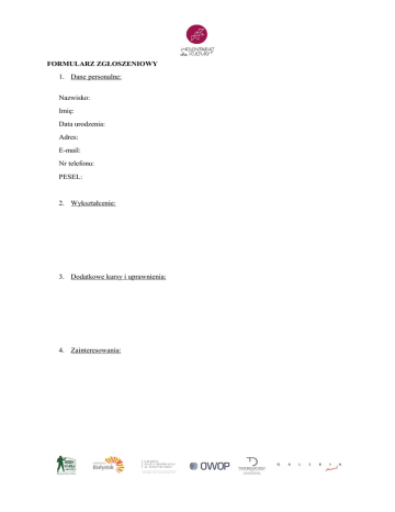 FORMULARZ ZGŁOSZENIOWY 1. Dane personalne: Nazwisko: Imię: Data urodzenia: Adres: E-mail: Nr telefonu: PESEL: 2. Wykształcenie: 3. Dodatkowe kursy i uprawnienia: 4. Zainteresowania: 5. Dlaczego chcesz przystąpić do programu? 6. Dyspozycyjność: 7. Preferowana instytucja (proszę podkreślić właściwą) Galeria Arsenał w Białymstoku Galeria im. Sleńdzińskich w Białymstoku Muzeum Wojska w Białymstoku Ośrodek Wspierania Organizacji Pozarządowych Teatr Dramatyczny im. Aleksandra Węgierki w Białymstoku