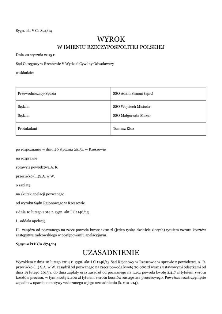 Sygn. akt V Ca 874/14 WYROK W IMIENIU RZECZYPOSPOLITEJ POLSKIEJ Dnia 20 stycznia 2015 r. Sąd Okręgowy w Rzeszowie V Wydział Cywilny Odwoławczy w składzie: Przewodniczący-Sędzia SSO Adam Simoni (spr.) Sędzia: SSO Wojciech Misiuda Sędzia: SSO Małgorzata Mazur Protokolant: Tomasz Kluz po rozpoznaniu w dniu 20 stycznia 2015r. w Rzeszowie na rozprawie sprawy z powództwa A. R. przeciwko (...)S.A. w W. o zapłatę na skutek apelacji pozwanego od wyroku Sądu Rejonowego w Rzeszowie z dnia 10 lutego 2014 r. sygn. akt I C 1146/13 I. oddala apelację, II. zasądza od pozwanego na rzecz powoda kwotę 1200 zł (jeden tysiąc dwieście złotych) tytułem zwrotu kosztów zastępstwa radcowskiego w postępowaniu apelacyjnym. Sygn.aktV Ca 874/14 UZASADNIENIE Wyrokiem z dnia 10 lutego 2014 r. sygn. akt I C 1146/13 Sąd Rejonowy w Rzeszowie w sprawie z powództwa A. R. przeciwko (...) S.A. w W. zasądził od pozwanego na rzecz powoda kwotę 20.000 zł wraz z ustawowymi odsetkami od dnia 19 lutego 2013 r. do dnia zapłaty oraz zasądził od pozwanego na rzecz powoda kwotę 3.417 zł tytułem zwrotu kosztów procesu, w tym kwotę 2.400 zł tytułem zwrotu kosztów zastępstwa procesowego. Powyższe rozstrzygnięcie zapadło w oparciu o motywy wskazanego w jego uzasadnieniu (k. 210-214). Powyższe rozstrzygnięcie zaskarżył apelacją pozwany ubezpieczyciel w całości. Zaskarżonemu wyrokowi zarzucił obrazę prawa materialnego tj. art. 819 § 1 kc poprzez jego niewłaściwe zastosowanie skutkujące uznaniem, że trzyletni okres przedawnienia roszczenia powoda nie upłynął na dzień wniesienia pozwu, obrazę art. 819 § 4 kc polegające na błędnej wykładni tego przepisu poprzez przyjęcie przez Sąd, że każde kolejne, a nie tylko pierwsze zgłoszenie roszczenia ubezpieczycielowi z tego samego tytułu przerywa bieg przedawnienia roszczenia ubezpieczonego, polegające na przyjęciu przez Sąd, że datą od której zaczął biec termin przedawnienia roszczenia powoda jest data doręczenia powodowi decyzji z dnia 30 kwietnia 2010 r. W oparciu o powyższe wniósł o zmianę zaskarżonego orzeczenia o oddalenie powództwa oraz o zasądzenie od powoda na rzecz pozwanego kosztów procesu, w tym kosztów zastępstwa procesowego według norm przepisanych. W odpowiedzi na apelację powód wniósł o jej oddalenie i zasądzenie od pozwanego na swoją rzecz kosztów zastępstwa procesowego według norm przepisanych. Podniósł również zarzut z art. 5 kc. Sąd Okręgowy zważył, co następuje: Apelacja nie jest zasadna i jako taka na uwzględnienie nie zasługuje. Sąd I instancji poczynił w przedmiotowej sprawie prawidłowe ustalenia faktyczne, które Sąd Okręgowy w pełni podziela i przyjmuje za własne. Na tej podstawie Sąd Rejonowy sformułował jednak wadliwe wnioski, uznając za nieskuteczne twierdzenia pozwanego dotyczące przedawnienia roszczenia dochodzonego przez powoda. Pomimo tego zaskarżony wyrok należało utrzymać w mocy z uwagi na uznanie przez tut. Sąd, że skorzystanie przez powoda z przysługującego mu zarzutu przedawnienia stanowi nadużycie prawa i pozostaje w sprzeczności z zasadami współżycia społecznego. Zgodnie z przepisem art. 819 § 1 kc roszczenia z umowy ubezpieczenia przedawniają się z upływem lat trzech. Stosownie zaś do jego § 4 bieg przedawnienia roszczenia o świadczenie do ubezpieczyciela przerywa się także przez zgłoszenie ubezpieczycielowi tego roszczenia lub przez zgłoszenie zdarzenia objętego ubezpieczeniem. Bieg przedawnienia rozpoczyna się na nowo od dnia, w którym zgłaszający roszczenie lub zdarzenie otrzymał na piśmie oświadczenie ubezpieczyciela o przyznaniu lub odmowie świadczenia. Przepisy o przedawnieniu roszczeń mają charakter bezwzględnie obowiązujący. Jednocześnie podkreślenia wymaga, że jak wynika z § 4 art. 819 kc bieg terminu przedawnienia uzależniony jest od zaistnienia określonych zdarzeń przy czym przepis ten różnicuje materialną czynność, jaką jest zgłoszenie zakładowi ubezpieczeń roszczenia od czynności faktycznej, jaką jest zgłoszenie zdarzenia objętego ubezpieczeniem, gdy dokonanie tej drugiej czynności przerywa bieg przedawnienia roszczeń wynikających ze zgłoszonego zdarzenia. Zarzut naruszenia przez Sąd meriti art. 819 § 4 kc jest słuszny. Treść przepisu art. 818 § 4 kc gdy ustawodawca używa liczby pojedynczej co do „odmowy świadczenia” wskazuje na to, że przy początku biegu przedawnienia na nowo należało uwzględniać datę otrzymania pierwszego pisma ubezpieczyciela tj. dzień 6.11.2008 r. Powołana wyżej regulacja stanowi równocześnie regulację szczególną w stosunku do określonej w § 1 art. 124 kc co nakazuje jej wykładnię ścisłą również w tym aspekcie, że regulacja § 4 art. 819 kc dotyczy tylko pierwszego oświadczenia na piśmie ubezpieczyciela doręczonego zgłaszającemu roszczenie lub zdarzenie, co do zasadności zgłoszonego roszczenia. Mimo istotnej funkcji jaką pełni przedawnienie, to jest funkcji stabilizującej stosunki społeczne, funkcja ta nie przedstawia się jako nadrzędna, musi ona w pewnych sytuacjach ustąpić przed inną wartością, jaką jest prawo strony do uzyskania orzeczenia zgodnego z poczuciem sprawiedliwości. Zastosowanie art. 5 kc w odniesieniu do zarzutu przedawnienia zakłada rozważenie, na tle całokształtu okoliczności sprawy, interesów i postaw obu stron roszczenia, tj. zarówno uprawnionego, jak i zobowiązanego (tak też słusznie SN w wyroku z dnia 27 listopada 2013 r., V CSK 516/2012). W orzecznictwie Sądu Najwyższego ugruntował się pogląd aprobowany przez tut. Sąd zgodnie z którym sąd może wyjątkowo nie uwzględnić upływu przedawnienia dochodzonego roszczenia, jeżeli podniesienie przez dłużnika zarzutu przedawnienia nosi znamiona nadużycia prawa podmiotowego (vide: m.in. uchwały SN: z dnia 10 marca 1993 r. III CZP 8/93 OSNCP 1993, nr 9 poz. 153 i z dnia 11 października 1996 r. III 