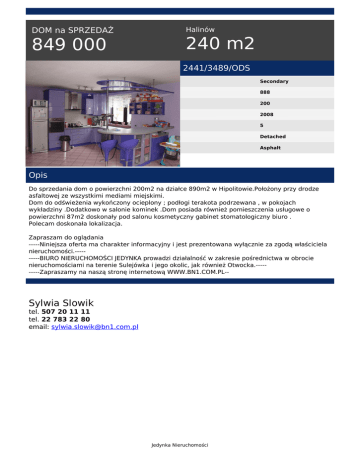 DOM na SPRZEDAŻ 849 000 Halinów 240 m2 2441/3489/ODS Secondary 888 200 2008 5 Detached Asphalt Opis Do sprzedania dom o powierzchni 200m2 na działce 890m2 w Hipolitowie.Położony przy drodze asfaltowej ze wszystkimi mediami miejskimi. Dom do odświeżenia wykończony ocieplony ; podłogi terakota podrzewana , w pokojach wykładziny .Dodatkowo w salonie kominek .Dom posiada również pomieszczenia usługowe o powierzchni 87m2 doskonały pod salonu kosmetyczny gabinet stomatologiczny biuro . Polecam doskonała lokalizacja. Zapraszam do oglądania -----Niniejsza oferta ma charakter informacyjny i jest prezentowana wyłącznie za zgodą właściciela nieruchomości.---------BIURO NIERUCHOMOŚCI JEDYNKA prowadzi działalność w zakresie pośrednictwa w obrocie nieruchomościami na terenie Sulejówka i jego okolic, jak również Otwocka.---------Zapraszamy na naszą stronę internetową WWW.BN1.COM.PL-- Sylwia Slowik tel. 507 20 11 11 tel. 22 783 22 80 email: [email protected] Jedynka Nieruchomości Powered by TCPDF (www.tcpdf.org)