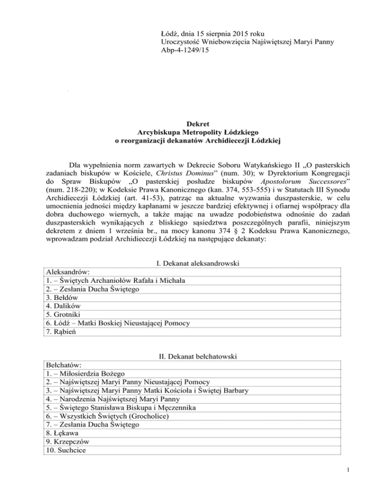 Łódź, dnia 15 sierpnia 2015 roku Uroczystość Wniebowzięcia Najświętszej Maryi Panny Abp-4-1249/15 Dekret Arcybiskupa Metropolity Łódzkiego o reorganizacji dekanatów Archidiecezji Łódzkiej Dla wypełnienia norm zawartych w Dekrecie Soboru Watykańskiego II „O pasterskich zadaniach biskupów w Kościele, Christus Dominus” (num. 30); w Dyrektorium Kongregacji do Spraw Biskupów „O pasterskiej posłudze biskupów Apostolorum Successores” (num. 218-220); w Kodeksie Prawa Kanonicznego (kan. 374, 553-555) i w Statutach III Synodu Archidiecezji Łódzkiej (art. 41-53), patrząc na aktualne wyzwania duszpasterskie, w celu umocnienia jedności między kapłanami w jeszcze bardziej efektywnej i ofiarnej współpracy dla dobra duchowego wiernych, a także mając na uwadze podobieństwa odnośnie do zadań duszpasterskich wynikających z bliskiego sąsiedztwa poszczególnych parafii, niniejszym dekretem z dniem 1 września br., na mocy kanonu 374 § 2 Kodeksu Prawa Kanonicznego, wprowadzam podział Archidiecezji Łódzkiej na następujące dekanaty: I. Dekanat aleksandrowski Aleksandrów: 1. – Świętych Archaniołów Rafała i Michała 2. – Zesłania Ducha Świętego 3. Bełdów 4. Dalików 5. Grotniki 6. Łódź – Matki Boskiej Nieustającej Pomocy 7. Rąbień II. Dekanat bełchatowski Bełchatów: 1. – Miłosierdzia Bożego 2. – Najświętszej Maryi Panny Nieustającej Pomocy 3. – Najświętszej Maryi Panny Matki Kościoła i Świętej Barbary 4. – Narodzenia Najświętszej Maryi Panny 5. – Świętego Stanisława Biskupa i Męczennika 6. – Wszystkich Świętych (Grocholice) 7. – Zesłania Ducha Świętego 8. Łękawa 9. Krzepczów 10. Suchcice 1 III. Dekanat brzeziński Brzeziny: 1. – Najświętszej Maryi Panny Częstochowskiej 2. – Podwyższenia Świętego Krzyża 3. – Świętego Franciszka z Asyżu 4. Jeżów 5. Kołacinek 6. Rogów 7. Skoszewy IV. Dekanat koluszkowski 1. Gałków 2. Justynów 3. Kaletnik Koluszki: 4. – Świętej Katarzyny Aleksandryjskiej 5. – Niepokalanego Poczęcia Najświętszej Maryi Panny 6. Łaznów 7. Nowe Chrusty 8. Rokiciny 9. Świny V. Dekanat konstantynowski 1. Kazimierz Konstantynów: 2. – Świętego Józefa Robotnika 3. – Miłosierdzia Bożego 4. – Narodzenia Najświętszej Maryi Panny 5. – Nawiedzenia Najświętszej Maryi Panny (Srebrna) 6. Kwiatkowice 7. Lutomiersk 8. Mikołajewice VI. Dekanat łaski 1. Borszewice 2. Dobroń Łask: 3. – Niepokalanego Poczęcia Najświętszej Maryi Panny i Świętego Michała Archanioła 4. – Świętej Faustyny Kowalskiej 5. – Wniebowzięcia Najświętszej Maryi Panny (Kolumna) 6. Okup Wielki 7. Teodory 8. Wiewiórczyn 9. Wrzeszczewice 10. Zduńska Wola – Karsznice 2 VII. Dekanat Łódź Bałuty 1. Dobrego Pasterza 2. Najświętszej Maryi Panny Królowej Pokoju 3. Świętego Józefa Oblubieńca Najświętszej Maryi Panny 4. Świętego Marka Ewangelisty 5. Świętego Michała Archanioła 6. Świętej Teresy od Dzieciatka Jezus i Świętego Jana Bosko 7. Wniebowzięcia Najświętszej Maryi Panny 8. Zesłania Ducha Świętego VIII. Dekanat Łódź Chojny–Dąbrowa 1. Matki Boskiej Anielskiej 2. Najświętszej Maryi Panny Matki Odkupiciela i Świętego Jana Bożego 3. Przemienienia Pańskiego 4. Świętego Łukasza Ewangelisty i Świętego Floriana 5. Świętego Maksymiliana Marii Kolbego 6. Świętego Wojciecha 7. Zmartwychwstania Pańskiego IX. Dekanat Łódź Olechów 1. Andrespol 2. Bedoń 3. Kurowice Łódź: 4. – Niepokalanego Poczęcia Najświętszej Maryi Panny (Andrzejów) 5. – Świętego Jana Ewangelisty 6. – Świętego Papieża Jana XXIII 7. – Świętego Rafała Kalinowskiego (Wiskitno) 8. Wola Rakowa X. Dekanat Łódź Radogoszcz 1. Matki Bożej Pocieszenia 2. Najświętszej Maryi Panny Królowej Polski 3. Najświętszej Maryi Panny Łaskawej 4. Najświętszego Sakramentu 5. Najświętszego Serca Jezusowego i Świętej Marii Małgorzaty Alacoque 6. Opieki Świętego Józefa 7. Świętego Antoniego Padewskiego i Świętego Jana Chrzciciela (Łagiewniki) XI. Dekanat Łódź Retkinia–Ruda 1. Chrystusa Króla 2. Najświętszej Eucharystii 3. Najświętszego Imienia Maryi 4. Najświętszego Serca Jezusowego 5. Świętego Franciszka z Asyżu 6. Świętego Józefa Oblubieńca Najświętszej Maryi Panny 7. Świętej Rodziny 8. Wniebowstąpienia Pańskiego 9. Zesłania Ducha Świętego (Łaskowice) 3 XII. Dekanat Łódź Stoki 1. Matki Boskiej Różańcowej i Świętego Stanisława Biskupa Męczennika 2. Opatrzności Bożej 3. Świętego Andrzeja Boboli (Nowosolna) 4. Świętej Doroty i Świętego Jana Chrzciciela (Mileszki) 5. Świętej Elżbiety Węgierskiej i Błogosławionego Ojca Anastazego Pankiewicza 6. Świętego Judy Tadeusza Apostoła 7. Świętego Wincentego Pallottiego XIII. Dekanat Łódź Śródmieście 1. Archikatedralna Świętego Stanisława Kostki 2. Matki Boskiej Fatimskiej 3. Matki Boskiej Zwycięskiej 4. Najświętszego Imienia Jezus 5. Podwyższenia Świętego Krzyża 6. Świętego Mateusza Ewangelisty 7. Świętej Faustyny Kowalskiej 8. Świętej Urszuli Ledóchowskiej XIV. Dekanat Łódź Teofilów–Żubardź 1. Chrystusa Odkupiciela 2. Matki Boskiej Bolesnej 3. Miłosierdzia Bożego 4. Niepokalanego Serca Najświętszej Maryi Panny i Świętego Antoniego Marii Klareta 5. Najświętszego Zbawiciela 6. Świętego Antoniego z Padwy 7. Świętego Jana Chrzciciela XV. Dekanat Łódź Widzew 1. Matki Boskiej Jasnogórskiej 2. Matki Boskiej Wspomożenia Wiernych 3. Świętego Alberta Chmielowskiego 4. Świętego Kazimierza 5. Świętej Anny 6. Świętych Apostołów Piotra i Pawła 7. Trójcy Przenajświętszej XVI. Dekanat ozorkowski 1. Gieczno 2. Leźnica Wielka 3. Modlna Ozorków: 4. – Najświętszej Maryi Panny Królowej Polski 5. – Świętego Józefa 6. Parzęczew 7. Sokolniki 8. Solca Wielka 4 XVII. Dekanat pabianicki 1. Górka Pabianicka 2. Ksawerów Pabianice: 3. – Chrystusa Króla Wszechświata 4. – Miłosierdzia Bożeg
