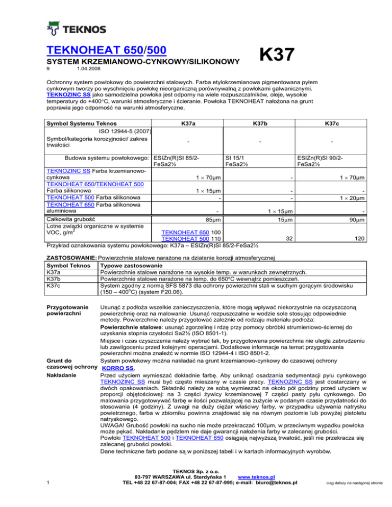 TEKNOHEAT 650/500 K37 SYSTEM KRZEMIANOWO-CYNKOWY/SILIKONOWY 9 1.04.2008 Ochronny system powłokowy do powierzchni stalowych. Farba etylokrzemianowa pigmentowana pyłem cynkowym tworzy po wyschnięciu powłokę nieorganiczną porównywalną z powłokami galwanicznymi. TEKNOZINC SS jako samodzielna powłoka jest odporny na wiele rozpuszczalników, oleje, wysokie temperatury do +400°C, warunki atmosferyczne i ścieranie. Powłoka TEKNOHEAT nałożona na grunt poprawia jego odporność na warunki atmosferyczne. Symbol Systemu Teknos ISO 12944-5 (2007) Symbol/kategoria korozyjności/ zakres trwałości K37a K37b K37c - - - Budowa systemu powłokowego: ESIZn(R)SI 85/2SI 15/1 FeSa2½ FeSa2½ TEKNOZINC SS Farba krzemianowocynkowa 1 × 70µm TEKNOHEAT 650/TEKNOHEAT 500 Farba silikonowa 1 × 15µm TEKNOHEAT 500 Farba silikonowa TEKNOHEAT 650 Farba silikonowa aluminiowa Całkowita grubość 85µm Lotne związki organiczne w systemie VOC, g/m2 TEKNOHEAT 650 100 TEKNOHEAT 500 110 Przykład oznakowania systemu powłokowego: K37a – ESIZn(R)SI 85/2-FeSa2½ ESIZn(R)SI 90/2FeSa2½ - 1 × 70µm - 1 × 20µm 1 × 15µm - 15μm 90μm 32 120 ZASTOSOWANIE: Powierzchnie stalowe narażone na działanie korozji atmosferycznej Symbol Teknos Typowe zastosowanie K37a Powierzchnie stalowe narażone na wysokie temp. w warunkach zewnętrznych. K37b Powierzchnie stalowe narażone na temp. do 650ºC wewnątrz pomieszczeń. K37c System zgodny z normą SFS 5873 dla ochrony powierzchni stali w suchym gorącym środowisku (150 – 400oC) (system F20.06). Przygotowanie powierzchni Usunąć z podłoża wszelkie zanieczyszczenia, które mogą wpływać niekorzystnie na oczyszczoną powierzchnię oraz na malowanie. Usunąć rozpuszczalne w wodzie sole stosując odpowiednie metody. Powierzchnie należy przygotować zależnie od rodzaju materiału podłoża: Powierzchnie stalowe: usunąć zgorzelinę i rdzę przy pomocy obróbki strumieniowo-ściernej do uzyskania stopnia czystości Sa2½ (ISO 8501-1). Miejsce i czas czyszczenia należy wybrać tak, by przygotowana powierzchnia nie uległa zabrudzeniu lub zawilgoceniu przed kolejnymi operacjami. Dodatkowe informacje na temat przygotowania powierzchni można znaleźć w normie ISO 12944-4 i ISO 8501-2. Grunt do System powłokowy można nakładać na grunt krzemianowo-cynkowy do czasowej ochrony czasowej ochrony KORRO SS. Nakładanie Przed użyciem wymieszać dokładnie farbę. Aby uniknąć osadzania sedymentacji pyłu cynkowego TEKNOZINC SS musi być często mieszany w czasie pracy. TEKNOZINC SS jest dostarczany w dwóch opakowaniach. Składniki należy ze sobą wymieszać na około pół godziny przed użyciem w proporcji objętościowej: na 3 części żywicy krzemianowej 7 części pasty pyłu cynkowego. Do malowania przygotowywać farbę w ilości pozwalającej na zużycie w podanym czasie przydatności do stosowania (4 godziny). Z uwagi na duży ciężar właściwy farby, w przypadku używania natrysku powietrznego, farba w zbiorniku powinna znajdować się na równym poziomie lub powyżej pistoletu natryskowego. UWAGA! Grubość powłoki na sucho nie może przekraczać 100µm, w przeciwnym wypadku powłoka może pękać. Nakładanie pędzlem nie daje gwarancji nałożenia farby w zalecanej grubości. Powłoki TEKNOHEAT 500 i TEKNOHEAT 650 osiągają najwyższą trwałość, jeśli nie przekracza się zalecanej grubości powłoki. Dane techniczne farb podane są w poniższej tabeli i w kartach informacyjnych wyrobów. 1 TEKNOS Sp. z o.o. 03-797 WARSZAWA ul. Sterdyńska 1 www.teknos.pl TEL +48 22 67-87-004; FAX +48 22 67-87-995; e-mail: [email protected] ciąg dalszy na następnej stronie Renowacja Powierzchnie o stopniu skorodowania Ri 4 muszą być całkowicie przemalowane. Stare powłoki i rdza muszą być usunięte przy pomocy skrobaków lub obróbki strumieniowo-ściernej do stopnia czystości Sa2½. Na tak przygotowane podłoże należy nakładać powłokę jak dla nowych wymalowań. Dane techniczne Farba Karta Informacyjna Typ farby Nr Pigmenty antykorozyjne Kolory szary z odcieniem zielonym matowy w szczególnych wypadkach TEKNOSOLV 6060, do 5%obj. natrysk hydrodynamiczny, powietrzny lub pędzel 0,018 – 0,021″(dysza rewersowa) Wygląd powłoki Rozcieńczalnik Metoda nakładania Dysza do natrysku hydrodynamicznego Warunki nakładania - min. temperatura - maks. wilgotność wzgl. Oznakowanie bezpieczeństwa Zawartość substancji stałych, objętościowo Całkowita masa substancji stałych Zawartość lotnych związków organicznych, VOC Zalecana grubość powłoki - na mokro - na sucho Wydajność teoretyczna Czasy schnięcia w temp. 23oC/50% wilg. wzgl. - pyłosuchość (ISO 1517:1973) - suche na dotyk (DIN 53150:1995) - pełne utwardzenie (ISO 9117:1990) - następne warstwy, 50% RH TEKNOZINC SS 81 farba etylokrzemianowa pigmentowana pyłem cynkowym cynk TEKNOHEAT 500 811 farba silikonowa TEKNOHEAT 650 812 farba silikonowa pigmentowana aluminium pigmenty antykorozyjne nie zawierające chromianów i ołowiu czarny i czerwony aluminium aluminiowy matowy TEKNOSOLV 9502 TEKNOSOLV 1639 metaliczny TEKNOSOLV 9502 TEKNOSOLV 1639 natrysk hydrodynamiczny, powietrzny, pędzel lub wałek 0,013 – 0,017″ pędzel, natrysk powietrzny - °C % +5 50 - 90 Patrz Karta Charakterystyki Preparatu Niebezpiecznego +5 poniżej 80 Patrz Karta Charakterystyki Preparatu Niebezpiecznego +5 poniżej 80 Patrz Karta Charakterystyki Preparatu Niebezpiecznego % 52±2 25±2 30±2 g/l około 1700 około 530 około 500 g/l około 510 około 670 około 630 µm µm m2/l 135 70 7,4 (gr. suchej powłoki 60 µm) 60 - 80 15 - 20 16,7 – 12,5 (gr. suchej powłoki 15 µm) 50 15 20 (gr. suchej powłoki 15 µm) po 15 minutach po 10 minutach po 15 minutach po 30 minutach po 20 minutach po 2 godzinach - po 30 minutach - ta sama farba: ta sama farba: Przed nałożeniem kolejnej warstwy pierwsza powłoka musi być ogrzana do temperatury pracy: minimum 200°C przez 1 godzinę Przed nałożeniem kolejnej warst