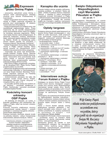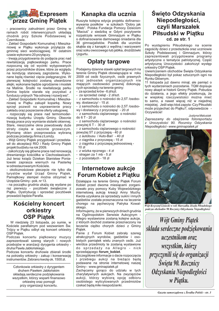 Expresem przez Gminê Pi¹tek - pracownicy zatrudnieni przez Gminê w ramach robót interwencyjnych uk³adaj¹ chodnik przy Szkole Podstawowej w Czernikowie. - Zak³ad Gospodarki Komunalnej i Mieszkaniowej w Pi¹tku wykonuje przy³¹cza do gminnej sieci wodoci¹gowej. W ostatnim czasie wykonano 20 przy³¹czy. - trwaj¹ przygotowania do podjêcia prac nad rewitalizacj¹ pi¹tkowskiego parku. Prace rozpoczn¹ siê od wycinki wytypowanych przez przyrodników drzew, które ze wzglêdu na kondycjê stanowi¹ zagro¿enie. Wykonane bêd¹ równie¿ ciêcia pielêgnacyjne. W pierwszej kolejnoœci zostan¹ utwardzone alejki, wykonane bêdzie ogrodzenie i mostek na Malinie. Œrodki na rewitalizacjê parku Gmina bêdzie stara³a siê pozyskaæ z funduszy unijnych “Na odnowê i rozwój wsi”. - Zak³ad Gospodarki Komunalnej i Mieszkaniowej w Pi¹tku zakupi³ koparkê. Nowy sprzêt pozwoli na usprawnienie pracy zak³adu oraz poszerzenie oferty us³ugowej. - rozpoczê³y siê prace nad termomodernizacj¹ budynku Urzêdu Gminy. Obecnie trwaj¹ prace przy wymianie stolarki okiennej. Stare, nieszczelne okna powodowa³y du¿e straty ciep³a w sezonie grzewczym. Wymianê okien przeprowadza wybran¹ podczas przetargu firma z £om¿y. - Wójt Gminy Pi¹tek przygotowa³ i przedstawi³ do akceptacji RIO i Rady Gminy Pi¹tek projekt bud¿etu na rok 2009. - zakoñczy³y siê g³ówne prace nad renowacj¹ drewnianego koœció³ka w Ciechos³awicach. Ju¿ teraz ksi¹dz Dziekan Stanis³aw Poniatowski zaprasza wiernych na Pasterkê w odrestaurowanym Koœciele. - okolicznoœciowe pieczêcie nie tylko dla turystów wyda³ Urz¹d Gminy Pi¹tek. Pami¹tkowy stempel mo¿na otrzymaæ w Urzêdzie Gminy - pok. nr 13. - na pocz¹tku grudnia uka¿¹ siê wydane po raz pierwszy - pocztówki œwi¹teczne z Pi¹tku. Dystrybucjê i sprzeda¿ pocztówek prowadziæ bêdzie Parafia. Koœcielny koncert orkiestry OSP Pi¹tek W niedzielê 23 listopada, po sumie, w Koœciele parafialnym pod wezwaniem Œw. Trójcy w Pi¹tku odby³ siê koncert orkiestry OSP Pi¹tek. Podczas koncertu pi¹tkowscy muzycy zaprezentowali szereg starych i nowych przebojów w aran¿acji dyrygenta orkiestry druha Paw³a Jab³oñskiego. Podczas koncertu druhowie zbierali œrodki na potrzeby orkiestry - zakup i konserwacjê instrumentów. Zebrano kwotê ok. 1500 z³. ---------------------------------------------------------Cz³onkowie orkiestry z dyrygentem druhem Paw³em Jab³oñskim sk³adaj¹ serdeczne podziêkowania wszystkim, którzy wsparli finansowo orkiestrê oraz pomogli przy organizacji koncertu. Kanapka dla ucznia Ruszy³a kolejna edycja projektu dofinansowywania posi³ków w szko³ach “Dobry jak chleb”. Polska Fundacja Pomocy Dzieciom “Maciuœ” z siedzib¹ w Gdyni pozytywnie rozpatrzy³a wniosek Gimnazjum w Pi¹tku o dofinansowanie darmowego œniadania dla 36 gimnazjalistów. Posi³ek dla uczniów sk¹³da siê z kanapki z wêdlin¹ i warzywami oraz soku owocowego lub jab³ka, dro¿d¿ówki i jogurtu. Op³aty targowe Podajemy dzienne stawki op³at targowych na terenie Gminy Pi¹tek obowi¹zuj¹ce w roku 2009 od osób fizycznych, osób prawnych oraz jednostek organizacyjnych nie maj¹cych osobowoœci prawnej dokonuj¹cych sprzeda¿y na terenie gminy: - za sprzeda¿ krów - 6 z³/szt. - za sprzeda¿ ciel¹t - 2 z³/szt. - z samochodu o noœnoœci do 2,5T /osobowy, dostawczy/ - 15 z³. - z samochodu o noœnoœci do 2,5T /osobowy i dostawczy z przyczep¹/ - 20 z³ - z samochodu ciê¿arowego o noœnoœci do 6 T - 20 z³ - z samochodu ciê¿arowego o noœnoœci powy¿ej 6 T - 30 z³ - z samochodu ciê¿arowego o noœnoœci powy¿ej 5T z przyczep¹ - 40 z³ - z autobusu / Auto-Bar/ - 40 z³ - z ci¹gnika z przyczep¹ - 15 z³ - z ci¹gnika z przyczep¹ jednoosiow¹ 10 z³ - z wózka rêcznego - 4 z³ - stragan za 1 mb - 5 z³ - z pozosta³ych - 18 z³ Œwiêto Odzyskania Niepodleg³oœci, czyli Marsza³ek Pi³sudski w Pi¹tku cd. ze str. 1 Po wyst¹pieniu Pi³sudskiego na scenie zagoœci³y dzieci z przedszkola oraz uczniowie Szko³y Podstawowej i Gimnazjum, którzy zaprezentowali przygotowane programy artystyczne o tematyce patriotycznej. Czêœæ artystyczn¹ Uroczystoœci zakoñczy³ wystêp orkiestry OSP Pi¹tek. Uwieñczeniem obchodów Œwiêta Odzyskania Niepodleg³oœci by³ pokaz sztucznych ogni na Rynku G³ównym. 11 listopada ju¿ dawno min¹³, ale pamiêæ o tych wydarzeniach pozostanie. TQM dopisuje nowy akapit w historii Gminy Pi¹tek. Pobudza do dzia³ania, a jego efekty przekonuj¹, ¿e w wiejskiej rzeczywistoœci mo¿na mieæ to samo, a nawet wiêcej ni¿ w niejednej miejskiej. Jeœli wiêc ktoœ zapyta -Czy Pi³sudski mo¿e przyjechaæ do Pi¹tku?, odpowiedzcie Oczywiœcie! Justyna Matusiak Zapraszamy do obejrzenia fotoreporta¿u z Uroczystoœci 90. Rocznicy Odzyskania Niepodleg³oœci - www.gminapiatek.pl Internetowe aukcje Forum Kobiet z Pi¹tku Dzia³aj¹ce na terenie Gminy Pi¹tek Forum Kobiet przed dwoma miesi¹cami zorganizowa³o przy pomocy Kuby Wojewódzkiego internetow¹ aukcjê kreacji Anny Muchy. Kwota uzyskana ze sprzeda¿y sukni i innych gad¿etów zosta³a przeznaczona na leczenie chorego na pêcherzycê Patryka Kowalskiego. Informujemy, ¿e w pierwszych dniach grudnia na Ogólnopolskim Serwisie Aukcyjnym Allegro wystawione zostan¹ kolejne aukcje, z których dochód zostanie przeznaczony na leczenie ciê¿ko chorych dzieci z Gminy Pi¹tek. Panie z Forum Kobiet zebra³y szereg atrakcyjnych wyrobów, gad¿etów i osobistych pami¹tek wielu znanych osób. Ju¿ wkrótce przedmioty te zostan¹ wystawione do sprzeda¿y na Allegro - nick sprzedaj¹cego: forum_kobiet. Szczegó³owe informacje o dacie rozpoczêcia i przebiegu aukcji na bie¿¹co bêd¹ podawane na stronie internetowej naszej Gminy - www.gminapiatek.pl Zachêcamy gor¹co do udzia³u w tych charytatywnych aukcjach. Na zwyciêzców aukcji, którzy wybior¹ opcjê odbioru osobistego wylicytowanych przedmiotów czekaæ bêd¹ mi³e niespodzianki. Wójt Krzyszto