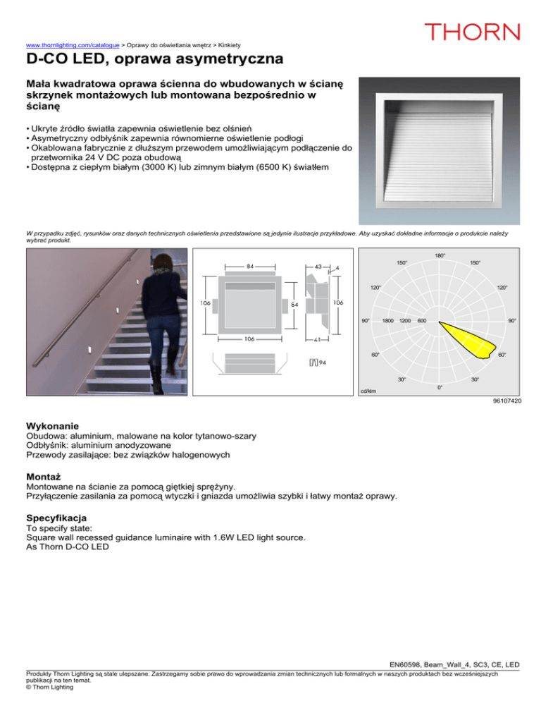 www.thornlighting.com/catalogue > Oprawy do oświetlania wnętrz > Kinkiety D-CO LED, oprawa asymetryczna Mała kwadratowa oprawa ścienna do wbudowanych w ścianę skrzynek montażowych lub montowana bezpośrednio w ścianę • Ukryte źródło światła zapewnia oświetlenie bez olśnień • Asymetryczny odbłyśnik zapewnia równomierne oświetlenie podłogi • Okablowana fabrycznie z dłuższym przewodem umożliwiającym podłączenie do przetwornika 24 V DC poza obudową • Dostępna z ciepłym białym (3000 K) lub zimnym białym (6500 K) światłem W przypadku zdjęć, rysunków oraz danych technicznych oświetlenia przedstawione są jedynie ilustracje przykładowe. Aby uzyskać dokładne informacje o produkcie należy wybrać produkt. 180° 150° 150° 120° 90° 120° 1800 1200 600 90° 60° 60° 30° 30° 0° cd/klm 96107420 Wykonanie Obudowa: aluminium, malowane na kolor tytanowo-szary Odbłyśnik: aluminium anodyzowane Przewody zasilające: bez związków halogenowych Montaż Montowane na ścianie za pomocą giętkiej sprężyny. Przyłączenie zasilania za pomocą wtyczki i gniazda umożliwia szybki i łatwy montaż oprawy. Specyfikacja To specify state: Square wall recessed guidance luminaire with 1.6W LED light source. As Thorn D-CO LED EN60598, Beam_Wall_4, SC3, CE, LED Produkty Thorn Lighting są stale ulepszane. Zastrzegamy sobie prawo do wprowadzania zmian technicznych lub formalnych w naszych produktach bez wcześniejszych publikacji na ten temat. © Thorn Lighting