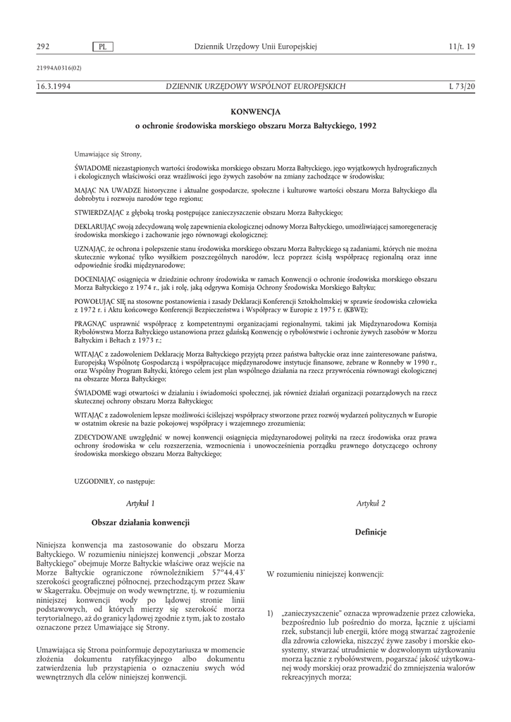 292 Dziennik Urzędowy Unii Europejskiej 11/t. 19 DZIENNIK URZĘDOWY WSPÓLNOT EUROPEJSKICH L 73/20 PL 21994A0316(02) 16.3.1994 KONWENCJA o ochronie środowiska morskiego obszaru Morza Bałtyckiego, 1992 Umawiające się Strony, ŚWIADOME niezastąpionych wartości środowiska morskiego obszaru Morza Bałtyckiego, jego wyjątkowych hydrograficznych i ekologicznych właściwości oraz wrażliwości jego żywych zasobów na zmiany zachodzące w środowisku; MAJĄC NA UWADZE historyczne i aktualne gospodarcze, społeczne i kulturowe wartości obszaru Morza Bałtyckiego dla dobrobytu i rozwoju narodów tego regionu; STWIERDZAJĄC z głęboką troską postępujące zanieczyszczenie obszaru Morza Bałtyckiego; DEKLARUJĄC swoją zdecydowaną wolę zapewnienia ekologicznej odnowy Morza Bałtyckiego, umożliwiającej samoregenerację środowiska morskiego i zachowanie jego równowagi ekologicznej; UZNAJĄC, że ochrona i polepszenie stanu środowiska morskiego obszaru Morza Bałtyckiego są zadaniami, których nie można skutecznie wykonać tylko wysiłkiem poszczególnych narodów, lecz poprzez ścisłą współpracę regionalną oraz inne odpowiednie środki międzynarodowe; DOCENIAJĄC osiągnięcia w dziedzinie ochrony środowiska w ramach Konwencji o ochronie środowiska morskiego obszaru Morza Bałtyckiego z 1974 r., jak i rolę, jaką odgrywa Komisja Ochrony Środowiska Morskiego Bałtyku; POWOŁUJĄC SIĘ na stosowne postanowienia i zasady Deklaracji Konferencji Sztokholmskiej w sprawie środowiska człowieka z 1972 r. i Aktu końcowego Konferencji Bezpieczeństwa i Współpracy w Europie z 1975 r. (KBWE); PRAGNĄC usprawnić współpracę z kompetentnymi organizacjami regionalnymi, takimi jak Międzynarodowa Komisja Rybołówstwa Morza Bałtyckiego ustanowiona przez gdańską Konwencję o rybołówstwie i ochronie żywych zasobów w Morzu Bałtyckim i Bełtach z 1973 r.; WITAJĄC z zadowoleniem Deklarację Morza Bałtyckiego przyjętą przez państwa bałtyckie oraz inne zainteresowane państwa, Europejską Wspólnotę Gospodarczą i współpracujące międzynarodowe instytucje finansowe, zebrane w Ronneby w 1990 r., oraz Wspólny Program Bałtycki, którego celem jest plan wspólnego działania na rzecz przywrócenia równowagi ekologicznej na obszarze Morza Bałtyckiego; ŚWIADOME wagi otwartości w działaniu i świadomości społecznej, jak również działań organizacji pozarządowych na rzecz skutecznej ochrony obszaru Morza Bałtyckiego; WITAJĄC z zadowoleniem lepsze możliwości ściślejszej współpracy stworzone przez rozwój wydarzeń politycznych w Europie w ostatnim okresie na bazie pokojowej współpracy i wzajemnego zrozumienia; ZDECYDOWANE uwzględnić w nowej konwencji osiągnięcia międzynarodowej polityki na rzecz środowiska oraz prawa ochrony środowiska w celu rozszerzenia, wzmocnienia i unowocześnienia porządku prawnego dotyczącego ochrony środowiska morskiego obszaru Morza Bałtyckiego; UZGODNIŁY, co następuje: Artykuł 2 Artykuł 1 Obszar działania konwencji Definicje Niniejsza konwencja ma zastosowanie do obszaru Morza Bałtyckiego. W rozumieniu niniejszej konwencji „obszar Morza Bałtyckiego” obejmuje Morze Bałtyckie właściwe oraz wejście na Morze Bałtyckie ograniczone równoleżnikiem 57o44,43’ szerokości geograficznej północnej, przechodzącym przez Skaw w Skagerraku. Obejmuje on wody wewnętrzne, tj. w rozumieniu niniejszej konwencji wody po lądowej stronie linii podstawowych, od których mierzy się szerokość morza terytorialnego, aż do granicy lądowej zgodnie z tym, jak to zostało oznaczone przez Umawiające się Strony. Umawiająca się Strona poinformuje depozytariusza w momencie złożenia dokumentu ratyfikacyjnego albo dokumentu zatwierdzenia lub przystąpienia o oznaczeniu swych wód wewnętrznych dla celów niniejszej konwencji. W rozumieniu niniejszej konwencji: 1) „zanieczyszczenie” oznacza wprowadzenie przez człowieka, bezpośrednio lub pośrednio do morza, łącznie z ujściami rzek, substancji lub energii, które mogą stwarzać zagrożenie dla zdrowia człowieka, niszczyć żywe zasoby i morskie ekosystemy, stwarzać utrudnienie w dozwolonym użytkowaniu morza łącznie z rybołówstwem, pogarszać jakość użytkowanej wody morskiej oraz prowadzić do zmniejszenia walorów rekreacyjnych morza; 11/t. 19 2) PL Dziennik Urzędowy Unii Europejskiej „zanieczyszczenie ze źródeł lądowych” oznacza zanieczyszczenie morza przez wszystkie punktowe lub rozproszone źródła lądowe wprowadzone drogą wodną, powietrzną lub bezpośrednio z wybrzeża. Obejmuje ono zanieczyszczenie pochodzące z jakiegokolwiek rozmyślnego usunięcia dokonanego pod dnem morskim w miejscu posiadającym dostęp z wybrzeża przez tunel, rurociąg lub w inny sposób; 3) „statek” oznacza statek jakiegokolwiek typu pływający w środowisku morskim i obejmuje wodoloty, poduszkowce, statki podwodne, jednostki pływające oraz platformy nieruchome lub pływające; 4) a) „zatapianie” oznacza: i) każde rozmyślne usunięcie do morza lub na dno morskie odpadów lub innych materiałów ze statków, z innych wykonanych przez człowieka konstrukcji na morzu albo ze statków powietrznych; ii) każde rozmyślne usunięcie do morza statków lub innych wykonanych przez człowieka konstrukcji na morzu albo statków powietrznych; 293 7) „substancja szkodliwa” oznacza każdą substancję, która wprowadzona do morza powoduje zanieczyszczenie; 8) „substancja niebezpieczna” oznacza każdą substancję szkodliwą, która w wyniku swych specyficznych właściwości jest trwała, toksyczna lub która się biologicznie akumuluje; 9) „przypadek zanieczyszczenia” oznacza zdarzenie lub szereg zdarzeń o wspólnej genezie, które powodują lub mogą powodować wylanie się oleju lub innych szkodliwych substancji i które stwarzają lub mogą stworzyć zagrożenie dla środowiska morskiego Morza Bałtyckiego lub linii brzegowej albo dla int