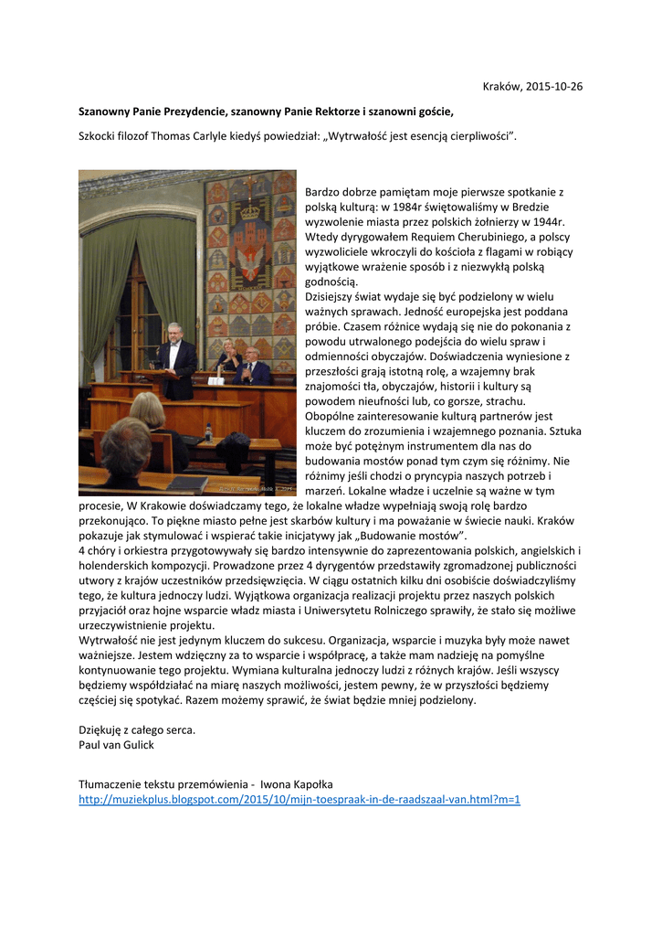 Kraków, 2015-10-26 Szanowny Panie Prezydencie, szanowny Panie Rektorze i szanowni goście, Szkocki filozof Thomas Carlyle kiedyś powiedział: „Wytrwałość jest esencją cierpliwości”. Bardzo dobrze pamiętam moje pierwsze spotkanie z polską kulturą: w 1984r świętowaliśmy w Bredzie wyzwolenie miasta przez polskich żołnierzy w 1944r. Wtedy dyrygowałem Requiem Cherubiniego, a polscy wyzwoliciele wkroczyli do kościoła z flagami w robiący wyjątkowe wrażenie sposób i z niezwykłą polską godnością. Dzisiejszy świat wydaje się być podzielony w wielu ważnych sprawach. Jedność europejska jest poddana próbie. Czasem różnice wydają się nie do pokonania z powodu utrwalonego podejścia do wielu spraw i odmienności obyczajów. Doświadczenia wyniesione z przeszłości grają istotną rolę, a wzajemny brak znajomości tła, obyczajów, historii i kultury są powodem nieufności lub, co gorsze, strachu. Obopólne zainteresowanie kulturą partnerów jest kluczem do zrozumienia i wzajemnego poznania. Sztuka może być potężnym instrumentem dla nas do budowania mostów ponad tym czym się różnimy. Nie różnimy jeśli chodzi o pryncypia naszych potrzeb i marzeń. Lokalne władze i uczelnie są ważne w tym procesie, W Krakowie doświadczamy tego, że lokalne władze wypełniają swoją rolę bardzo przekonująco. To piękne miasto pełne jest skarbów kultury i ma poważanie w świecie nauki. Kraków pokazuje jak stymulować i wspierać takie inicjatywy jak „Budowanie mostów”. 4 chóry i orkiestra przygotowywały się bardzo intensywnie do zaprezentowania polskich, angielskich i holenderskich kompozycji. Prowadzone przez 4 dyrygentów przedstawiły zgromadzonej publiczności utwory z krajów uczestników przedsięwzięcia. W ciągu ostatnich kilku dni osobiście doświadczyliśmy tego, że kultura jednoczy ludzi. Wyjątkowa organizacja realizacji projektu przez naszych polskich przyjaciół oraz hojne wsparcie władz miasta i Uniwersytetu Rolniczego sprawiły, że stało się możliwe urzeczywistnienie projektu. Wytrwałość nie jest jedynym kluczem do sukcesu. Organizacja, wsparcie i muzyka były może nawet ważniejsze. Jestem wdzięczny za to wsparcie i współpracę, a także mam nadzieję na pomyślne kontynuowanie tego projektu. Wymiana kulturalna jednoczy ludzi z różnych krajów. Jeśli wszyscy będziemy współdziałać na miarę naszych możliwości, jestem pewny, że w przyszłości będziemy częściej się spotykać. Razem możemy sprawić, że świat będzie mniej podzielony. Dziękuję z całego serca. Paul van Gulick Tłumaczenie tekstu przemówienia - Iwona Kapołka http://muziekplus.blogspot.com/2015/10/mijn-toespraak-in-de-raadszaal-van.html?m=1