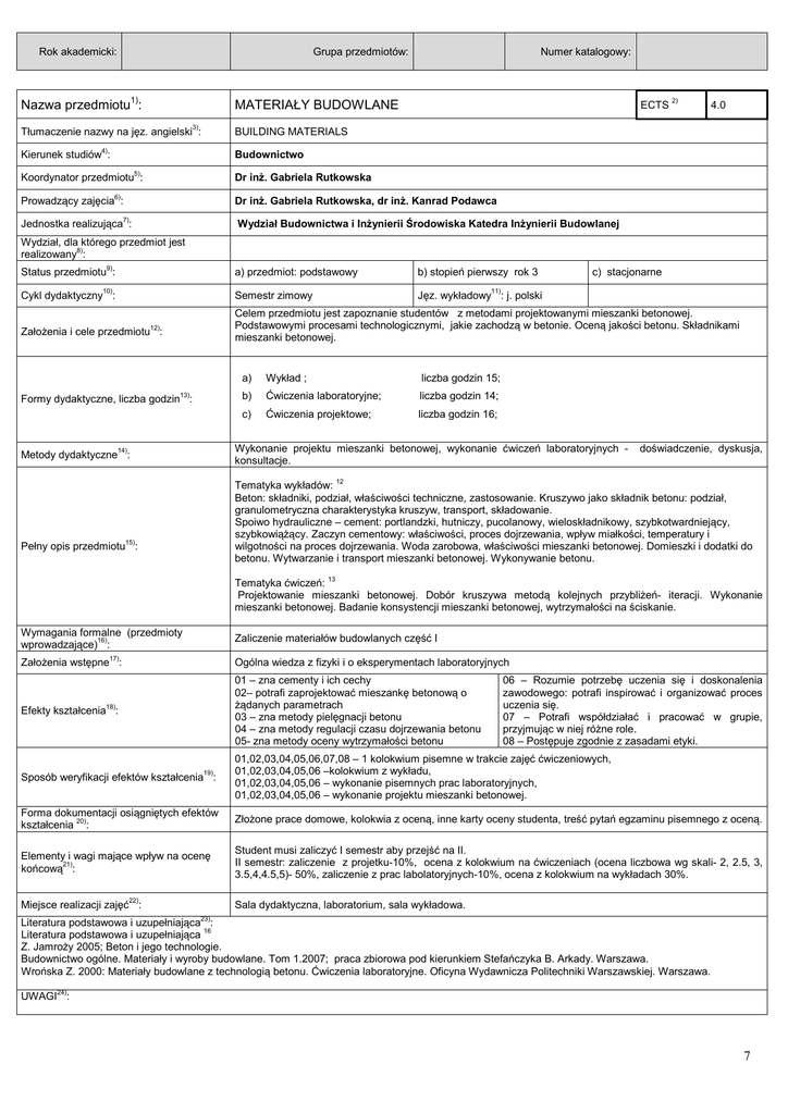 Rok akademicki: Grupa przedmiotów: 1) Nazwa przedmiotu : MATERIAŁY BUDOWLANE Tłumaczenie nazwy na jęz. angielski3): BUILDING MATERIALS 4) Numer katalogowy: ECTS 2) 4.0 Budownictwo Kierunek studiów : Koordynator przedmiotu5): Dr inż. Gabriela Rutkowska 6) Prowadzący zajęcia : Dr inż. Gabriela Rutkowska, dr inż. Kanrad Podawca Jednostka realizująca7): Wydział Budownictwa i Inżynierii Środowiska Katedra Inżynierii Budowlanej Wydział, dla którego przedmiot jest realizowany8): Status przedmiotu9): a) przedmiot: podstawowy 10) b) stopień pierwszy rok 3 c) stacjonarne 11) Cykl dydaktyczny : Semestr zimowy Założenia i cele przedmiotu12): Celem przedmiotu jest zapoznanie studentów z metodami projektowanymi mieszanki betonowej. Podstawowymi procesami technologicznymi, jakie zachodzą w betonie. Oceną jakości betonu. Składnikami mieszanki betonowej. 13) Formy dydaktyczne, liczba godzin : Jęz. wykładowy : j. polski a) Wykład ; liczba godzin 15; b) Ćwiczenia laboratoryjne; liczba godzin 14; c) Ćwiczenia projektowe; liczba godzin 16; Wykonanie projektu mieszanki betonowej, wykonanie ćwiczeń laboratoryjnych konsultacje. Metody dydaktyczne14): doświadczenie, dyskusja, Tematyka wykładów: 12 Beton: składniki, podział, właściwości techniczne, zastosowanie. Kruszywo jako składnik betonu: podział, granulometryczna charakterystyka kruszyw, transport, składowanie. Spoiwo hydrauliczne – cement: portlandzki, hutniczy, pucolanowy, wieloskładnikowy, szybkotwardniejący, szybkowiążący. Zaczyn cementowy: właściwości, proces dojrzewania, wpływ miałkości, temperatury i wilgotności na proces dojrzewania. Woda zarobowa, właściwości mieszanki betonowej. Domieszki i dodatki do betonu. Wytwarzanie i transport mieszanki betonowej. Wykonywanie betonu. Pełny opis przedmiotu15): Tematyka ćwiczeń: 13 Projektowanie mieszanki betonowej. Dobór kruszywa metodą kolejnych przybliżeń- iteracji. Wykonanie mieszanki betonowej. Badanie konsystencji mieszanki betonowej, wytrzymałości na ściskanie. Wymagania formalne (przedmioty wprowadzające)16): Zaliczenie materiałów budowlanych część I 17) Założenia wstępne : Ogólna wiedza z fizyki i o eksperymentach laboratoryjnych Efekty kształcenia18): 01 – zna cementy i ich cechy 02– potrafi zaprojektować mieszankę betonową o żądanych parametrach 03 – zna metody pielęgnacji betonu 04 – zna metody regulacji czasu dojrzewania betonu 05- zna metody oceny wytrzymałości betonu Sposób weryfikacji efektów kształcenia19): 01,02,03,04,05,06,07,08 – 1 kolokwium pisemne w trakcie zajęć ćwiczeniowych, 01,02,03,04,05,06 –kolokwium z wykładu, 01,02,03,04,05,06 – wykonanie pisemnych prac laboratoryjnych, 01,02,03,04,05,06 – wykonanie projektu mieszanki betonowej. Forma dokumentacji osiągniętych efektów kształcenia 20): Złożone prace domowe, kolokwia z oceną, inne karty oceny studenta, treść pytań egzaminu pisemnego z oceną. Elementy i wagi mające wpływ na ocenę końcową21): Student musi zaliczyć I semestr aby przejść na II. II semestr: zaliczenie z projetku-10%, ocena z kolokwium na ćwiczeniach (ocena liczbowa wg skali- 2, 2.5, 3, 3.5,4,4.5,5)- 50%, zaliczenie z prac labolatoryjnych-10%, ocena z kolokwium na wykładach 30%. Miejsce realizacji zajęć22): Sala dydaktyczna, laboratorium, sala wykładowa. 06 – Rozumie potrzebę uczenia się i doskonalenia zawodowego: potrafi inspirować i organizować proces uczenia się. 07 – Potrafi współdziałać i pracować w grupie, przyjmując w niej różne role. 08 – Postępuje zgodnie z zasadami etyki. 23) Literatura podstawowa i uzupełniająca : Literatura podstawowa i uzupełniająca 16 Z. Jamroży 2005; Beton i jego technologie. Budownictwo ogólne. Materiały i wyroby budowlane. Tom 1.2007; praca zbiorowa pod kierunkiem Stefańczyka B. Arkady. Warszawa. Wrońska Z. 2000: Materiały budowlane z technologią betonu. Ćwiczenia laboratoryjne. Oficyna Wydawnicza Politechniki Warszawskiej. Warszawa. UWAGI24): 7 Wskaźniki ilościowe charakteryzujące moduł/przedmiot25) : Szacunkowa sumaryczna liczba godzin pracy studenta (kontaktowych i pracy własnej) niezbędna dla osiągnięcia zakładanych efektów kształcenia18) - na tej podstawie należy wypełnić pole ECTS2: 93h Łączna liczba punktów ECTS, którą student uzyskuje na zajęciach wymagających bezpośredniego udziału nauczycieli akademickich: 2.5 ECTS Łączna liczba punktów ECTS, którą student uzyskuje w ramach zajęć o charakterze praktycznym, takich jak zajęcia laboratoryjne, projektowe, itp.: 1.5 ECTS Tabela zgodności kierunkowych efektów kształcenia efektami przedmiotu 26) Nr /symbol efektu 01 Wymienione w wierszu efekty kształcenia: Zna cementy i ich cechy K_W09, K_U10 K_K03, Odniesienie do efektów dla programu kształcenia na kierunku K_W09, K_U10 K_K03, 02 Potrafi zaprojektować mieszankę betonową o żądanych parametrach K_W07, K_W09, K_U10, K_U14, K_K03 03 Zna metody pielęgnacji betonu K_W09, K_U10, K_K03 K_W09, K_U10, K_K03 04 Zna metody regulacji czasu dojrzewania betonu K_W09, K_U10 K_K03, K_W09, K_U10 K_K03, 05 Zna metody oceny wytrzymałości betonu K_W09, K_U10 K_K03, 06 K_K01 07 Rozumie potrzebę uczenia się i doskonalenia zawodowego: potrafi inspirować i organizować proces uczenia się. Potrafi współdziałać i pracować w grupie, przyjmując w niej różne role. K_K03 08 Postępuje zgodnie z zasadami etyki. K_K08 8 9