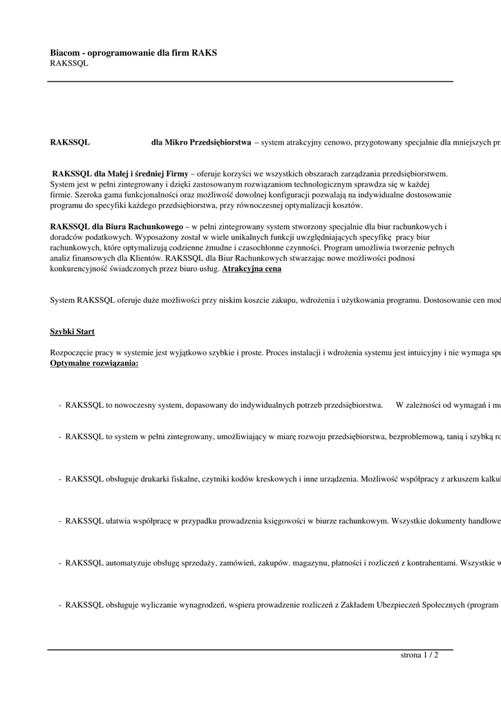 Biacom - oprogramowanie dla firm RAKS RAKSSQL RAKSSQL dla Mikro Przedsiębiorstwa – system atrakcyjny cenowo, przygotowany specjalnie dla mniejszych prz RAKSSQL dla Małej i średniej Firmy – oferuje korzyści we wszystkich obszarach zarządzania przedsiębiorstwem. System jest w pełni zintegrowany i dzięki zastosowanym rozwiązaniom technologicznym sprawdza się w każdej firmie. Szeroka gama funkcjonalności oraz możliwość dowolnej konfiguracji pozwalają na indywidualne dostosowanie programu do specyfiki każdego przedsiębiorstwa, przy równoczesnej optymalizacji kosztów. RAKSSQL dla Biura Rachunkowego – w pełni zintegrowany system stworzony specjalnie dla biur rachunkowych i doradców podatkowych. Wyposażony został w wiele unikalnych funkcji uwzględniających specyfikę pracy biur rachunkowych, które optymalizują codzienne żmudne i czasochłonne czynności. Program umożliwia tworzenie pełnych analiz finansowych dla Klientów. RAKSSQL dla Biur Rachunkowych stwarzając nowe możliwości podnosi konkurencyjność świadczonych przez biuro usług. Atrakcyjna cena System RAKSSQL oferuje duże możliwości przy niskim koszcie zakupu, wdrożenia i użytkowania programu. Dostosowanie cen mod Szybki Start Rozpoczęcie pracy w systemie jest wyjątkowo szybkie i proste. Proces instalacji i wdrożenia systemu jest intuicyjny i nie wymaga spe Optymalne rozwiązania: - RAKSSQL to nowoczesny system, dopasowany do indywidualnych potrzeb przedsiębiorstwa. W zależności od wymagań i mo - RAKSSQL to system w pełni zintegrowany, umożliwiający w miarę rozwoju przedsiębiorstwa, bezproblemową, tanią i szybką ro - RAKSSQL obsługuje drukarki fiskalne, czytniki kodów kreskowych i inne urządzenia. Możliwość współpracy z arkuszem kalkul - RAKSSQL ułatwia współpracę w przypadku prowadzenia księgowości w biurze rachunkowym. Wszystkie dokumenty handlowe - RAKSSQL automatyzuje obsługę sprzedaży, zamówień, zakupów. magazynu, płatności i rozliczeń z kontrahentami. Wszystkie w - RAKSSQL obsługuje wyliczanie wynagrodzeń, wspiera prowadzenie rozliczeń z Zakładem Ubezpieczeń Społecznych (program P strona 1 / 2 Biacom - oprogramowanie dla firm RAKS RAKSSQL Bezpieczeństwo System RAKSSQL jest stabilny i bezpieczny. Specjalnie zaprojektowane funkcje umożliwiaja prostą archiwizację danych oraz łatwą k Dzięki RAKSSQL przedsiębiorca . oszczędza czas i pieniądze strona 2 / 2