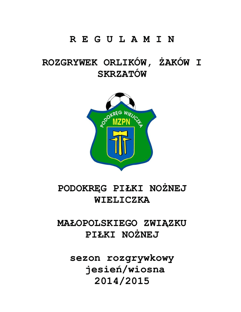 R E G U L A M I N ROZGRYWEK ORLIKÓW, ŻAKÓW I SKRZATÓW PODOKRĘG PIŁKI NOŻNEJ WIELICZKA MAŁOPOLSKIEGO ZWIĄZKU PIŁKI NOŻNEJ sezon rozgrywkowy jesień/wiosna 2014/2015 R O Z D Z I A Ł I. POSTANOWIENIA OGÓLNE §1 Rozgrywki orlików, żaków i skrzatów są rozgrywkami szkoleniowymi. W rozgrywkach mogą brać udział: a. Zgodnie z Ustawą o sporcie z dnia 25.07.2010 roku kluby sportowe posiadające osobowość prawną, będące członkami MZPN. Kluby sportowe mogą posiadać formę stowarzyszenia kultury fizycznej, uczniowskiego klubu sportowego lub spółki akcyjnej. b. inne osoby prawne których statut, umowa albo akt założycielski przewiduje prowadzenie działalności w sporcie w dziedzinie piłka nożna. c. Kluby biorące udział w rozgrywkach są zobowiązane przed ich rozpoczęciem uregulować wszystkie opłaty statutowe (członkowskie, wpisowe) względem MZPN , Okręgu lub Podokręgu. Nieuregulowanie powyższych opłat przez Klub upoważnia Wydział Gier MZPN i Podokręgów prowadzących daną klasę rozgrywkową do nie przyjęcia drużyny tego klubu do rozgrywek. d. Adres: Wielicki Podokręg Małopolskiego Związku Piłki Nożnej 32-020 Wieliczka, pl. Kościuszki 1, tel./fax ( (12) 278-15-81 §2 Rozgrywki prowadzone są przez Komisję Gier /KG/ i Komisję Dyscypliny /KD/ Podokręgu Piłki Nożnej Wieliczka MZPN. Zawody rozgrywa się na podstawie przepisów gry w piłkę nożną i obowiązującego regulaminu rozgrywek oraz na podstawie przepisów wydanych przez Departament Piłkarstwa Młodzieżowego przy Polskim Związku Piłki Nożnej. R O Z D Z I A Ł II. BOISKO §3 1. Spotkania mistrzowskie i szkoleniowe, sparingowe winny być rozgrywane na boiskach trawiastych lub na boiskach ze sztuczną nawierzchnią. 2. W przypadku boisk ze sztuczną nawierzchnią wymagana jest zgoda właściwego organu związkowego na rozgrywanie meczów piłkarskich. 3. Spotkania mistrzowskie i sparingowe mogą być rozgrywane wyłącznie na boisku zweryfikowanym dla danej lub wyższej klasy, wskazanym w licencji udzielonej klubowi na dane dwa sezony rozgrywkowe. 4. Protokół weryfikacji boiska sporządza komisja powołana przez Komisję Gier MZPN lub z upoważnienia właściwy terytorialnie OZPN, na wniosek klubu - przed rozpoczęciem sezonu. 5. Ważność weryfikacji określa się na 2 lata, przy czym okres jej ważności winien być zgodny z okresem ważności licencji, udzielonej klubowi na udział w rozgrywkach danej klasy rozgrywkowej. Weryfikacja obiektu może być wcześniej unieważniona, po stwierdzeniu braków lub nie realizowaniu przez klub zaleceń. Brak ważnej weryfikacji boiska jest podstawą do zawieszenia licencji klubu. 6. W razie niekorzystnych warunków atmosferycznych (ulewne deszcze, zalegający śnieg) 2 7. 8. 9. 10. 11. 12. i uzasadnioną potrzebą oszczędzania nawierzchni boisk trawiastych organ prowadzący rozgrywki może wyrazić zgodę na rozegranie meczu mistrzowskiego na boisku ze sztuczną nawierzchnią, posiadającą ważną weryfikację dla danej bądź niższej klasy rozgrywkowej. Protokół weryfikacji boiska musi być wywieszony w szatni sędziowskiej. Drugi egzemplarz protokołu weryfikacji boiska przechowywany jest w aktach Związku Piłki Nożnej lub właściwego terytorialnie OZPN. Za właściwe przygotowanie boiska do gry odpowiedzialny jest klub, gospodarz zawodów wpisany do terminarza na pierwszym miejscu. Jeżeli sędzia uzna za niezdatne do gry boisko, a klub posiada inną zweryfikowaną do danych rozgrywek płytę boiska, którą sędzia uzna za nadającą się do gry – obowiązany jest udostępnić ją do zawodów. W przypadku nie zastosowania się do tego przepisu sędzia ma obowiązek opisać ten fakt w sprawozdaniu z zawodów. Przedstawiciele obu drużyn mogą ustalić nowy termin rozegrania meczu, jednakże ostateczna decyzja co do weryfikacji wyniku meczu bądź wyznaczenia nowego terminu należy do organu prowadzącego rozgrywki. Klub nie ma obowiązku udostępniać innej płyty boiska przy założeniu, że w danym dniu bądź w dniu następnym na tym boisku są wyznaczone zawody szczebla wyższego lub zawody międzynarodowe. Klub, który nie dopełnił obowiązku właściwego przygotowania boiska i z winy którego zawody nie odbyły się – ponosi konsekwencje regulaminowe w wysokości 100 zł oraz zwrot kosztów przejazdu dla drużyny przeciwnej jeśli zgłosi taki żądanie. R O Z D Z I A Ł III. ZAWODNICY §4 1.W zawodach mistrzowskich mogą brać udział zawodnicy urodzeni i potwierdzeni do klubu w następujących kategoriach wiekowych: orliki żaki skrzaty - od 01.01.2004 - do 31.12.2005 i młodsi - od 01.01.2006 - do 31.12.2007 i młodsi - od 01.01.2008 - do 31.12.2009 i młodsi 2.Zmiana przynależności klubowej zawodników, którzy ukończyli 12 rok życia a nie ukończyły 16 lat może nastąpić w okresie jednego z dwóch okienek transferowych: - od 1 lipca do 30 września - od 1 lutego do dnia rozpoczęcia rozgrywek w rundzie wiosennej, w której występuje klub pozyskujący. 3.Na pisemną prośbę rodzica, który chce przenieść swoje dziecko do innego klubu, klub zwalniający musi w ciągu 14 dni załatwić prośbę. Jeżeli klub nie dotrzyma terminu, na prośbę rodzica (opiekuna) decyzję podejmie KG.PPN Wieliczka MZPN. 4.Zmiana barw klubowych dla zawodników grupy żaków i orlików może być dokonywana dwa razy w roku w sezonie rozgrywkowym (nie obowiązują okienka transferowe). 5.Zawodnicy nowo zgłoszeni, mogą być zgłoszeni i potwierdzeni do klubu poza okienkiem transferowym. 6. Każdy zawodnik musi posiadać pisemną zgodę / oświadczenie / rodzica lub prawnego opiekuna na udział w treningach i zawodach piłkarskich. 7. Zawodnik może być zgłoszony i potwierdzony do klubu jeżeli przedłoży pisemną zgodę rodziców /przedstawicieli ustawowych/ i spełnia warunki wynikające z innych przepisów piłkarskich oraz niniejszych przepisów. 3 8.Zawodnik, który skończy 7 lat i jeden dzień musi być zatwierdz